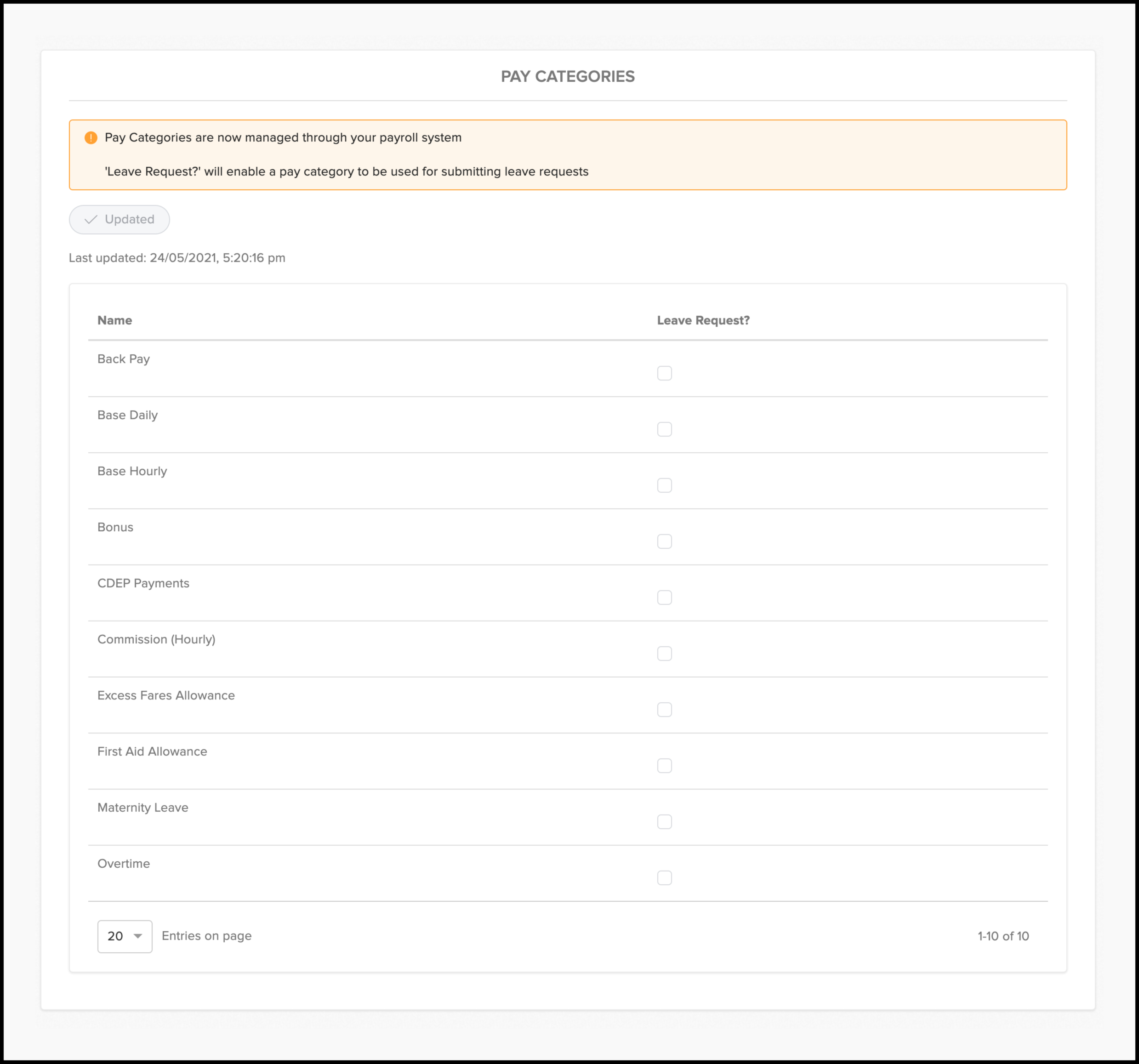 The Pay Categories page will now show a greyed-out Updated button. This means Employment Hero has successfully imported your pay categories from your MYOB Account Right platform.