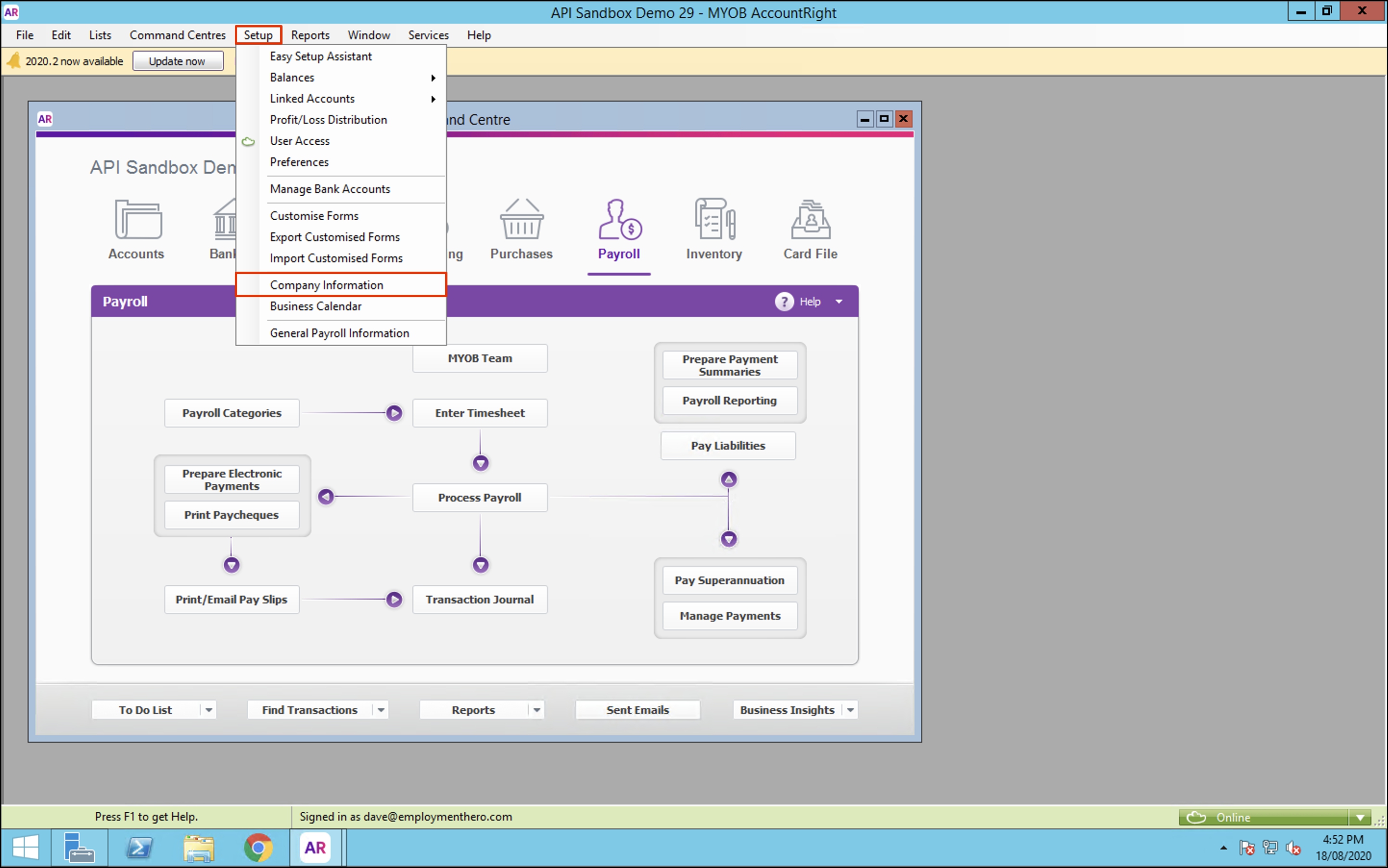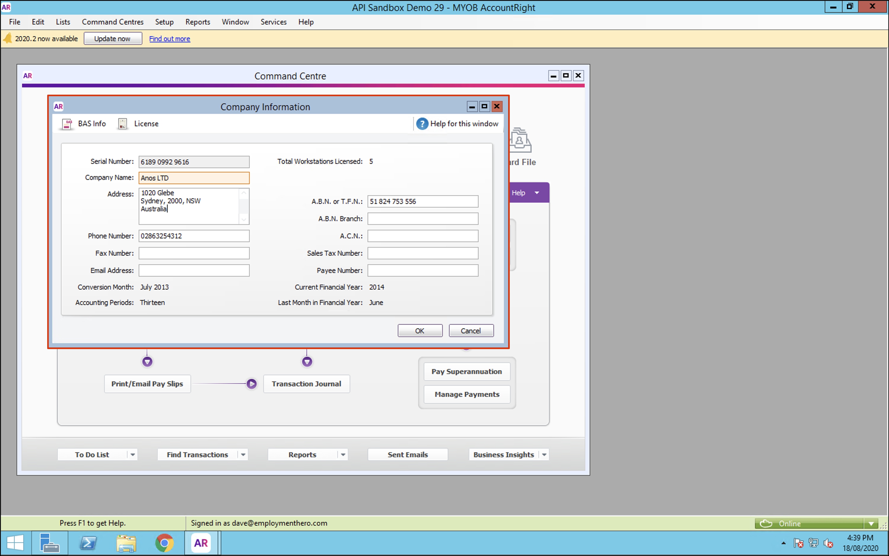 You will now see your company information on your screen. If this data does not match what is in the Employment Hero platform, then you can either change the data in this pop-up and click the OK button or you can change the data in Employment Hero to match what you see on your screen.