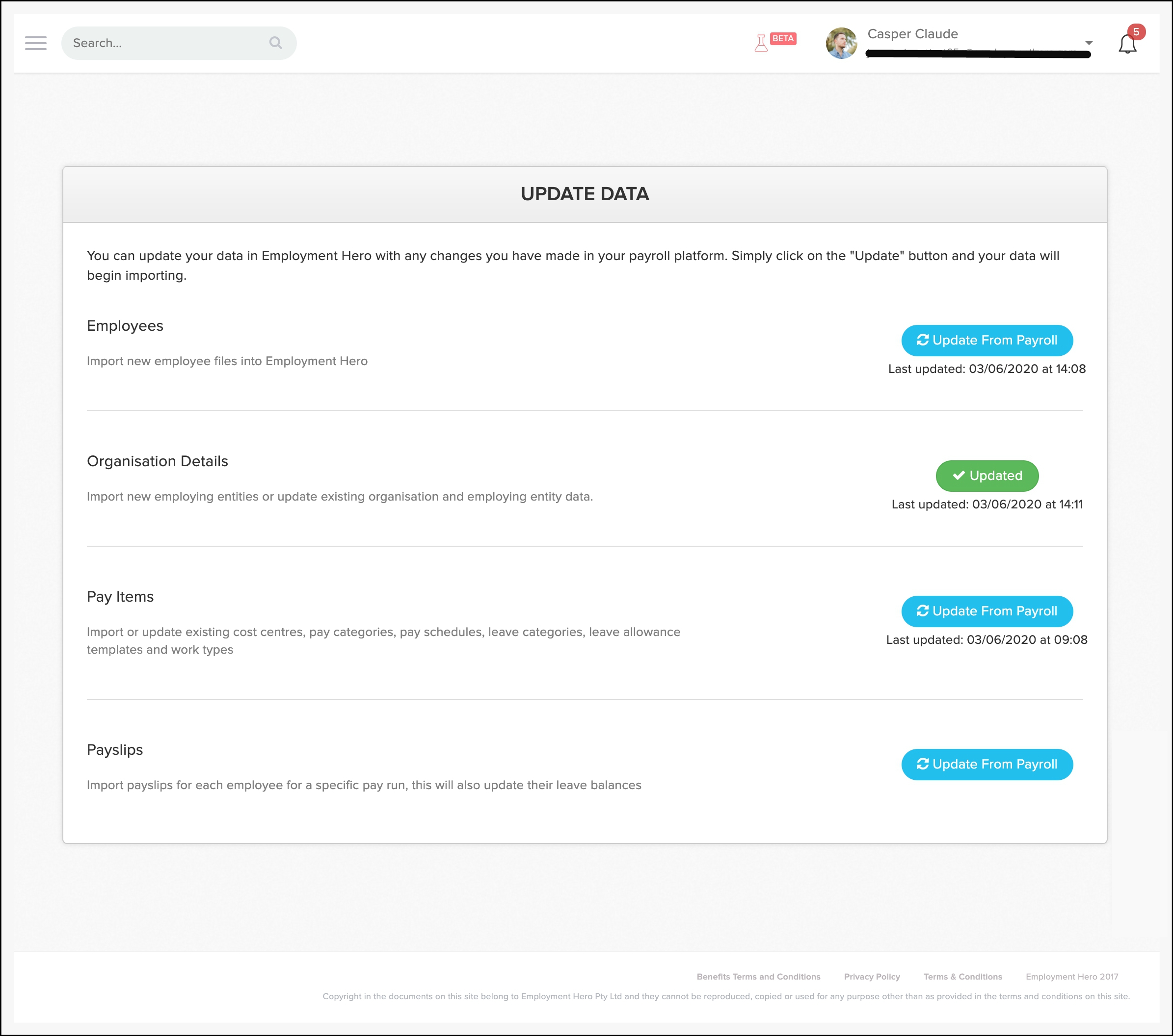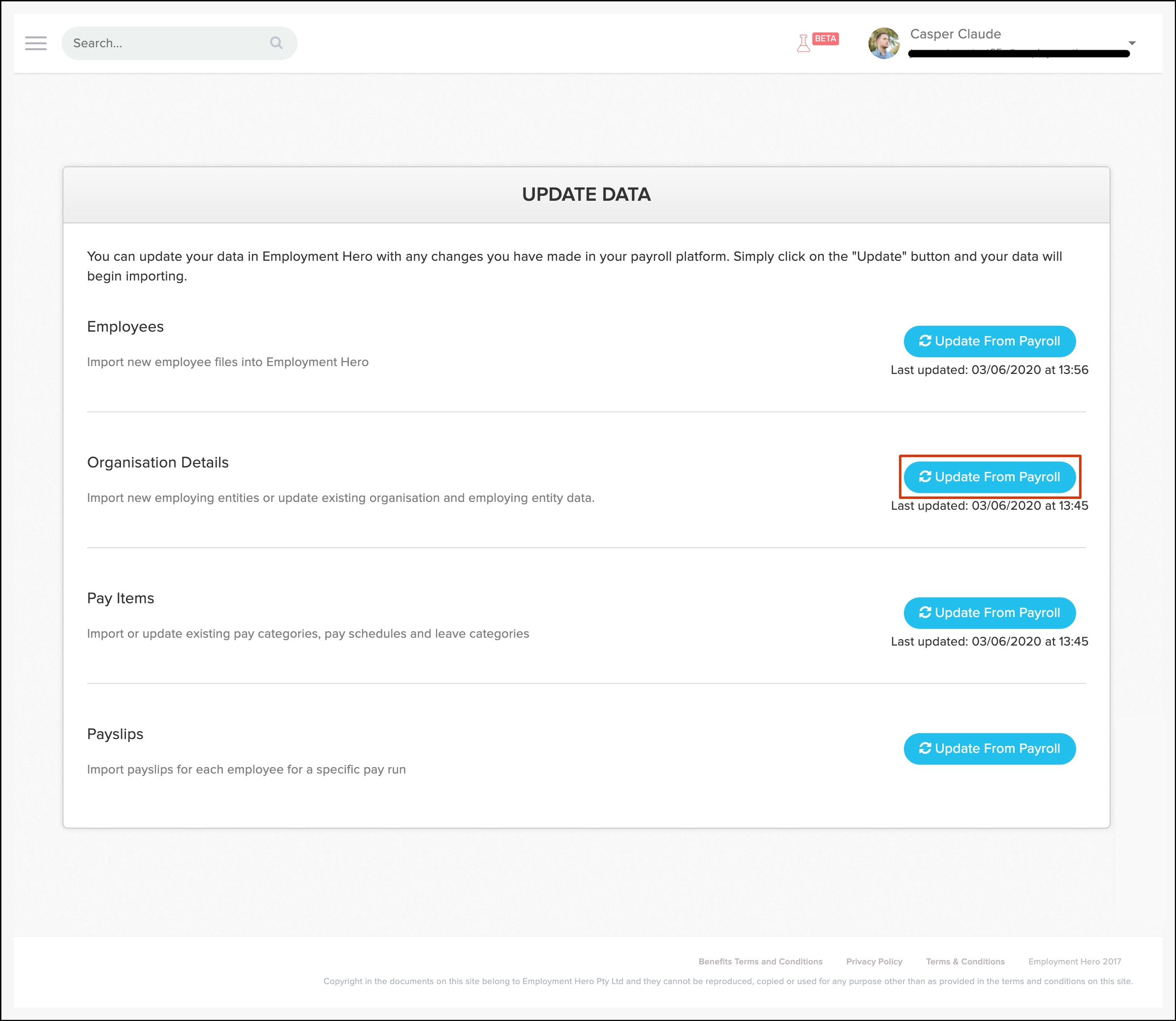 - In the Organisation Details section, click the Update from Payroll button.