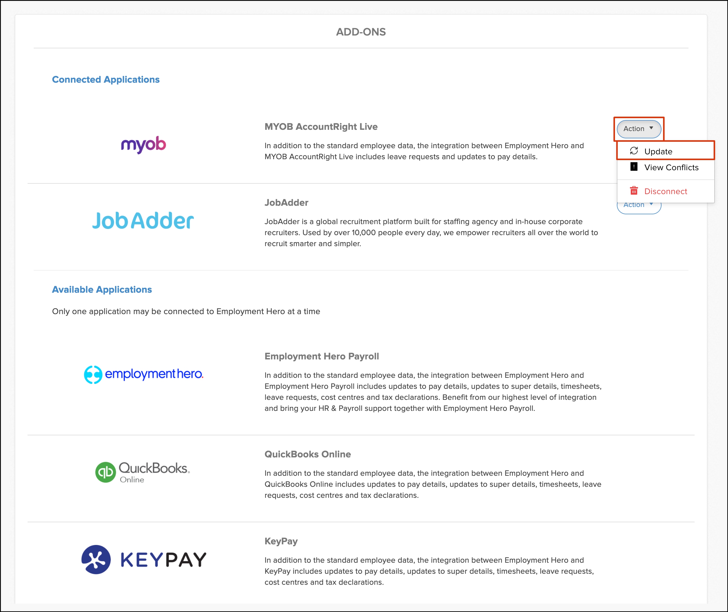 The Employees section will now show a green Updated button. It means Employment Hero has successfully imported your employees from MYOB Account Right.