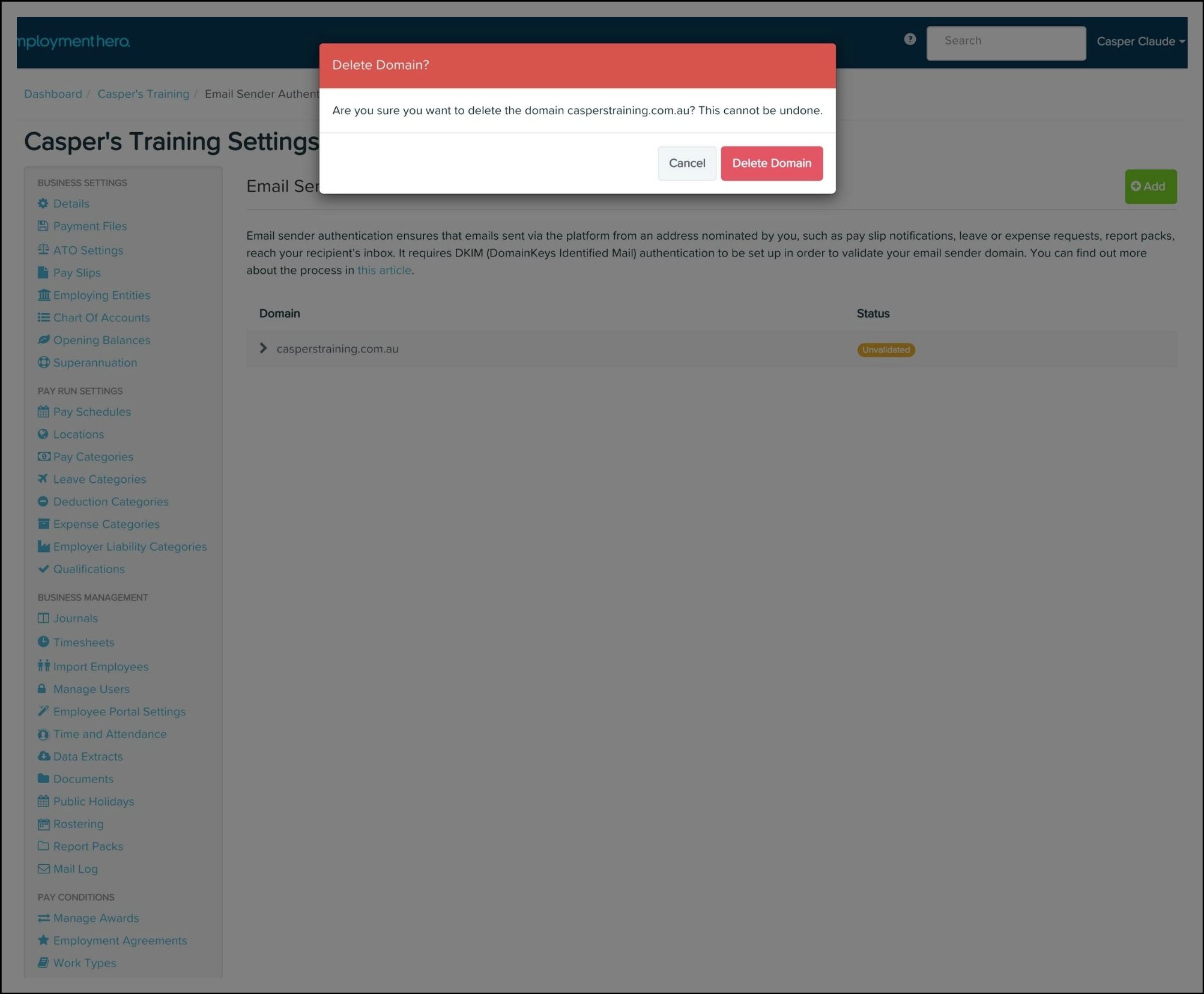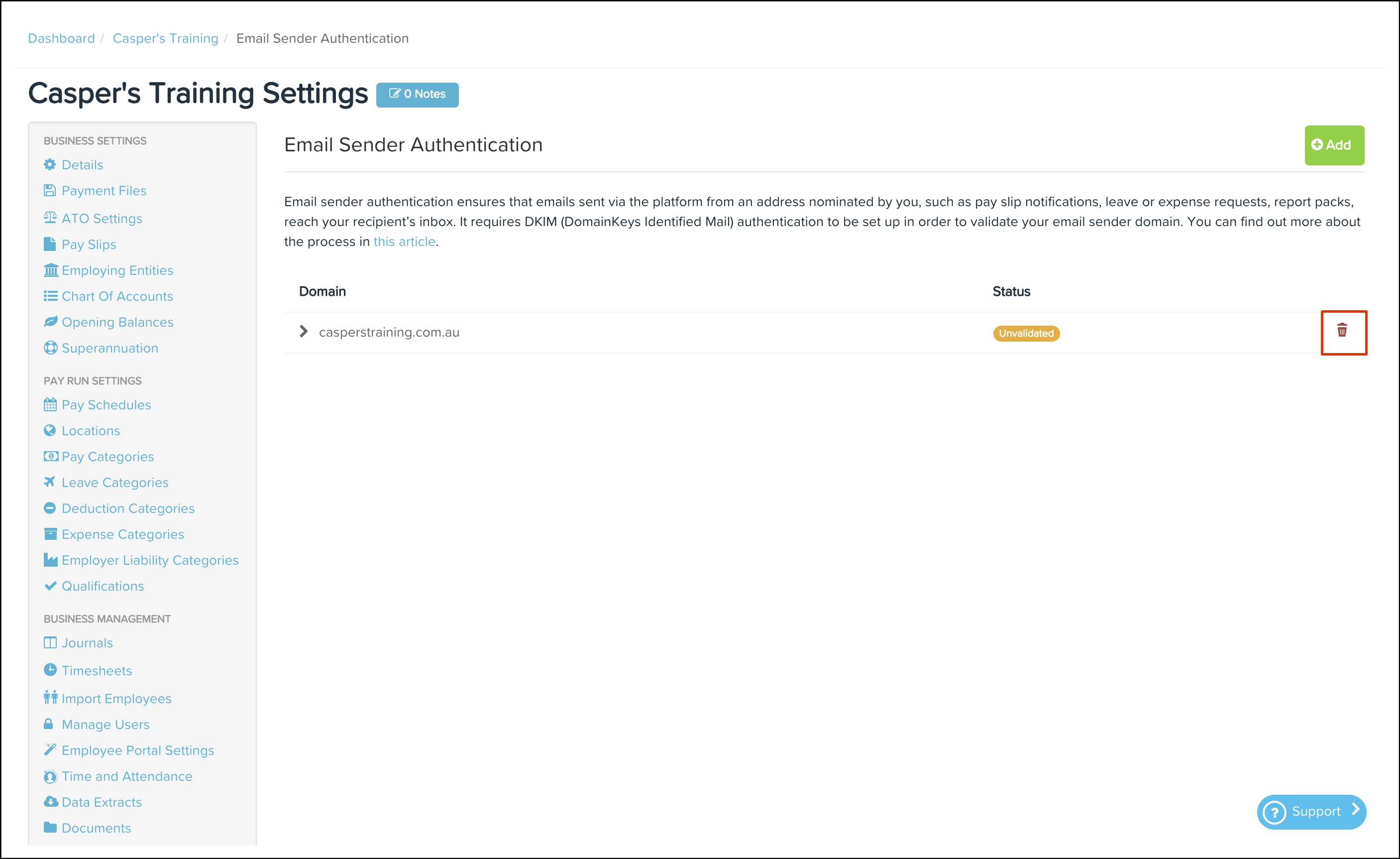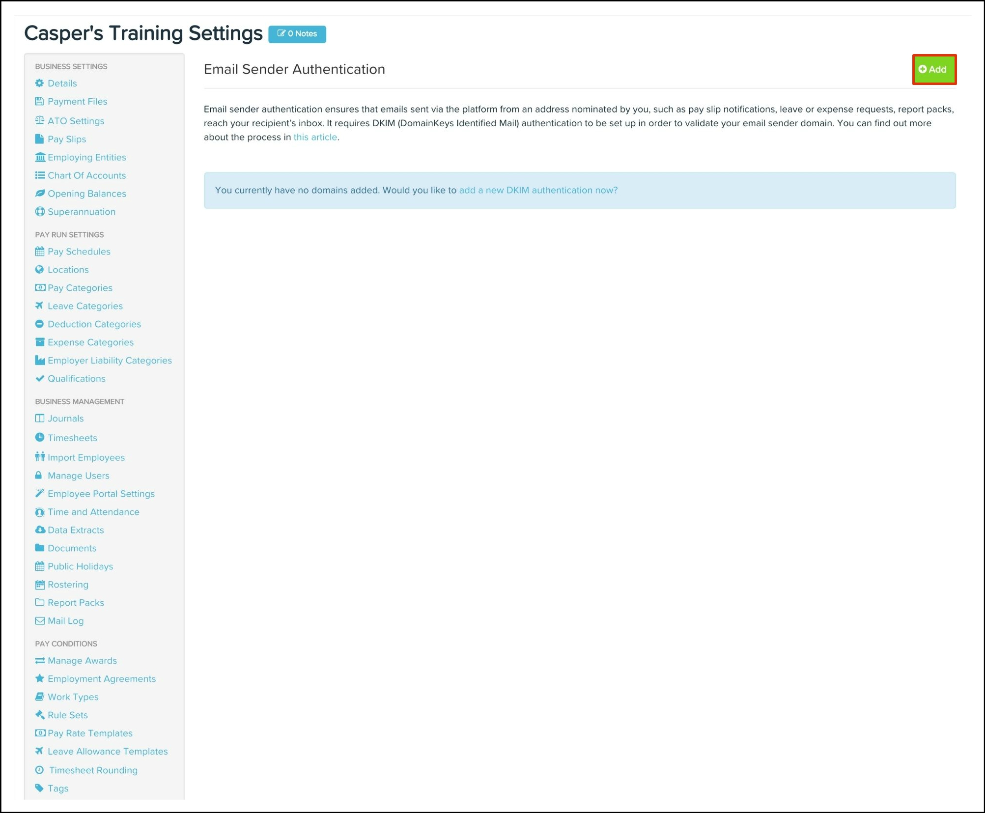 The Payroll classic platform allows you to set up DKIM (Domain Keys Identified Mail) on a domain of your choice for emails sent via the Payroll classic platform. This can be setup from an address nominated by you and will apply to features such as pay slip notifications, leave or expense requests and report packs.