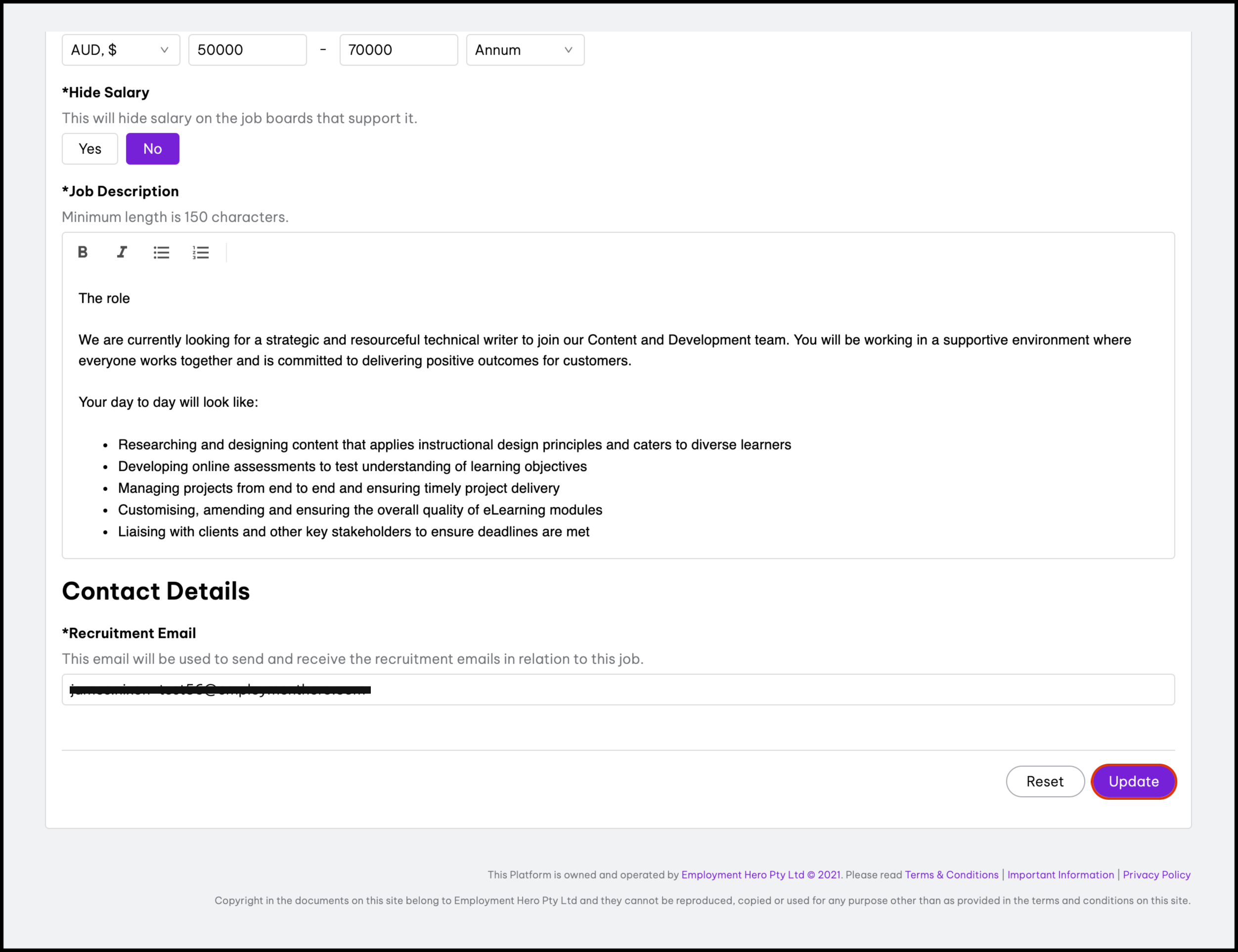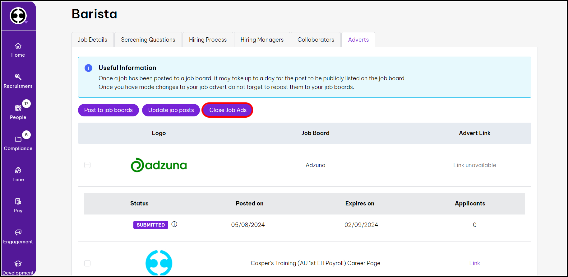 The platform will not automatically repost any details you make to your job ad within the HR platform to your chosen job board. So, after making any updates within the HR platform to a job ad, you must manually repost these updates out to your chosen job board provider. To see the details on whether reposting your job ad will incur a fee from your job board provider, refer to the following article.