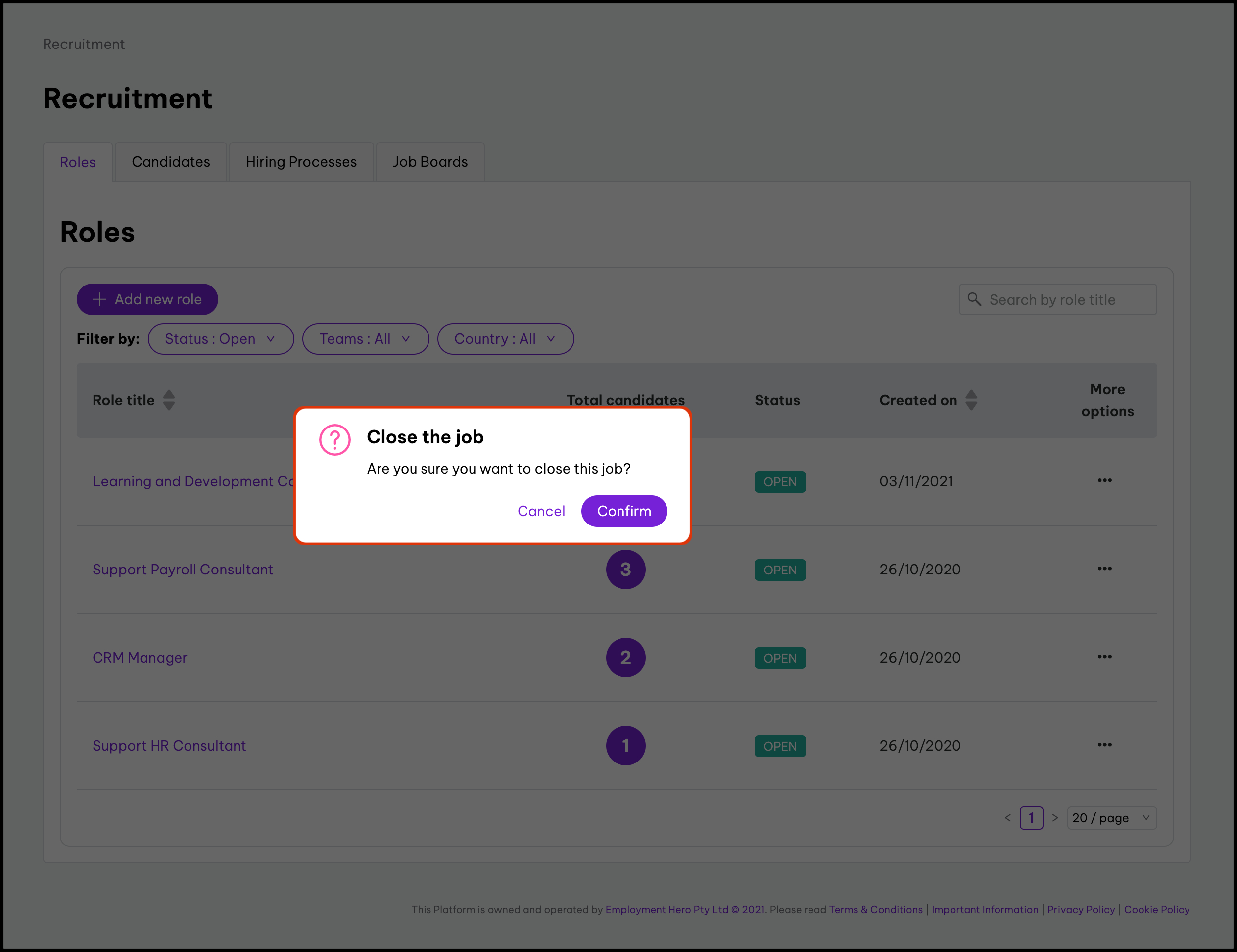 The Recruitment Management feature allows you to manage the open roles you are recruiting for by letting you edit your screening questions and evaluation questions, manage comments, hiring managers, and more. For information about how to manage job openings and the candidates who have applied for roles, refer to the following articles: