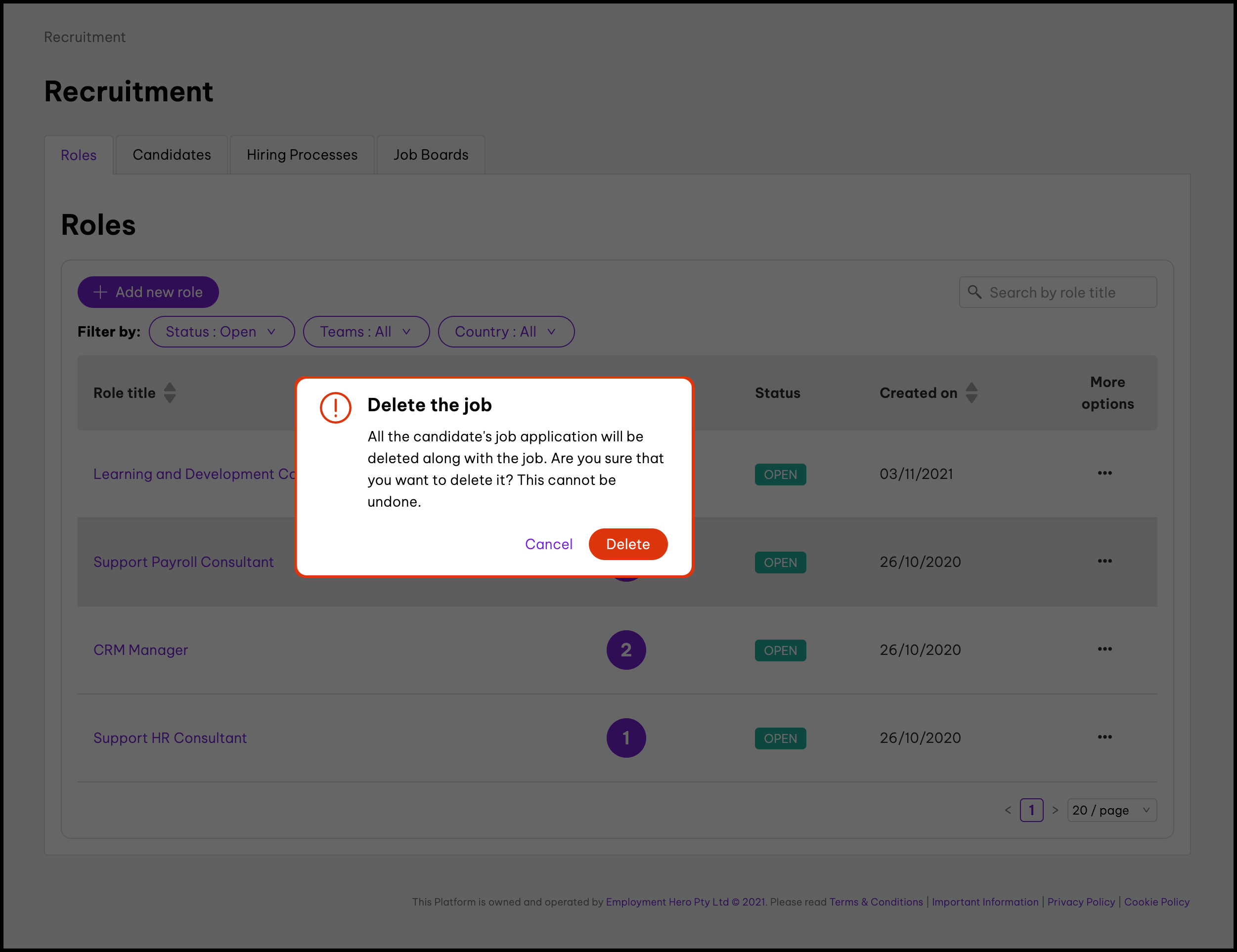 - The Delete Role removes a role completely from the Recruitment Module.