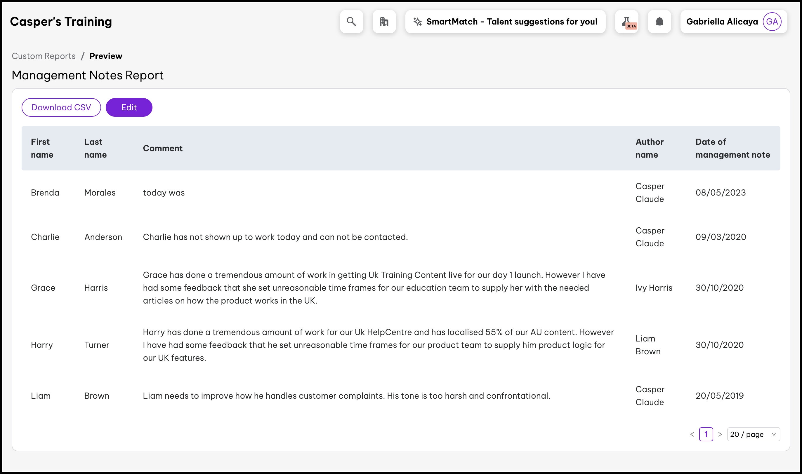 You will now see your management notes report on your screen. To read more information on how to edit, download, and delete a custom report, refer to the following article.