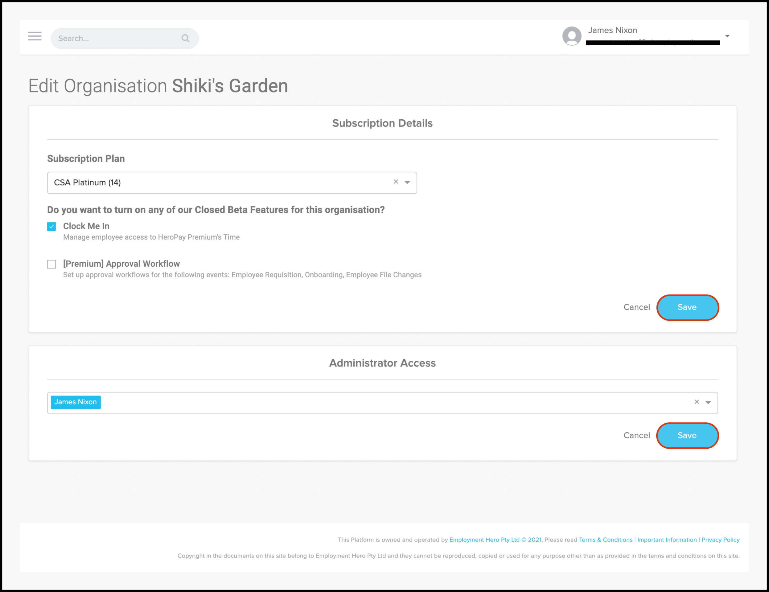 - Make the required changes in the Administrator Access section and click the Save button.