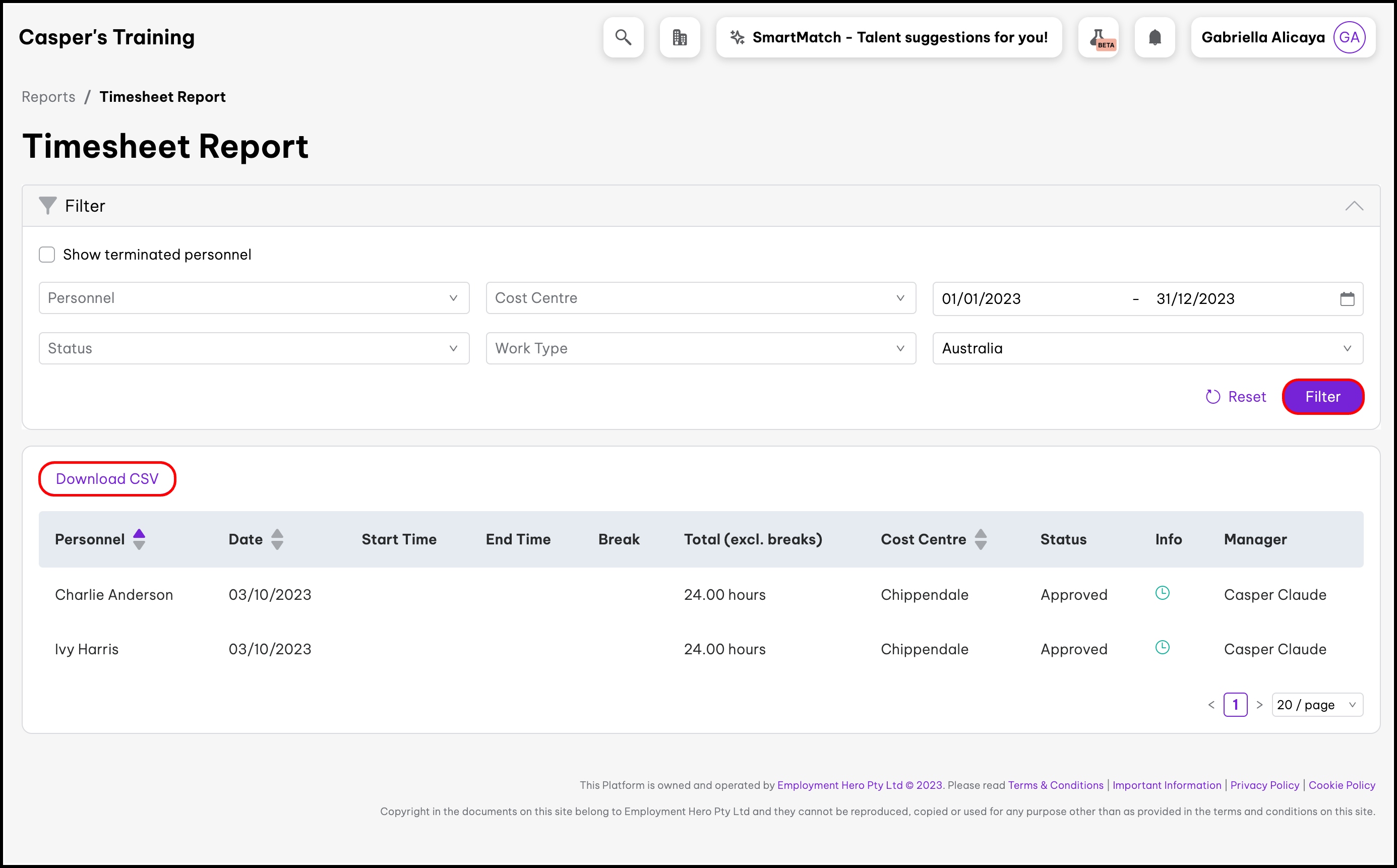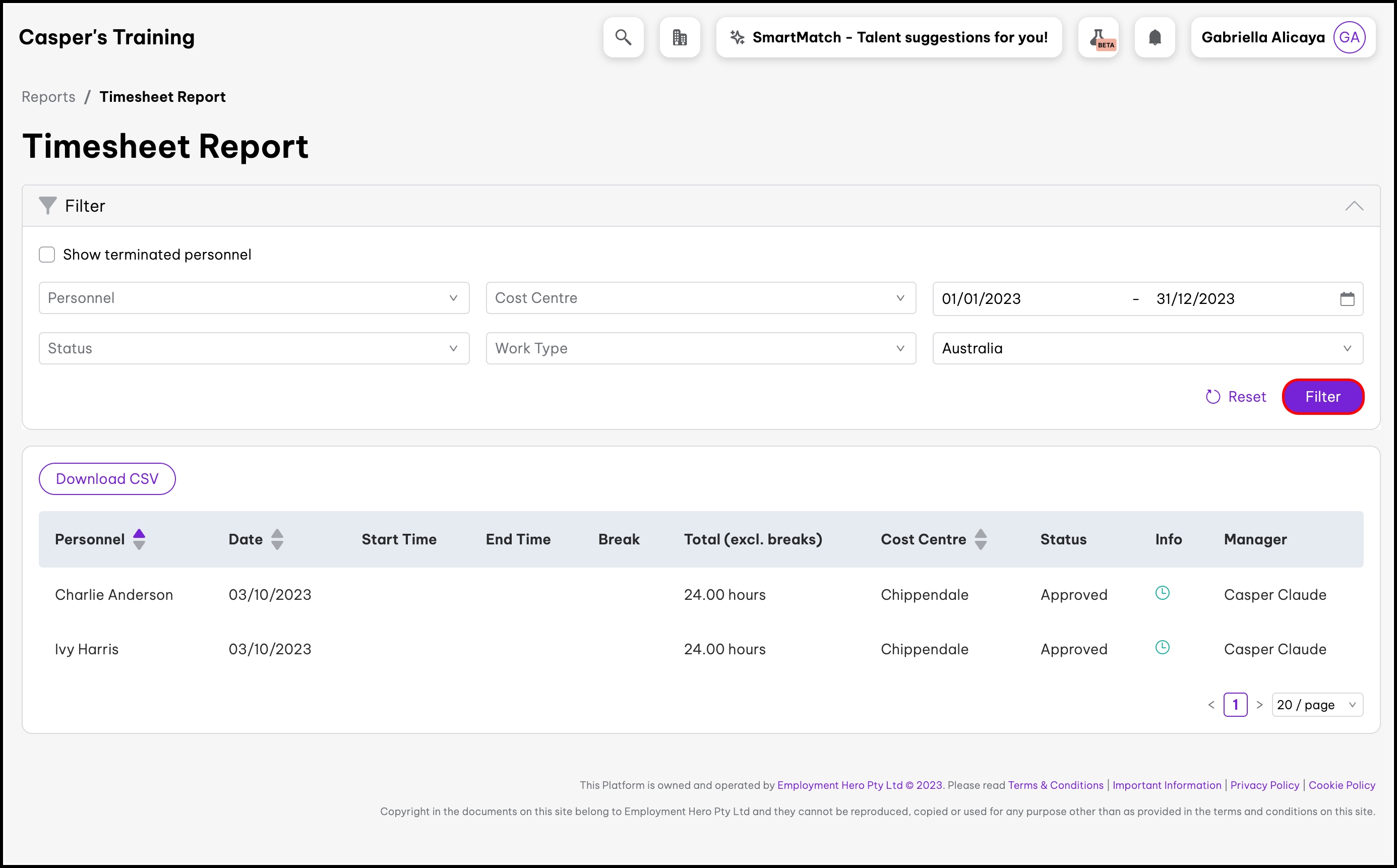 The Timesheet Reporting feature allows you to create a report on your organisation's timesheet submissions and see details such as the current approval stage and the allocated work type. You can also use this feature to download a CSV file of the data, enabling you to load the report into a CSV-supported program like Microsoft Excel.