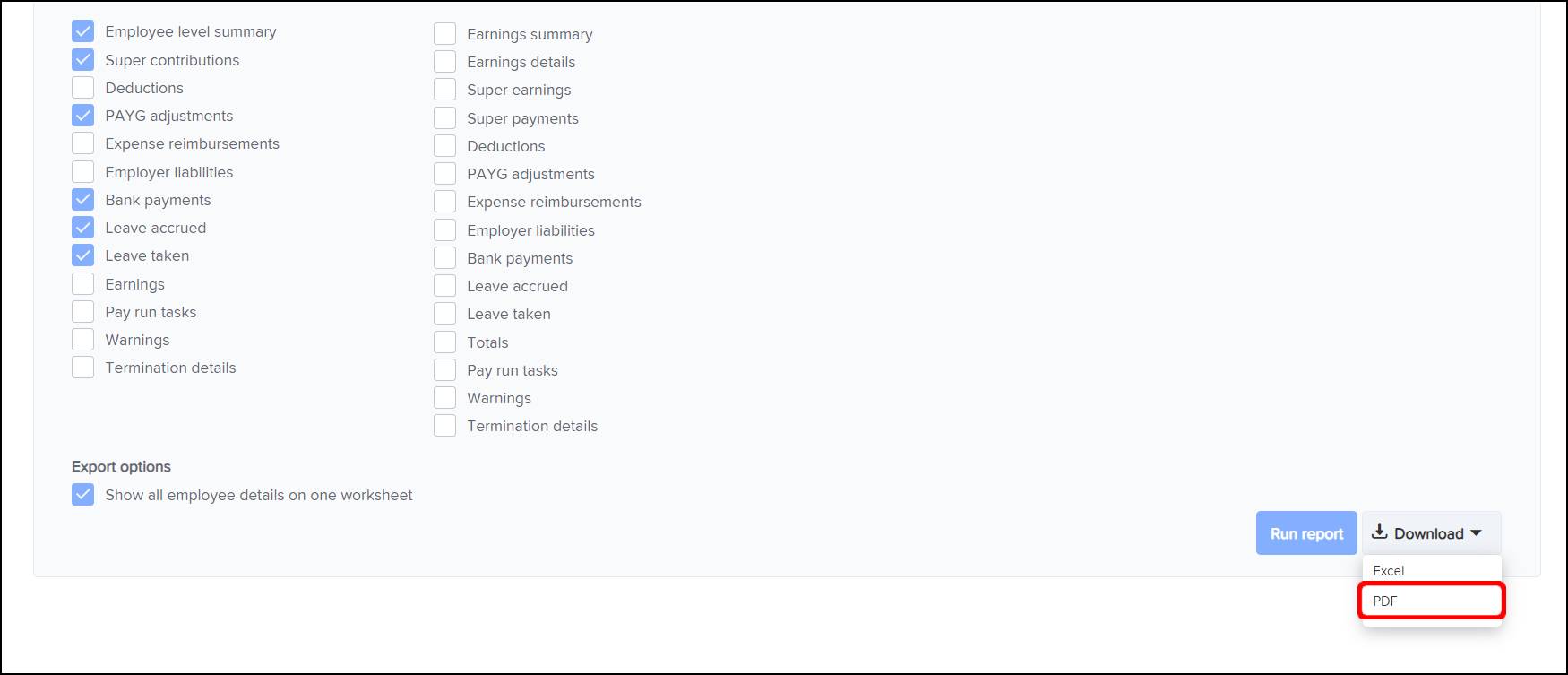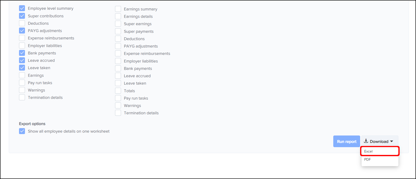 The Audit Reporting feature allows you to create a report on the pay runs conducted within your organisation and see details such as the deductions made, the PAYG adjustments, and the leave accrued. You can also use this feature to download an Excel file of this data or save the information in a printable PDF format.