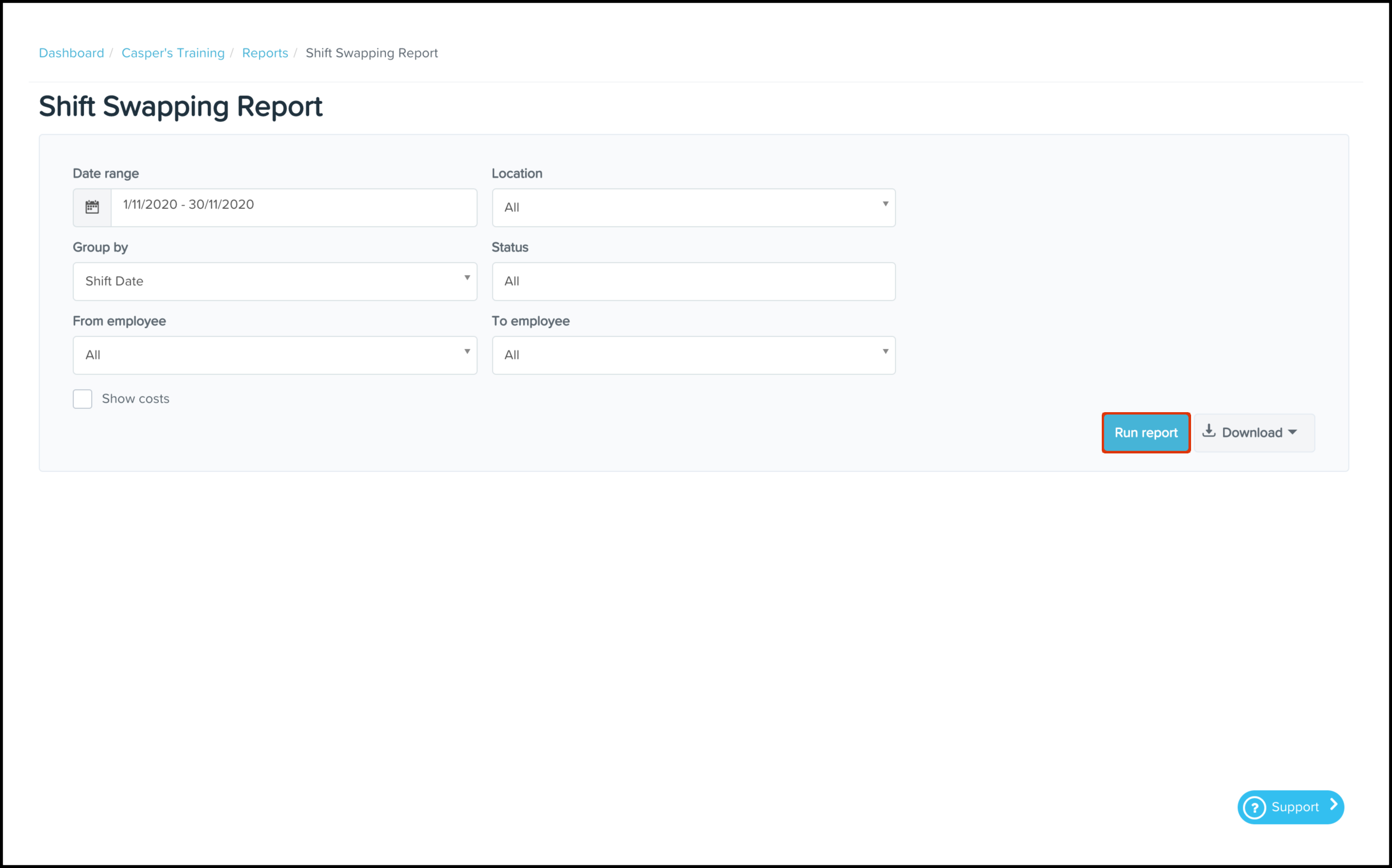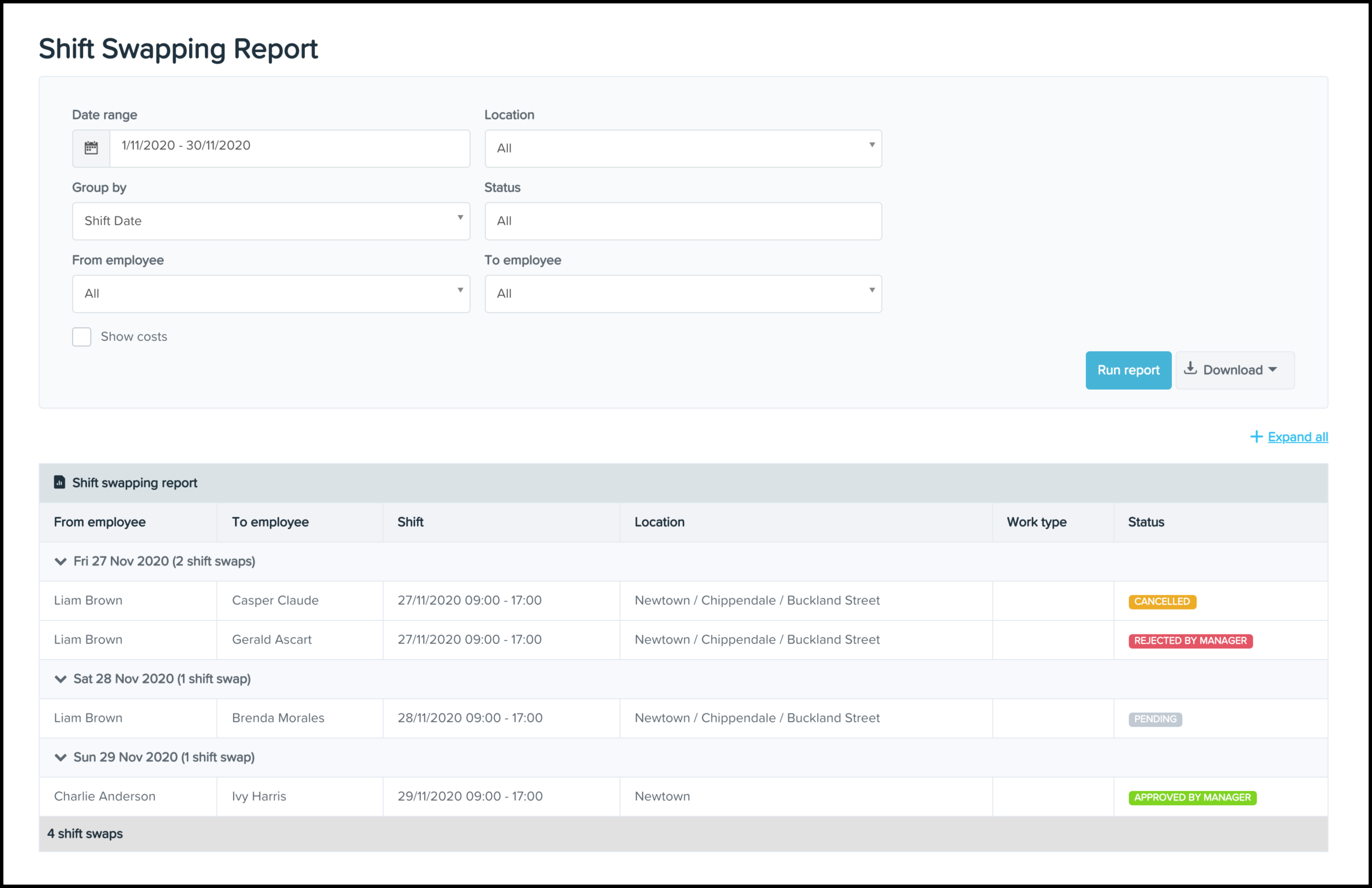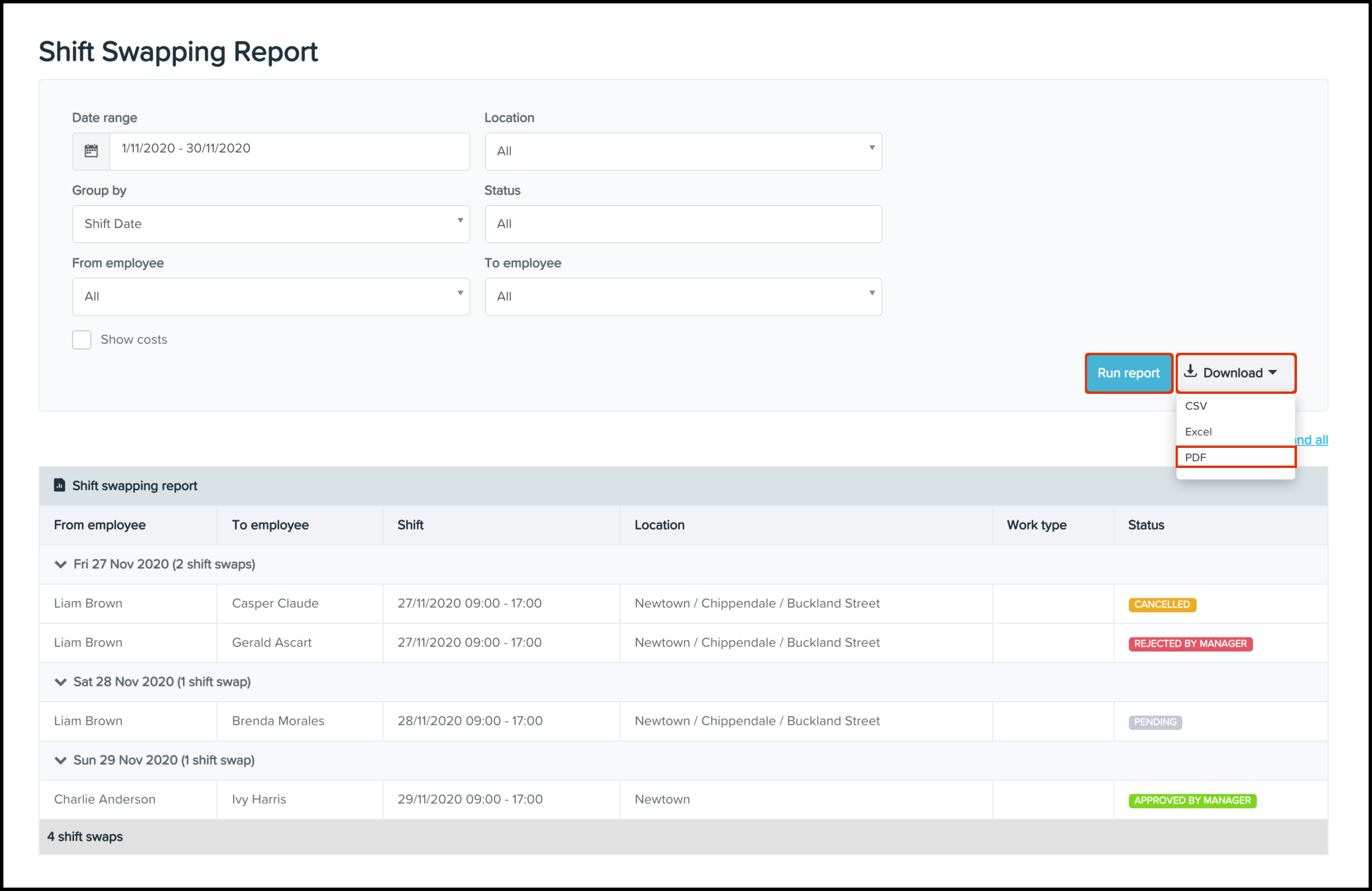 The Shift Swapping Reporting feature allows you to view employee shift swap requests within your organisation. You can see the status of each submission, the date of the request, and any applicable work types. You can also use this feature to download an Excel file of this data or save the information in a printable PDF format.