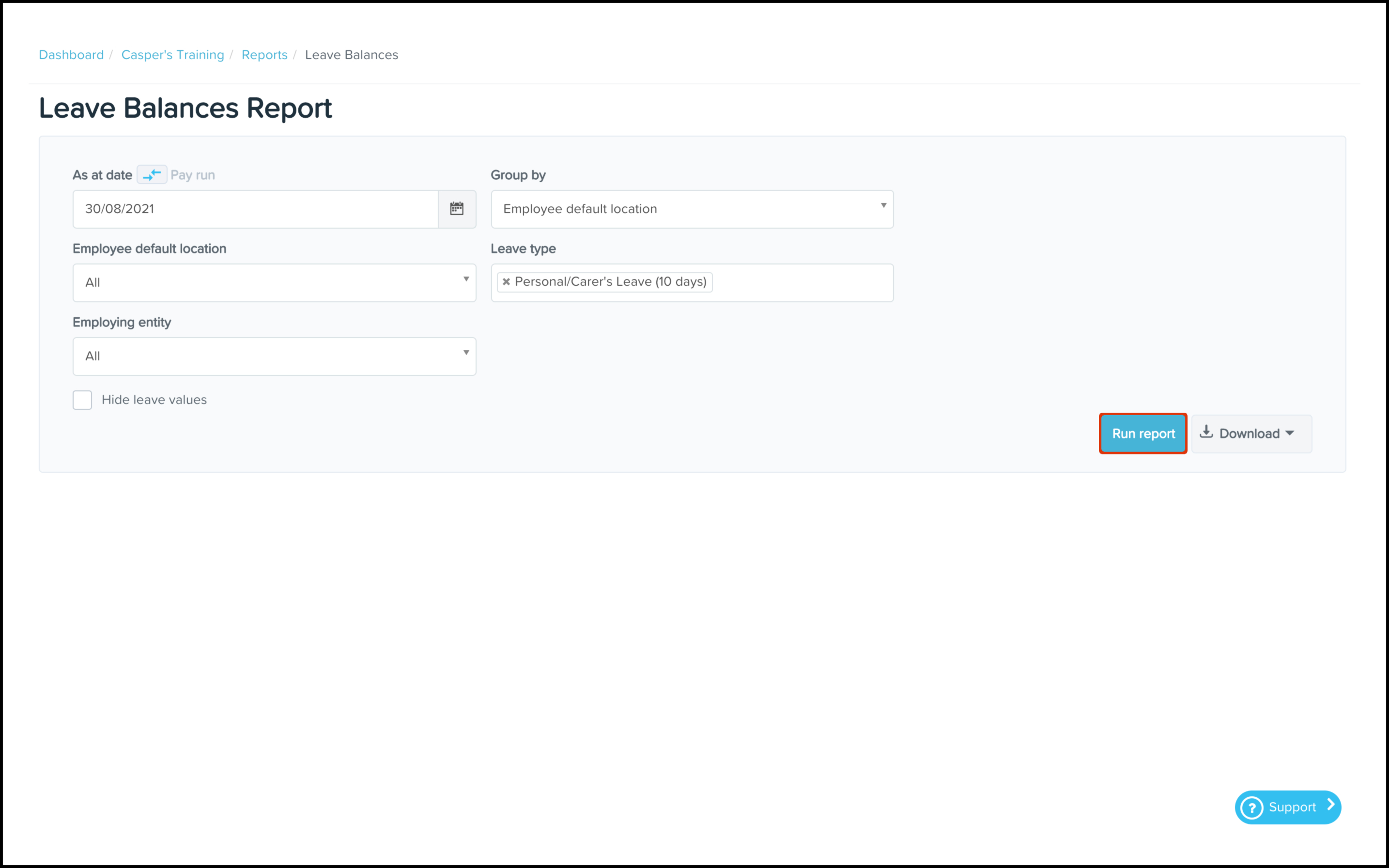 When it comes to the Leave Balances report, it is always best to toggle the button above and switch to "Pay Run" instead of "As at date". This is because the pay run data is the most accurate.