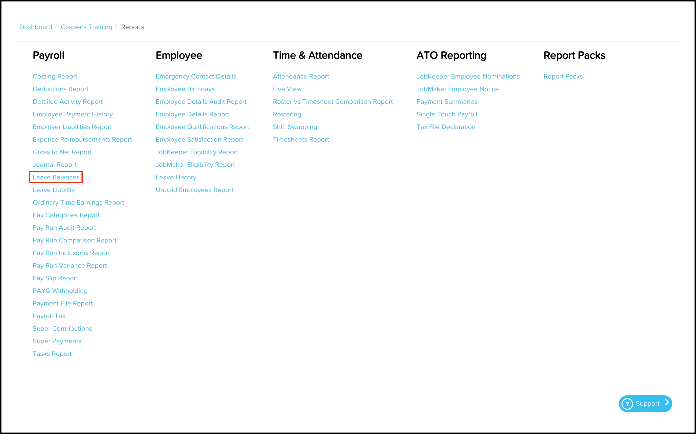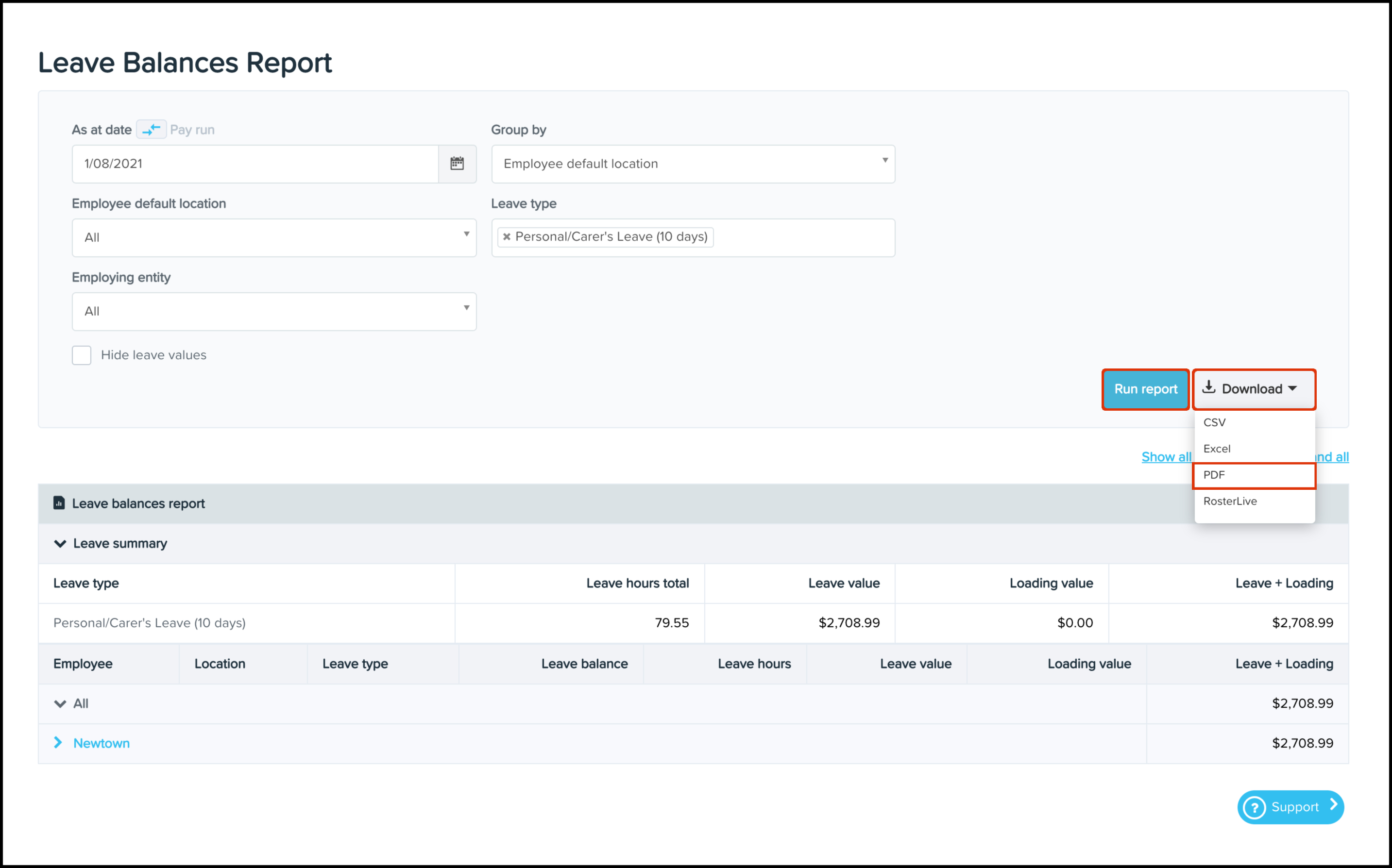 The Leave Balance Reporting feature allows you to create a report that you can use to analyse each employee's current and historical leave balances and see details such as the leave value, loading value, and leave type. You can also use this feature to download an excel file of this data, export to RosterLive, or save the information in a printable PDF format.