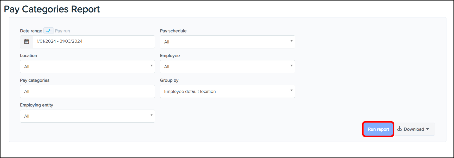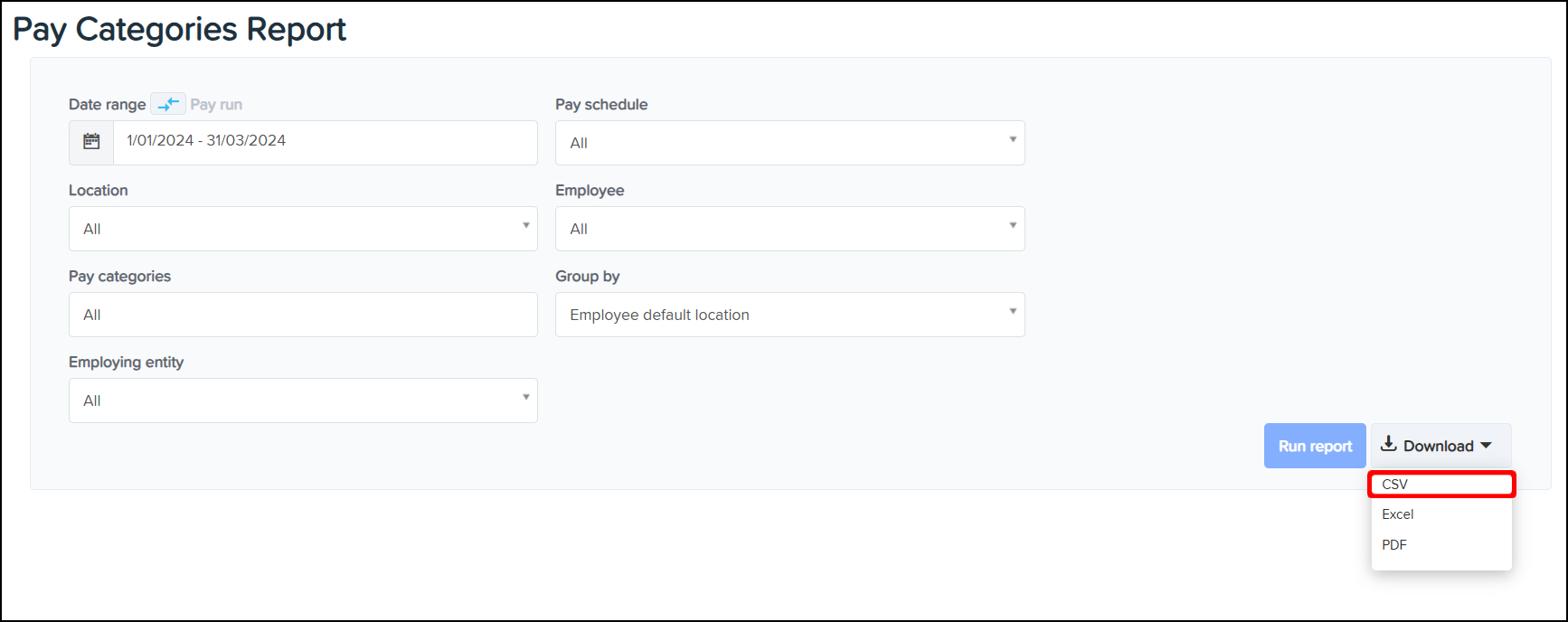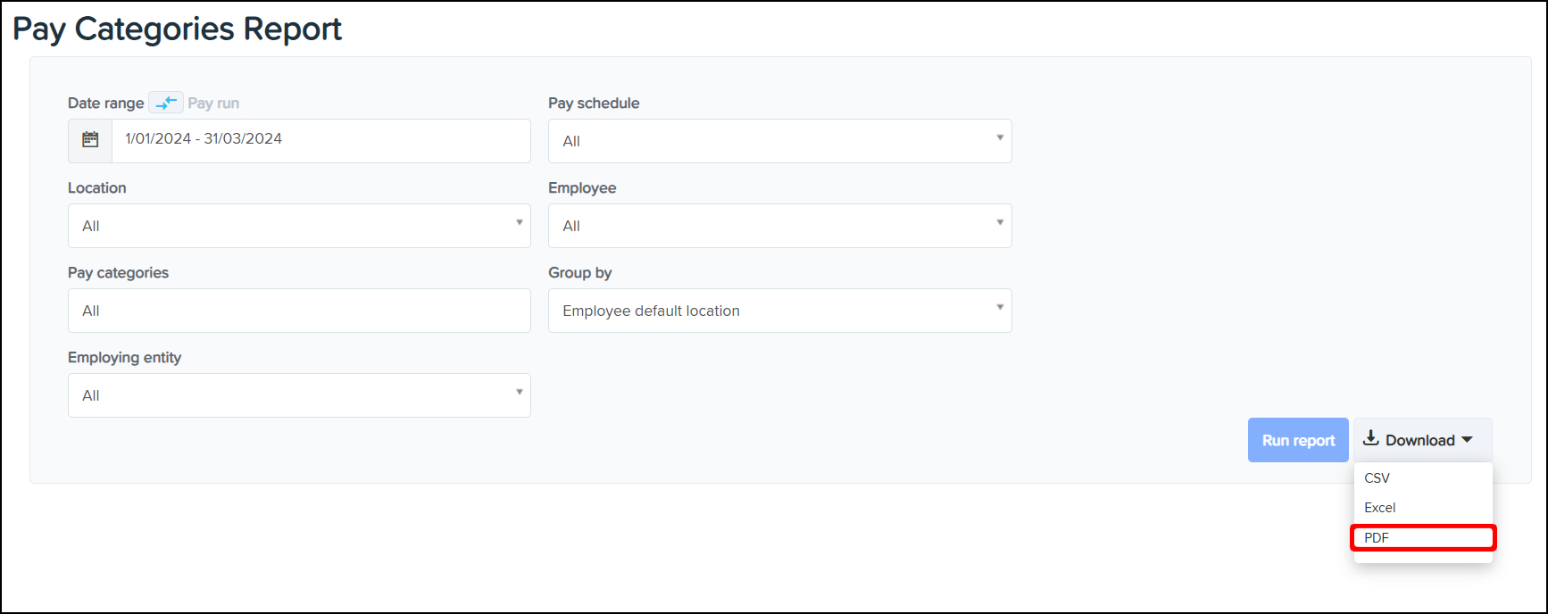 The Pay Categories Reporting feature allows you to create a report on the employee pay categories within your business at a specific time, with the ability to narrow the data further down by employing entity and pay schedule. You can also use this feature to download a CSV or Excel file of this data, or save the information in a printable PDF format.