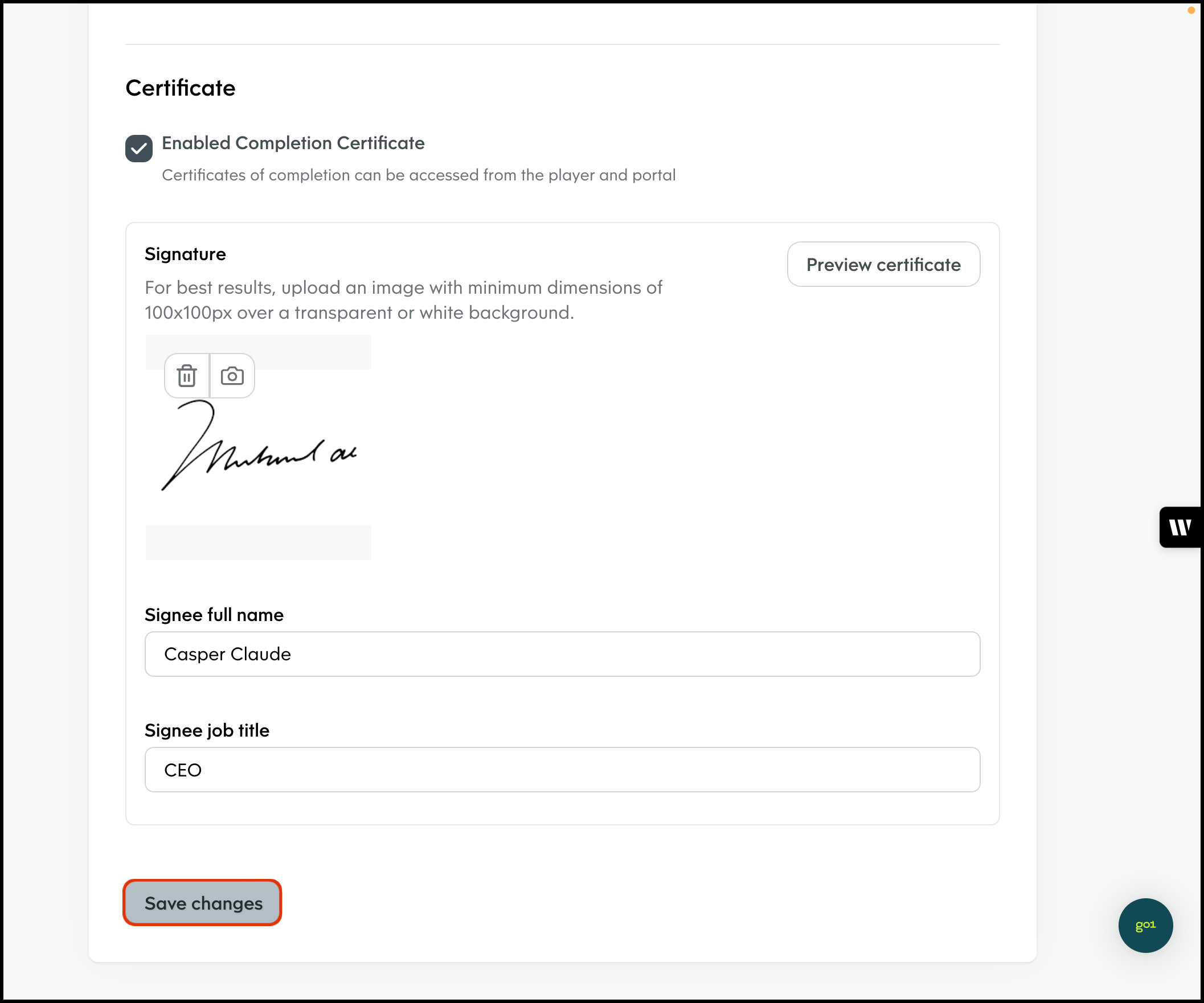 The Learning Theme section allows you to customise your learning portal branding to fit your organisational needs. You can, for example, edit settings such as what login logo or background your employees see and the default colour scheme used within your learning platform. We also provide features that allow you to edit the elements shown on the course completion certificate. Lastly, if you want to disable completion certificates, you can do so from this page as well.