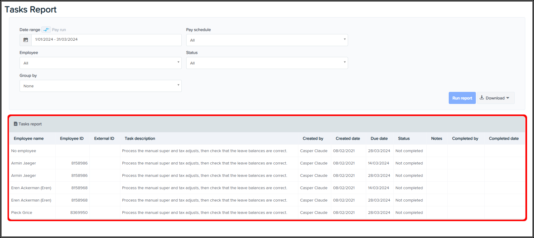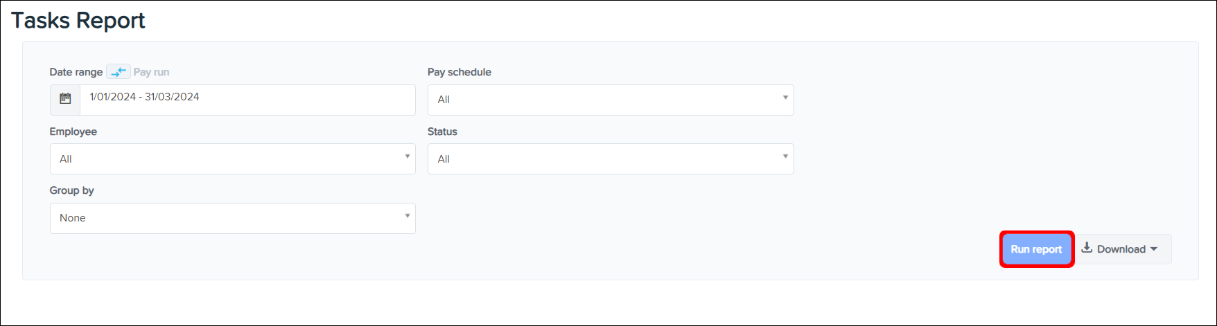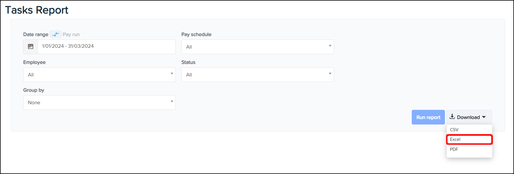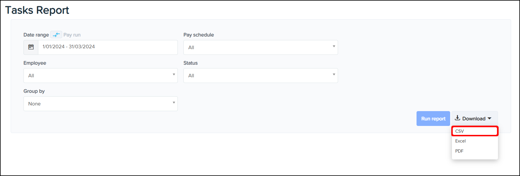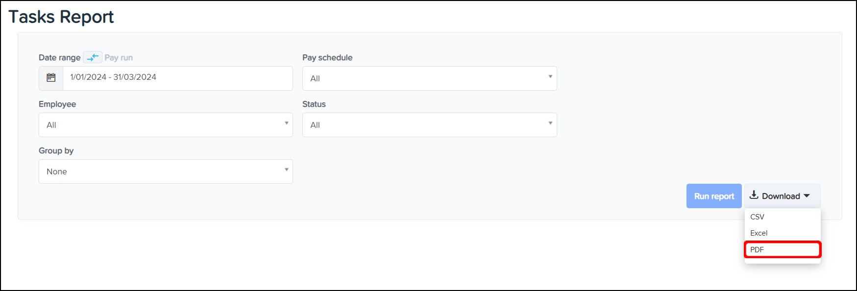 The Tasks Reporting feature allows you to create a report that you can use to view the tasks completed in a finalised Pay Run within your organisation, with the ability to narrow this data down by employing entity, pay schedule, and employee. You can also use this feature to download a CSV or Excel file of this data, or save the information in a printable PDF format.