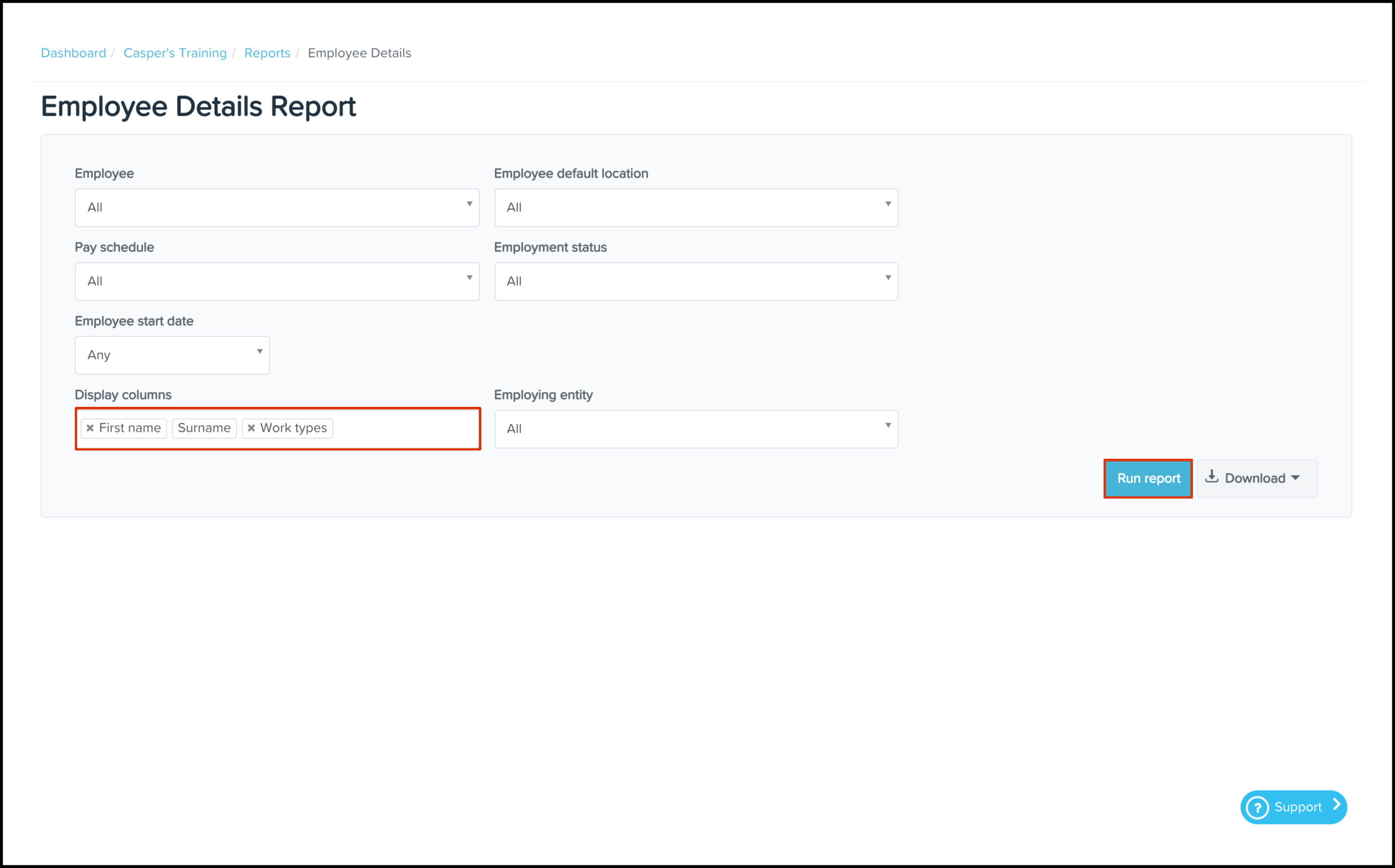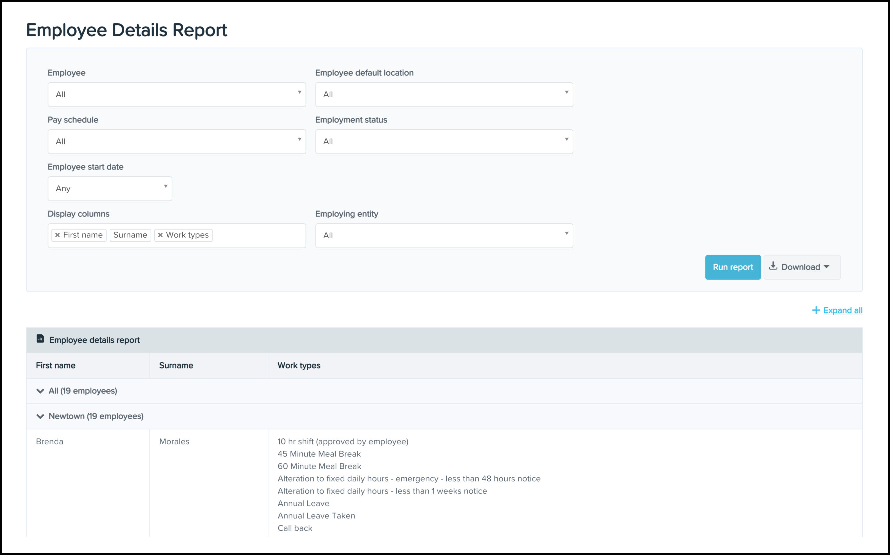 You can use the Employee Details Reporting feature to construct a report on the work types assigned to your employees within your payroll classic platform.