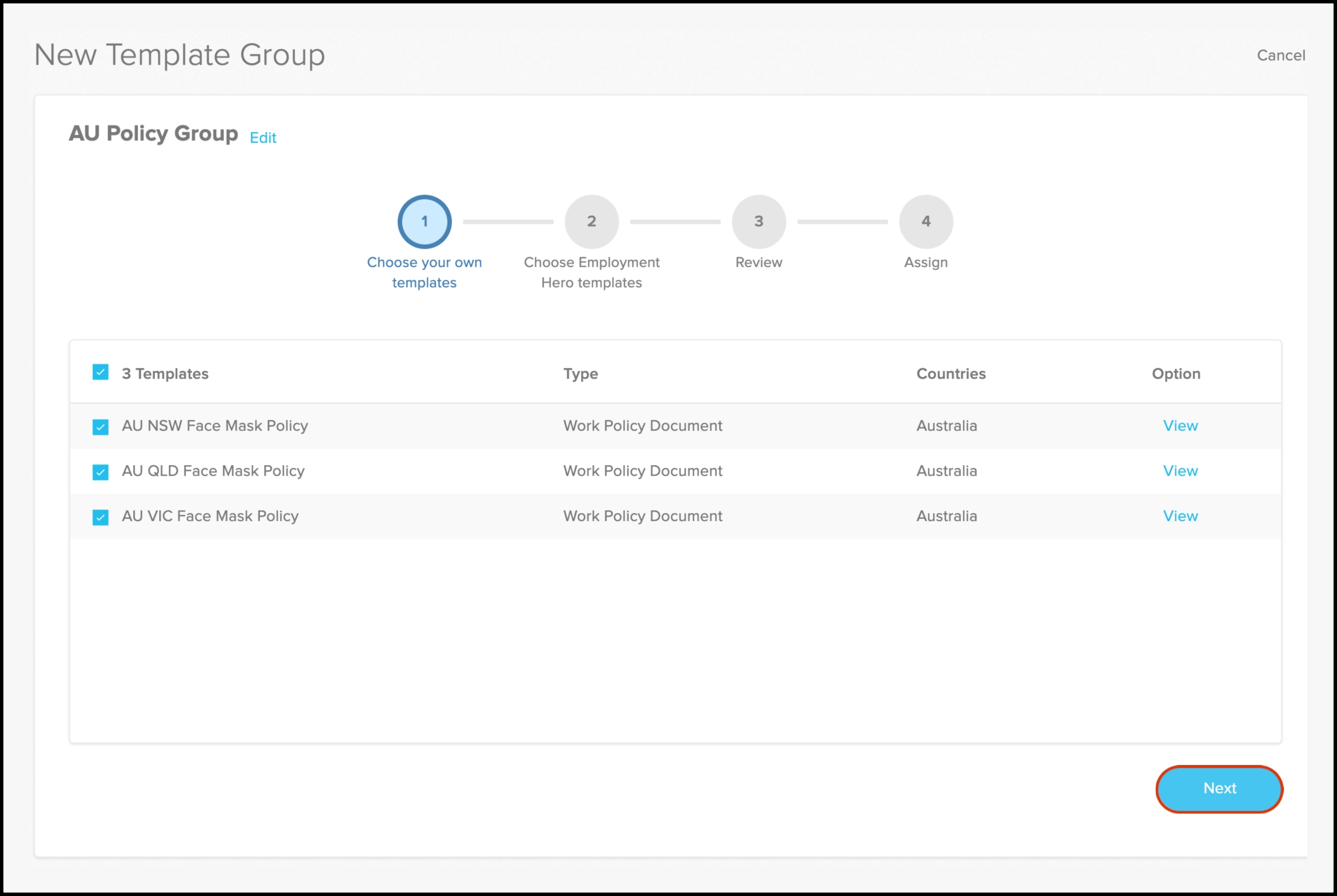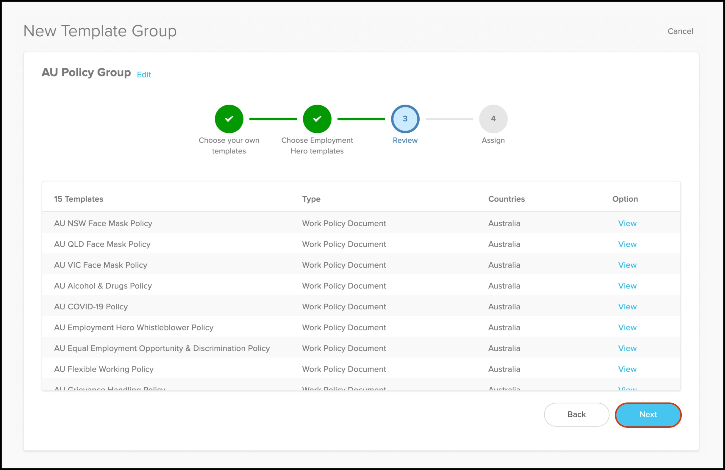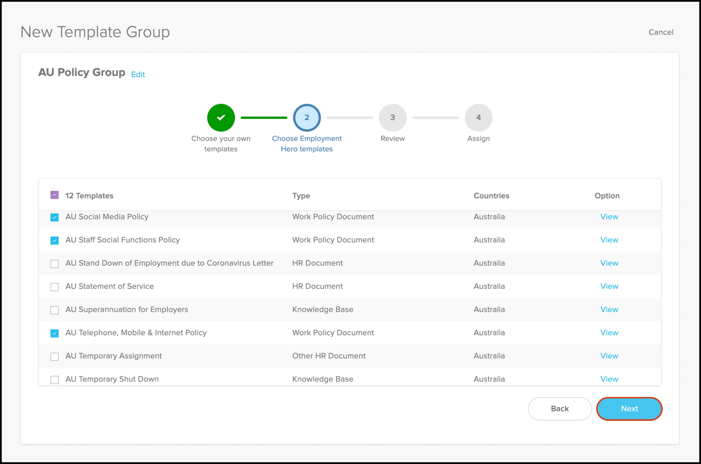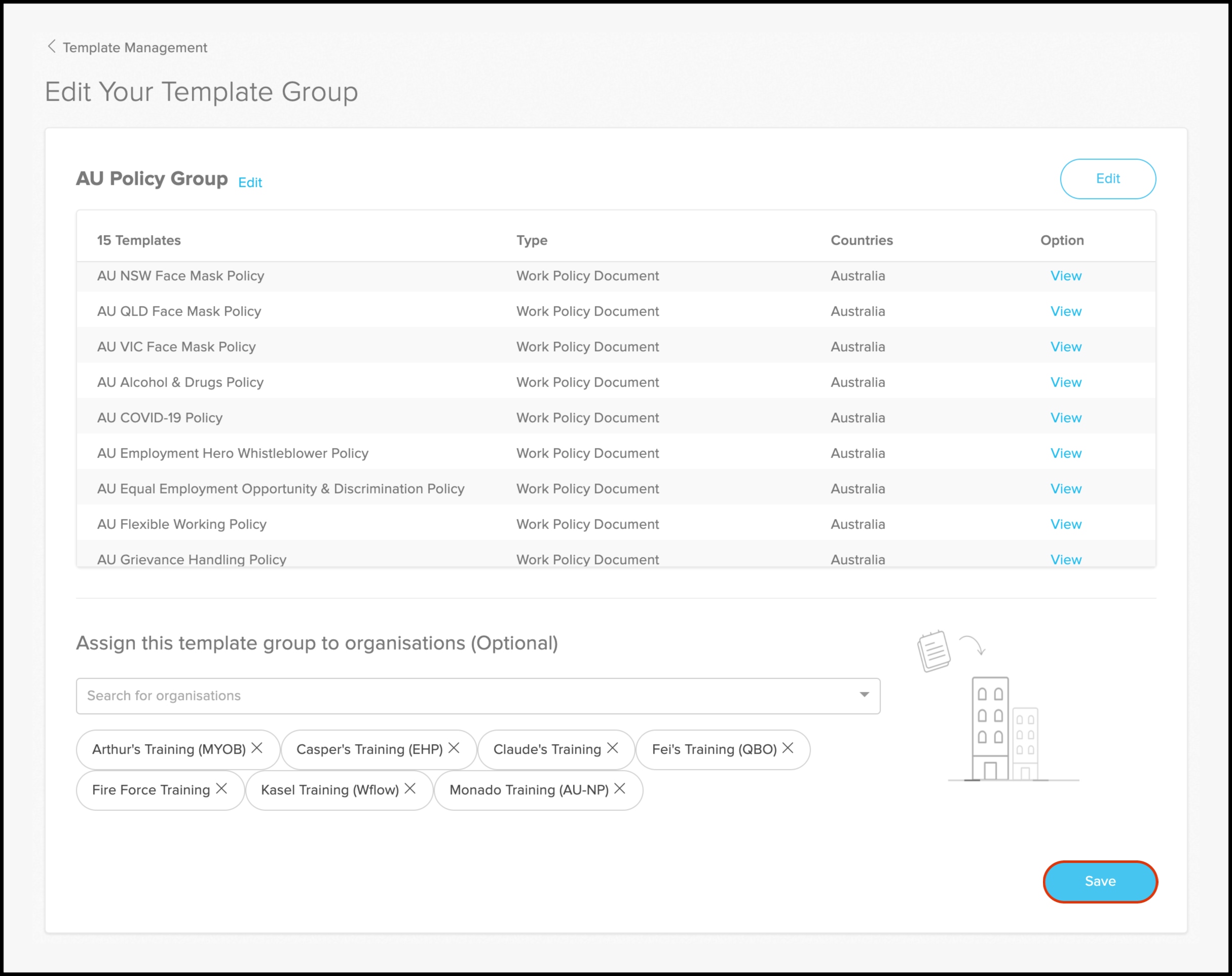Only if you are a Value-Added Reseller, can you choose what Employment Hero Templates to exclude from your template group. By default, the platform includes all Employment Hero templates within a template group.
