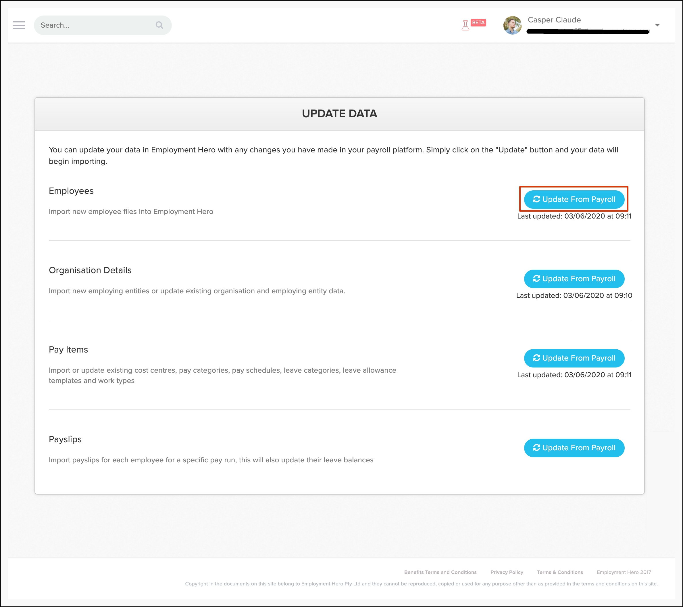 The Employees section will now show a green Updated button. This means Employment Hero has successfully imported your employees from Payroll classic.