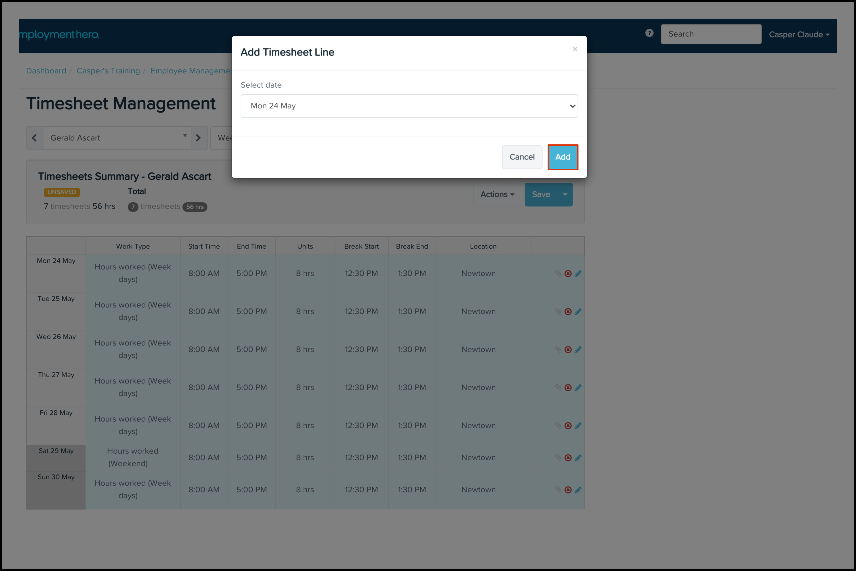The Submitting a Timesheet on Behalf of an Employee feature allows your organisation's payroll admins to submit a timesheet for any employee and specify details such as the start and end time of the shift and breaks taken, the work type it falls under, and the location where they worked these hours. You can also use this feature to add an employee's standard hours, copy timesheets from the last fortnight, edit any information if it has changed, and delete an entry that is no longer required.