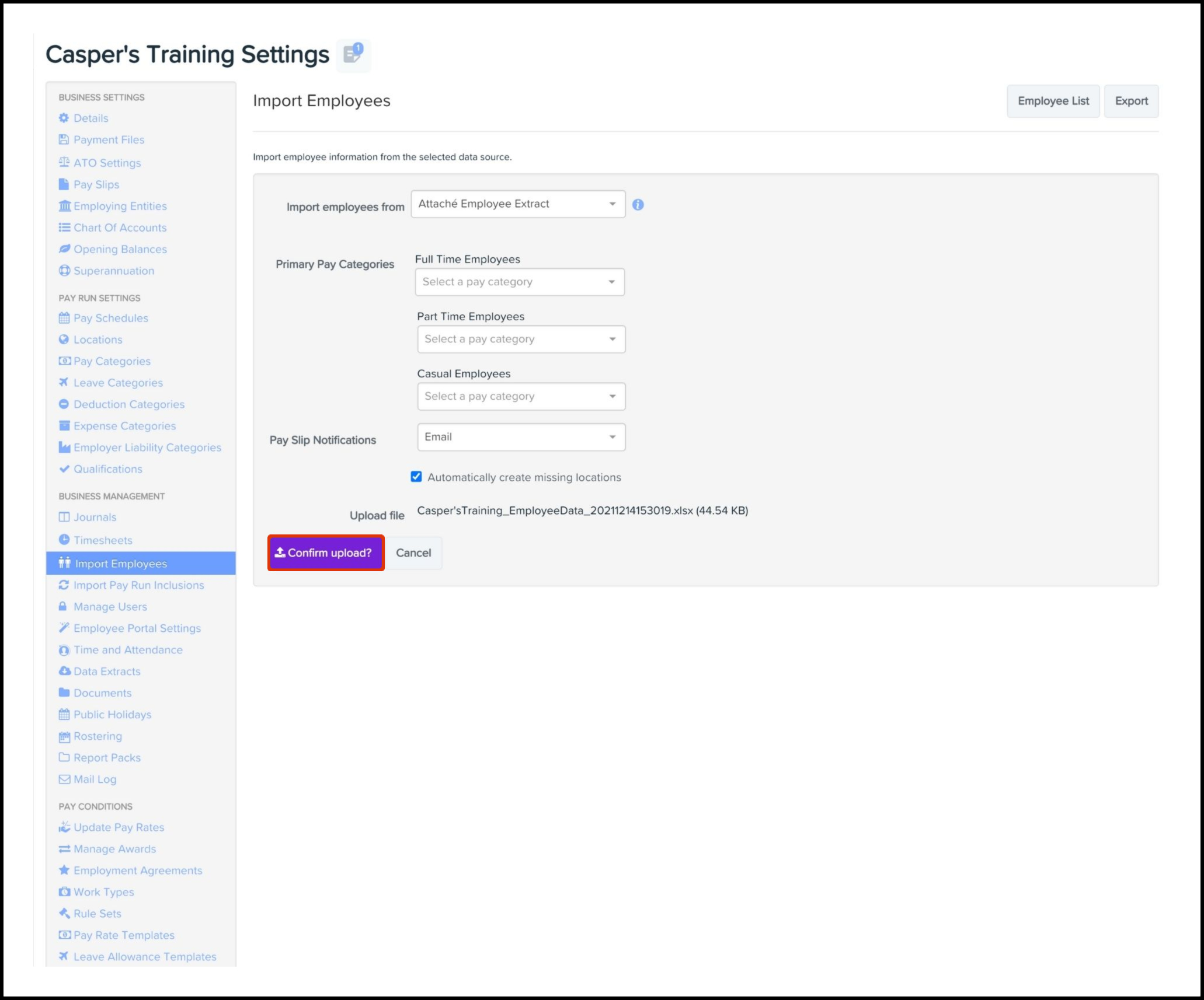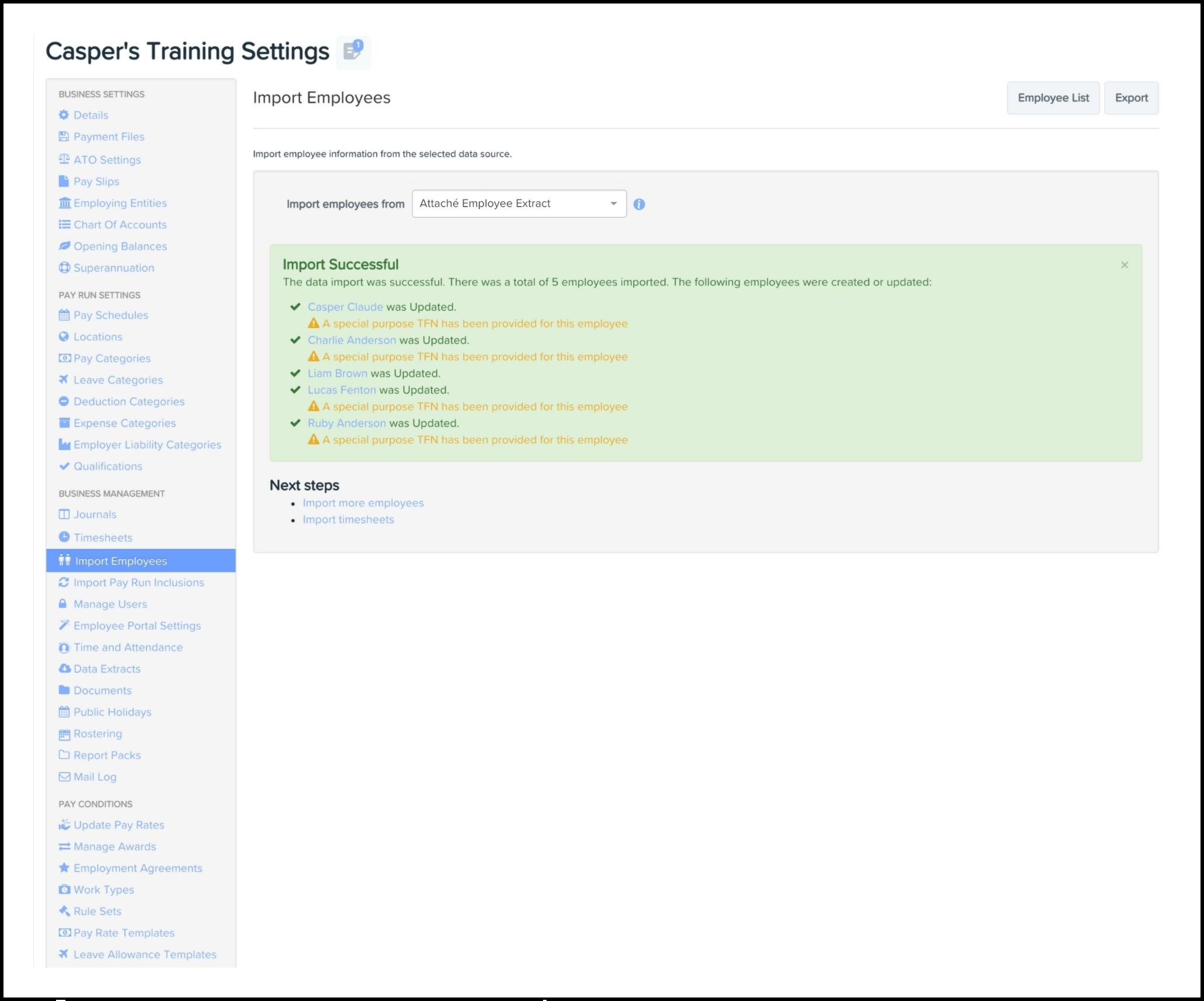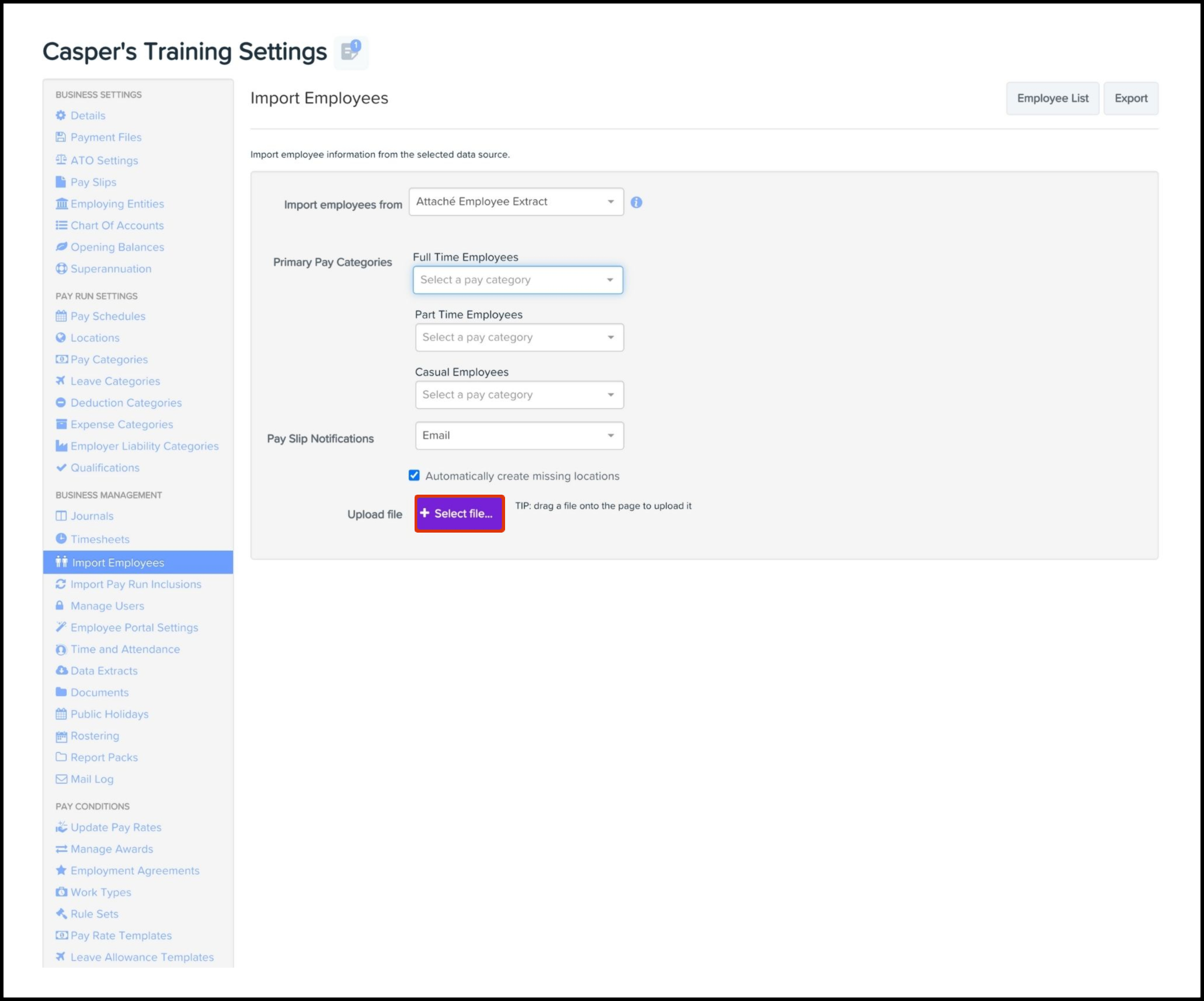 You can use the Employee Importing feature in the Payroll Settings module to import in bulk from your Attaché platform. You will need to undertake the below steps via your Employment Hero Payroll classic platform.
