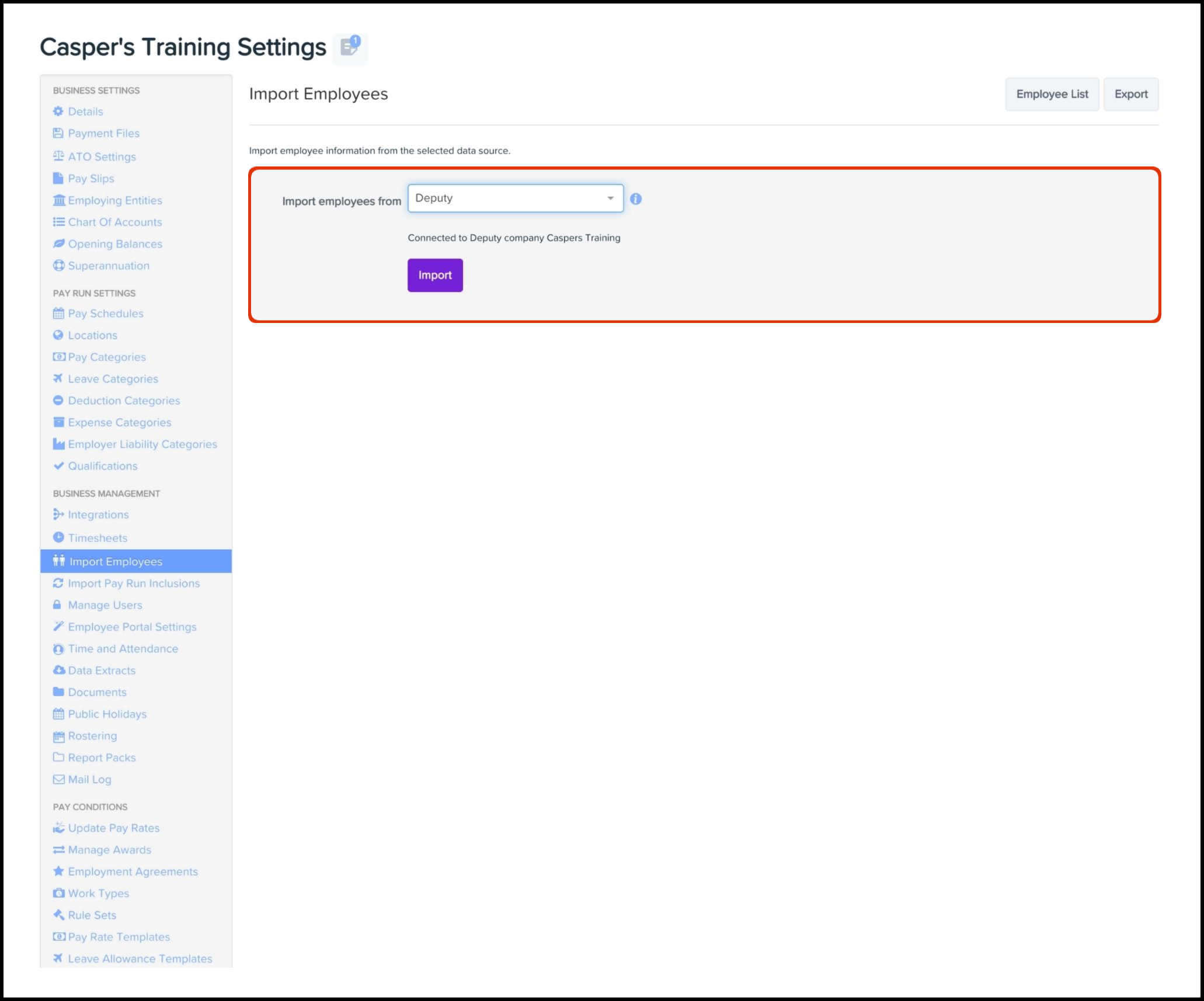 You can use the Employee Importing feature within the Payroll Settings module to import in bulk your employees from your Deputy Enterprise platform. You will need to undertake the below steps via your Employment Hero Payroll classic platform.