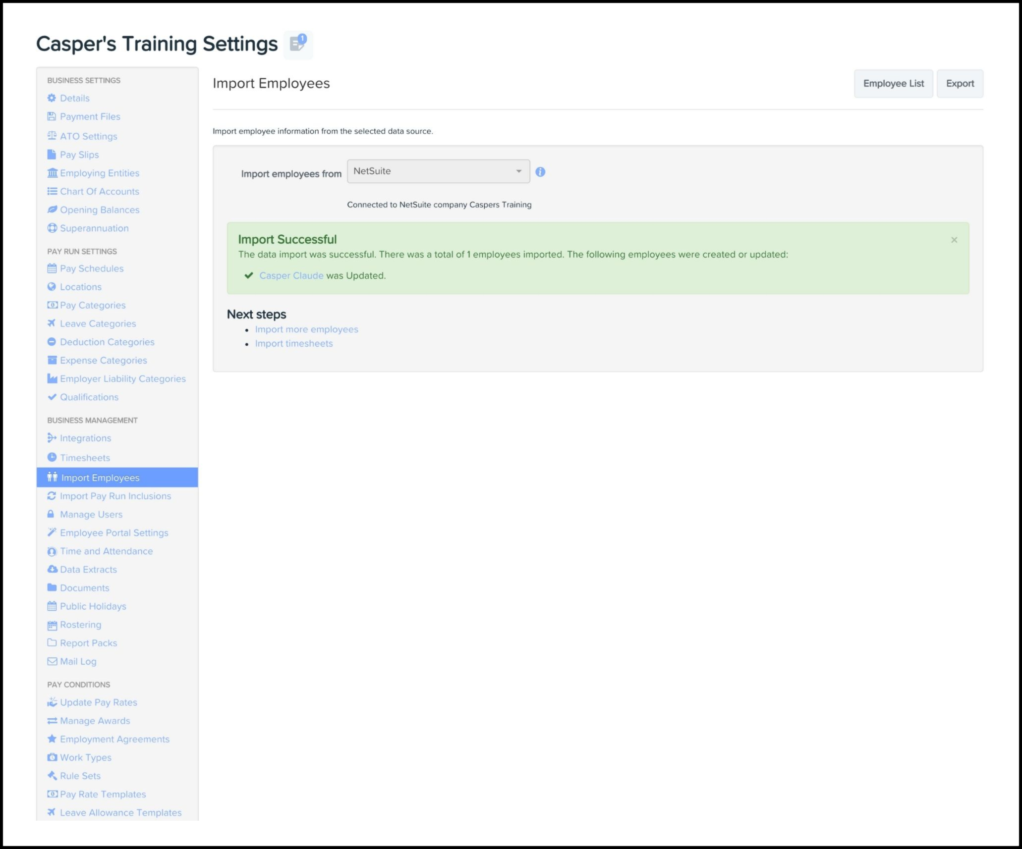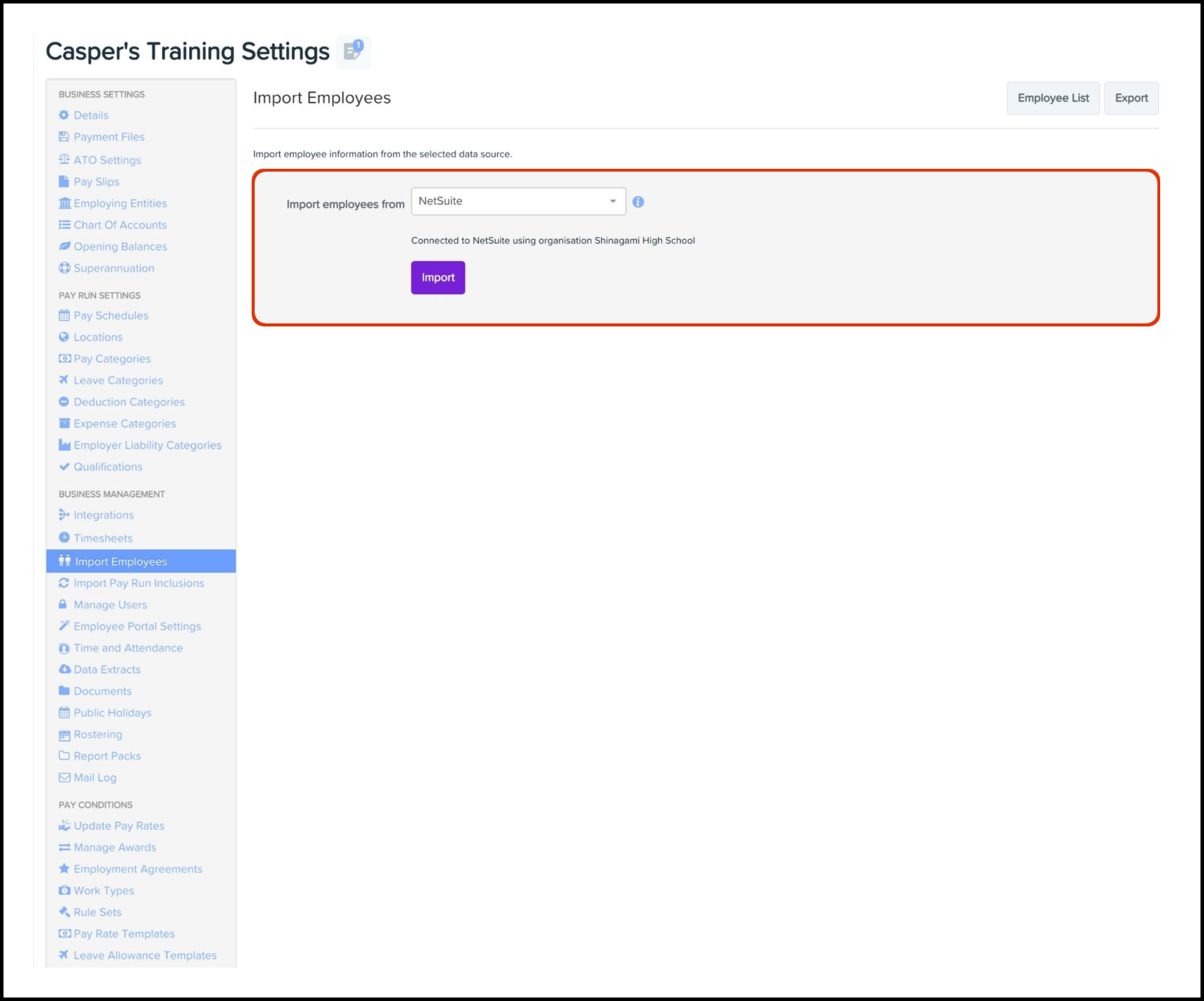 You can use the Employee Importing feature within the Payroll Settings module to import in bulk your employees from your NetSuite platform. You will need to undertake the below steps on your Employment Hero Payroll classic platform.