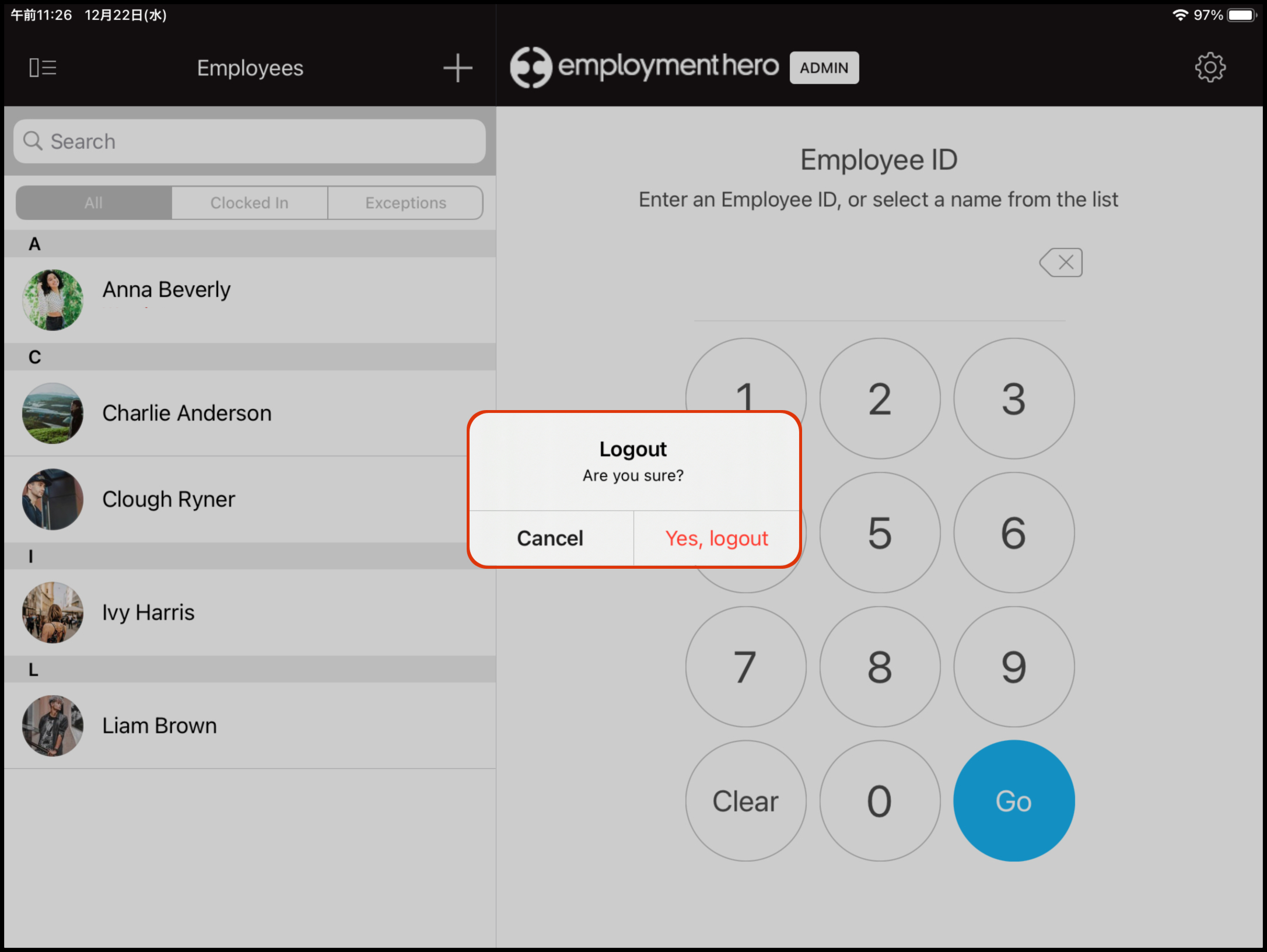 The Logout function on the Clock Me In App (downloadable for iPad users on the App Store) allows you to exit the current instance loaded on your iPad. You will need to have enabled Admin Mode first before you can access this feature.
