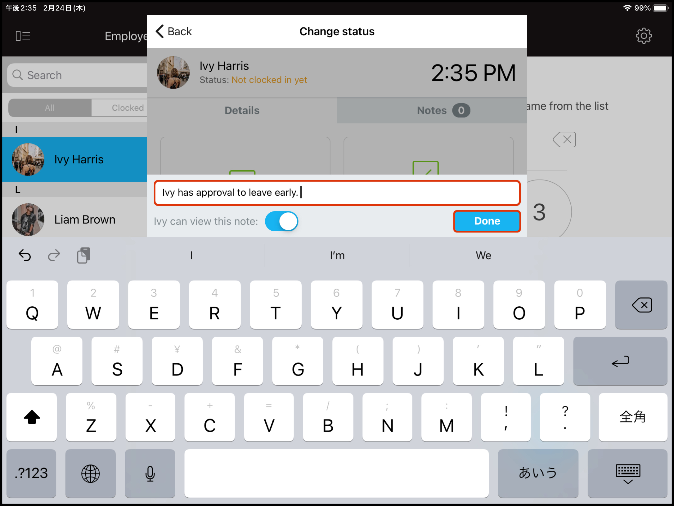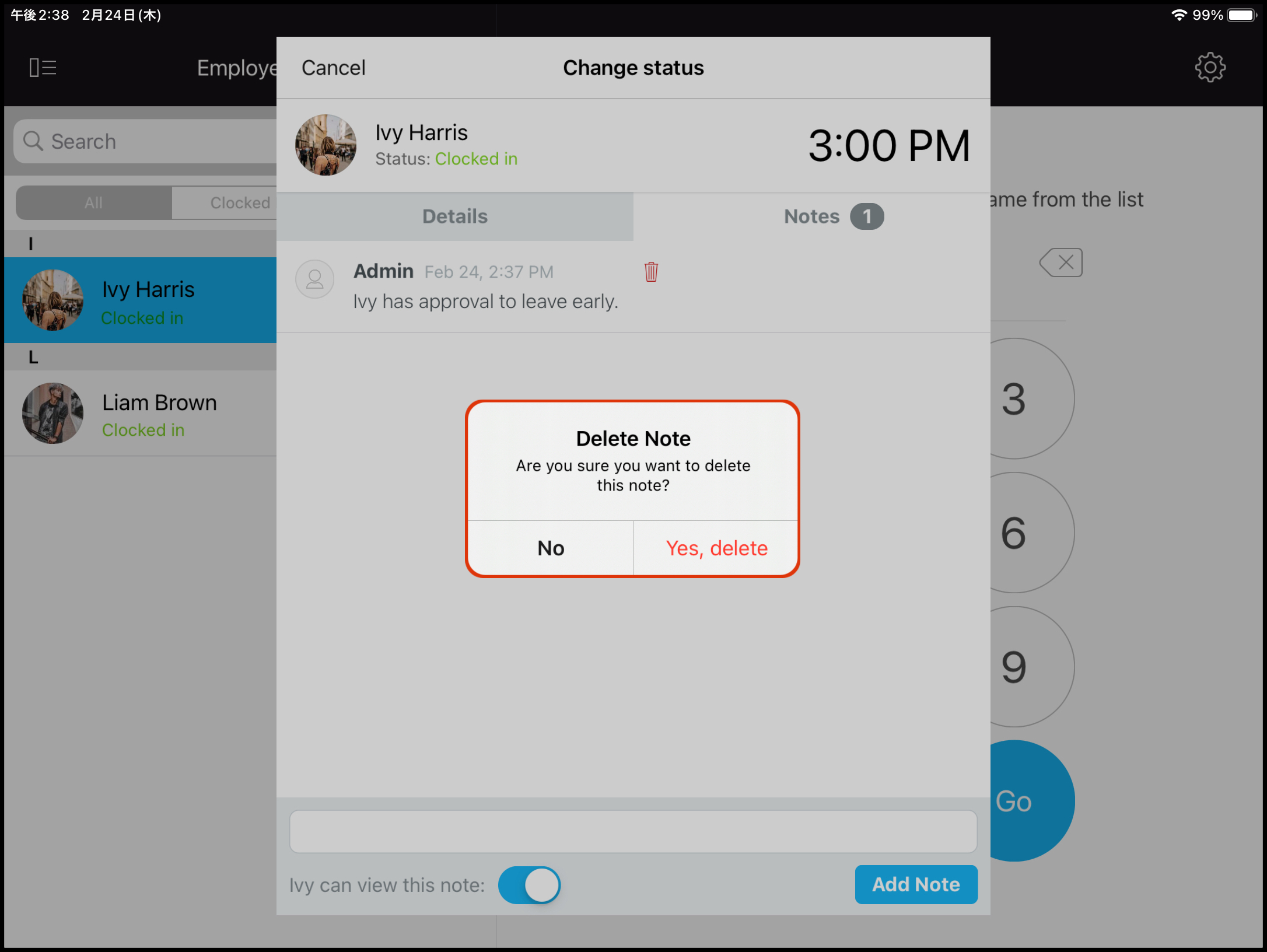 The Notes feature on the Clock Me In app (downloadable for iPad users on Apple's App Store) allows you to select an employee and create a note against their clock in record. You can also use this feature to view the details of a note and delete an entry if it is no longer required. You will need to have enabled Admin Mode first before you can access this feature.