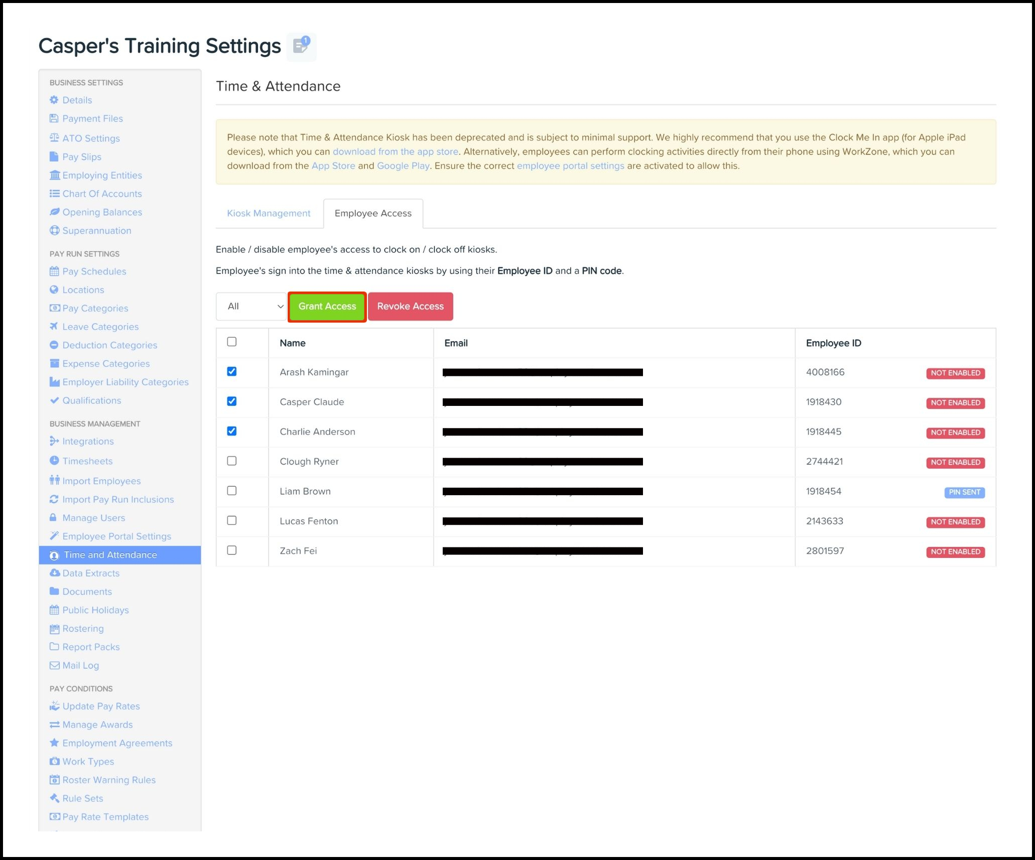 The Time and Attendance Access Management feature allows you to grant access in bulk to employees who need to use your Clock Me In iPad app (downloadable for iPad users on the App Store). You can also use this feature to revoke an employee's access if they no longer need to clock in for work.