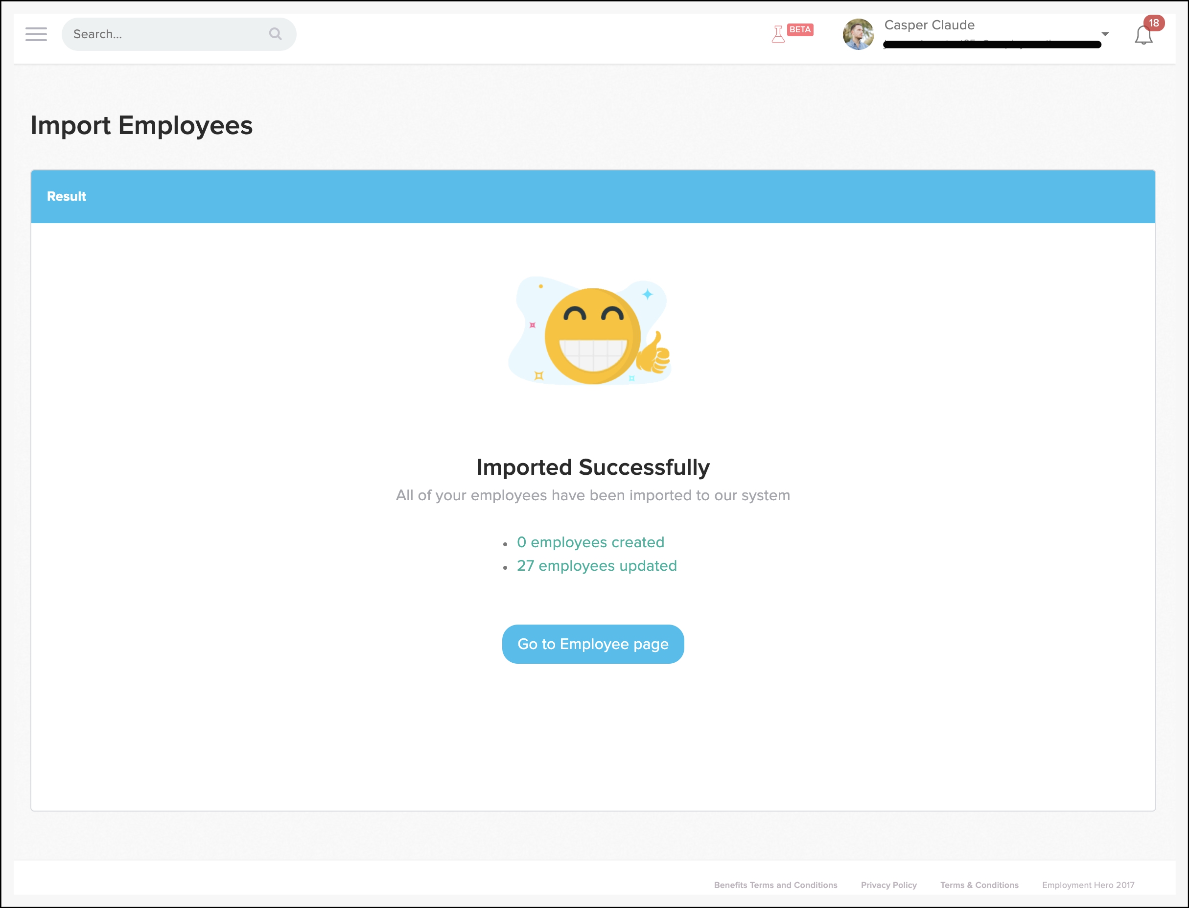You will now see the Imported Successfully page, where you can see the number of employee records created or updated. You can also click the Go to Employee Page button to view the new or updated employee records.