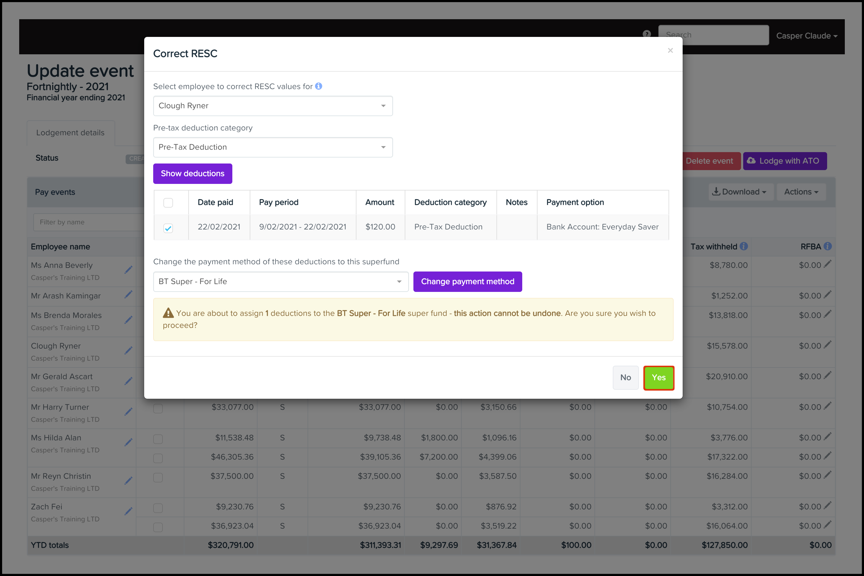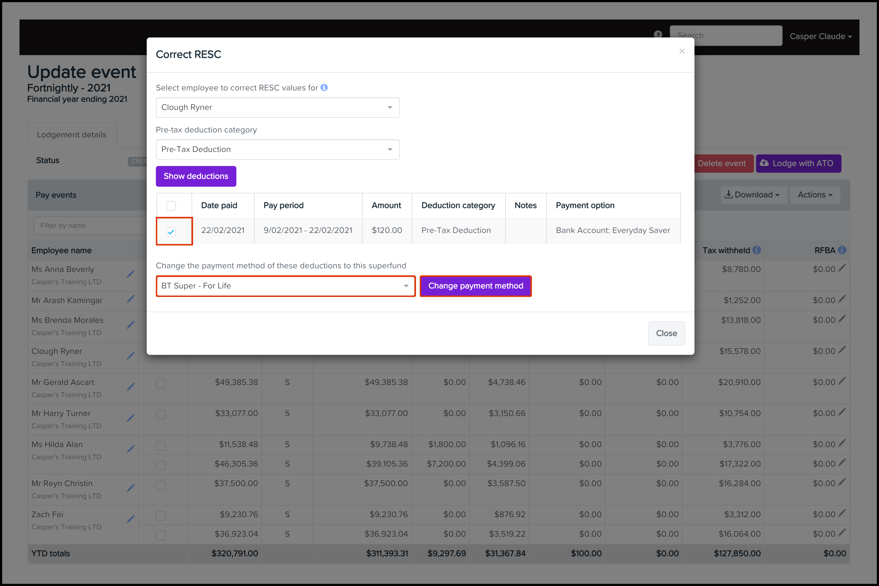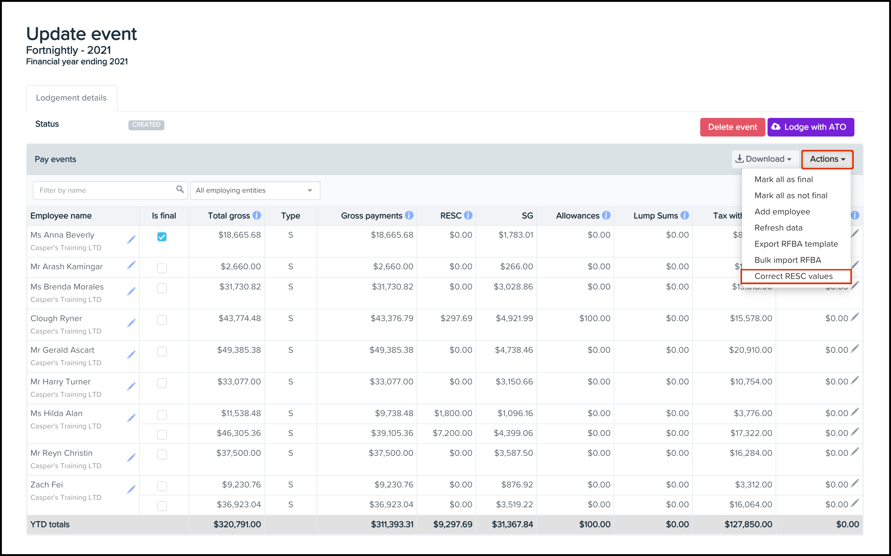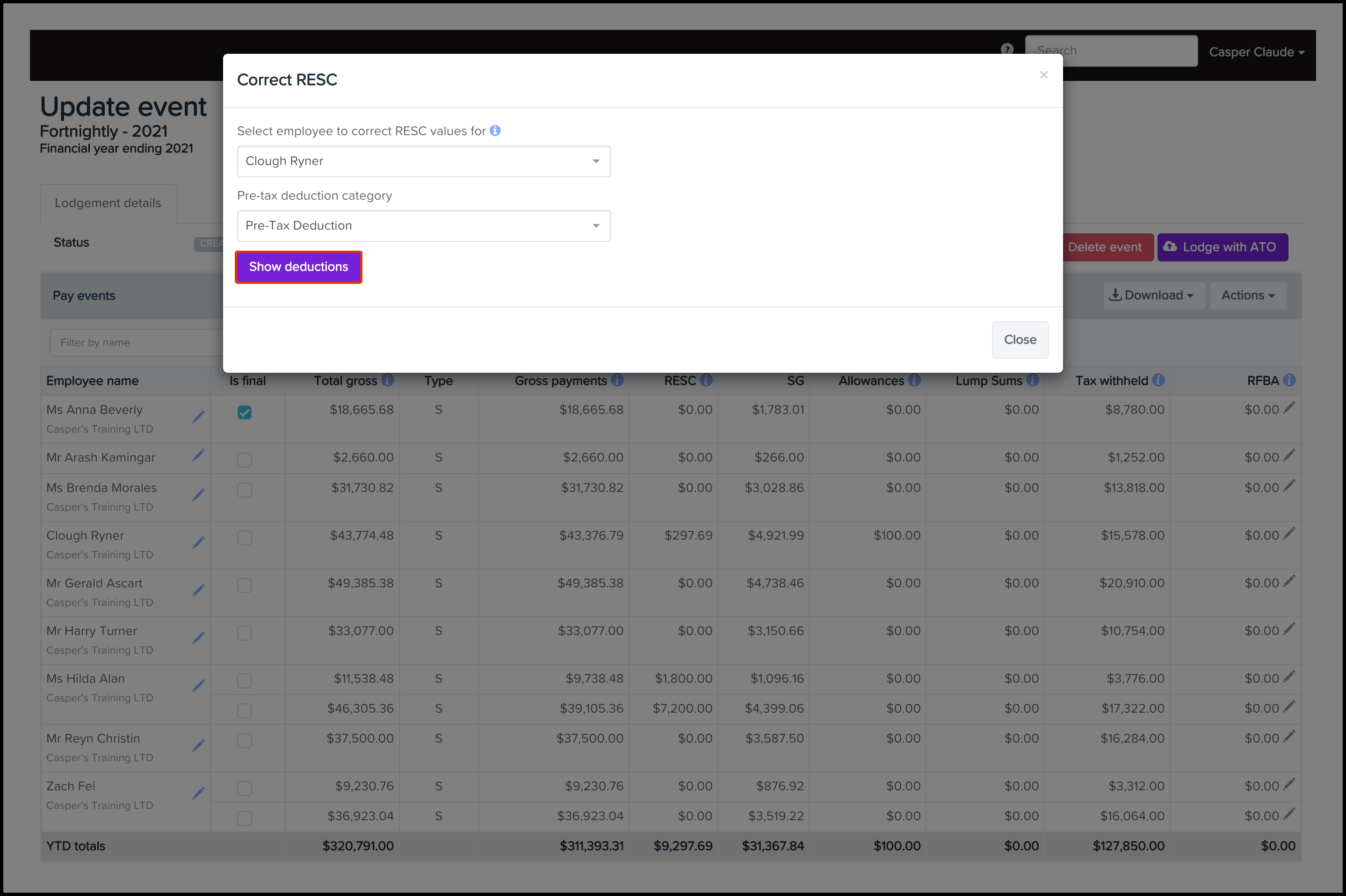 The Correct RESC Values feature will only be available for FY21/22 and previous STP events. On November 4th, 2020, we changed the RESC deduction category. We did this to help users avoid wrongly adding RESC deductions to anything other than a super fund.