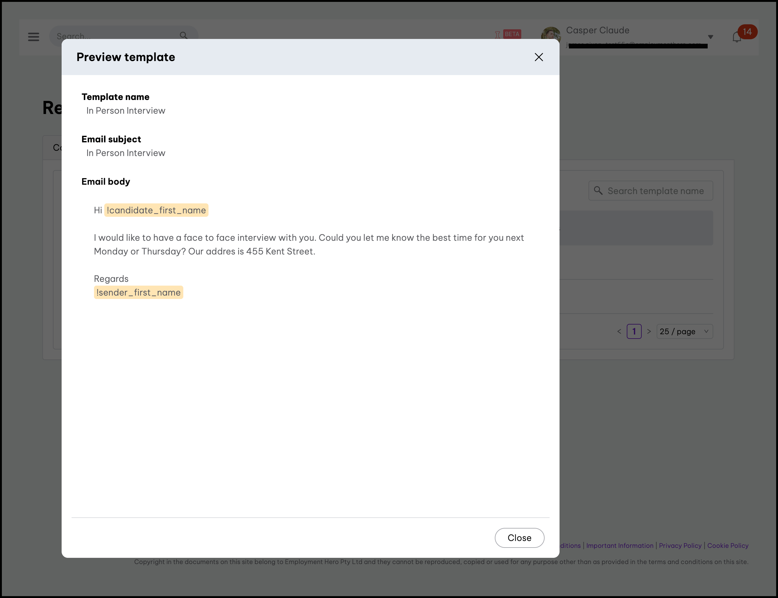 ⓘ Don't have access to this feature? Contact our friendly sales team here if you’d like to upgrade your account to gain access to recruitment email templates with Employment Hero today.