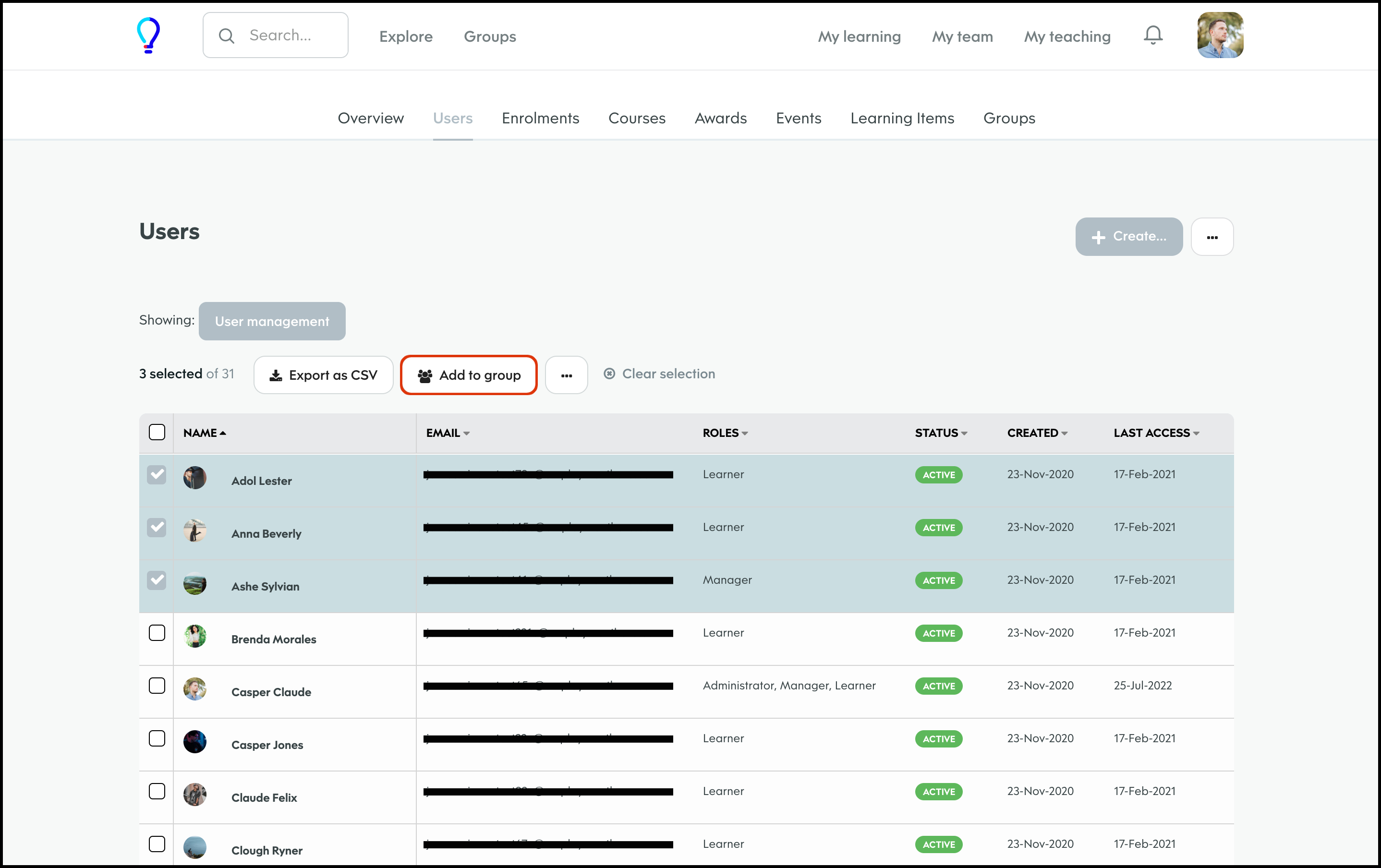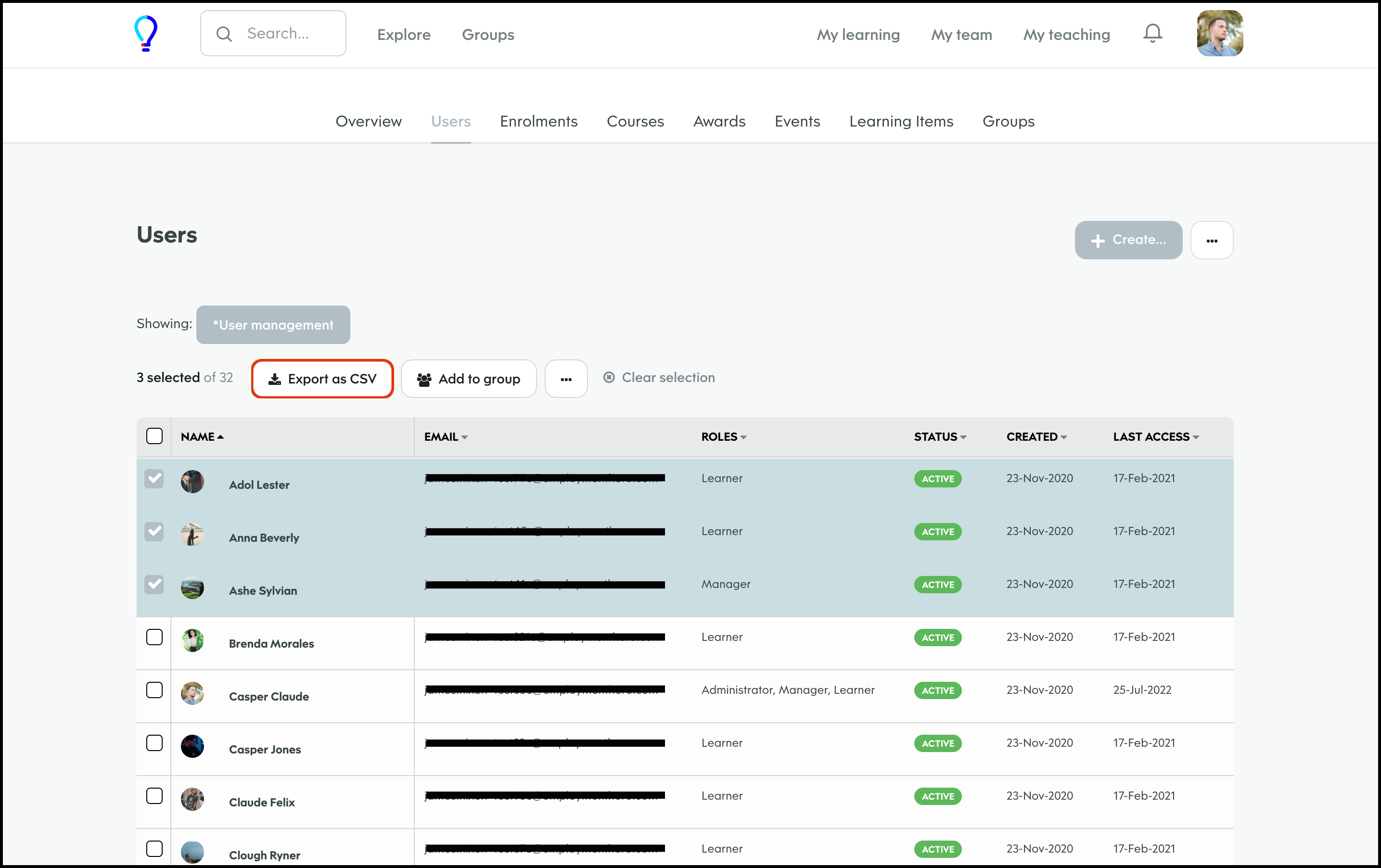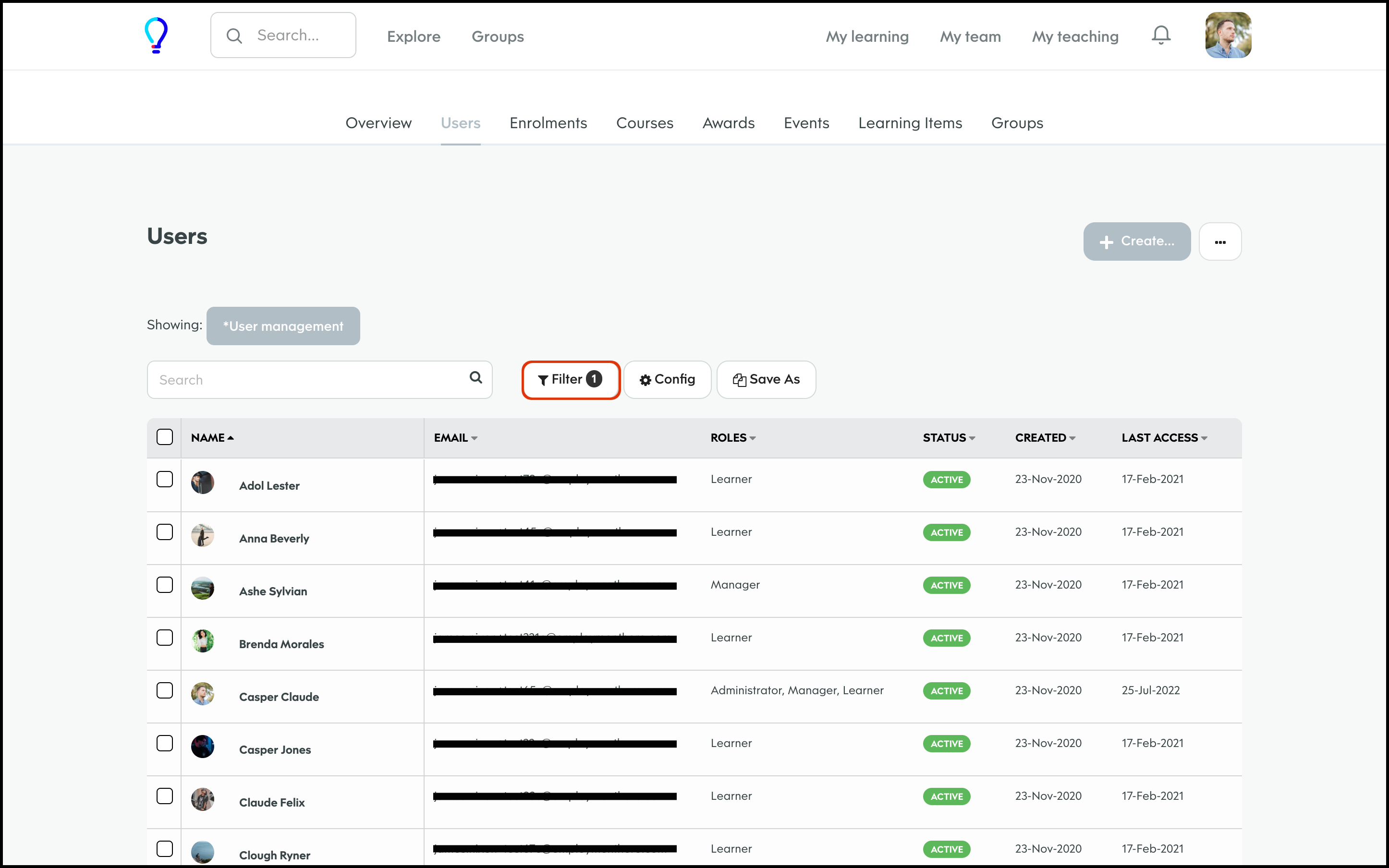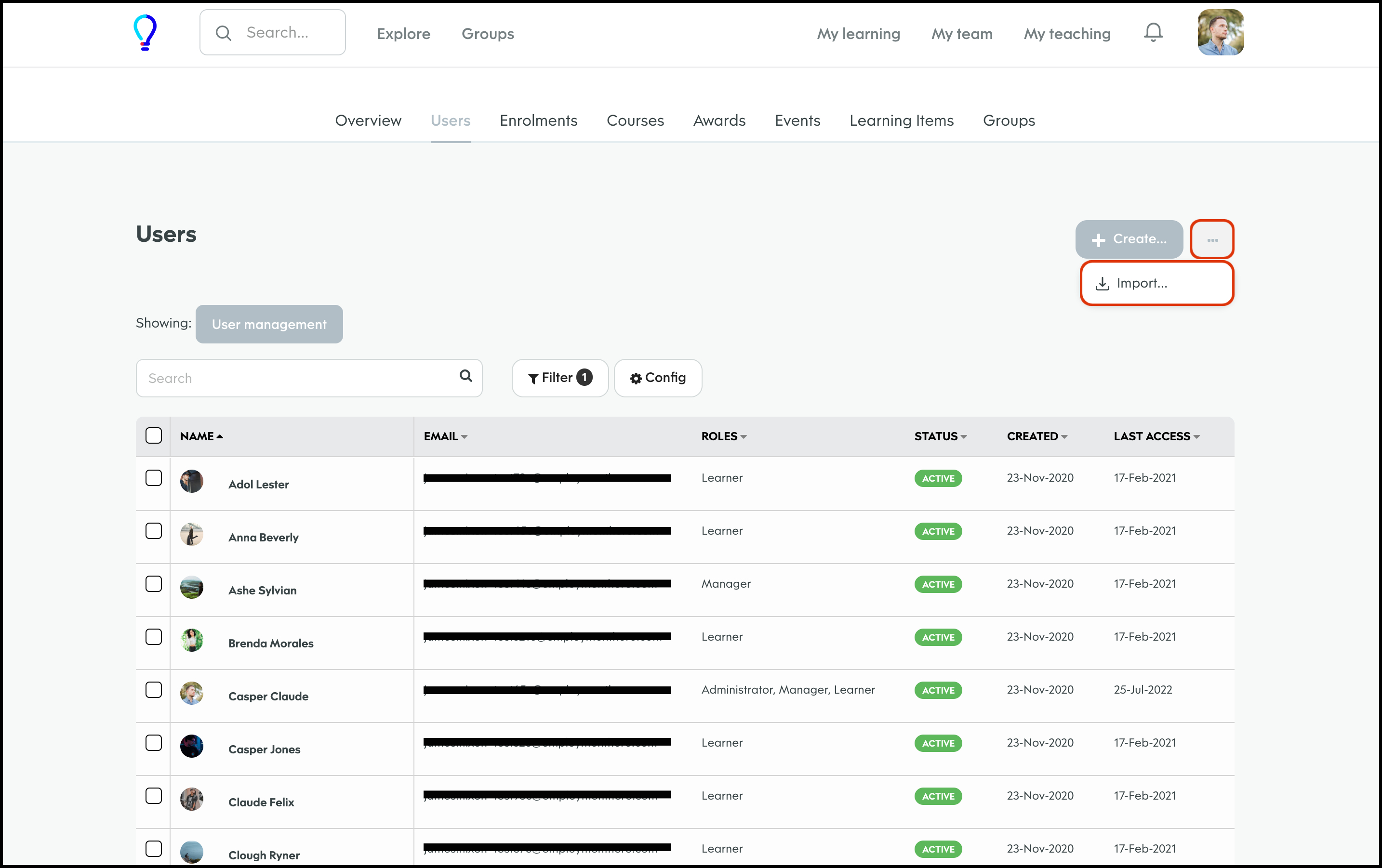 The User Management feature allows you to create a new user, and specify details such as their access level, name, and email and then add them to any required learning groups. You can also refine the data shown on your page via the Filter feature, to ensure you only see the data you need to see. Finally, you can choose to import your user data in bulk, export your user data if you need an external record, and edit any information if it changes.