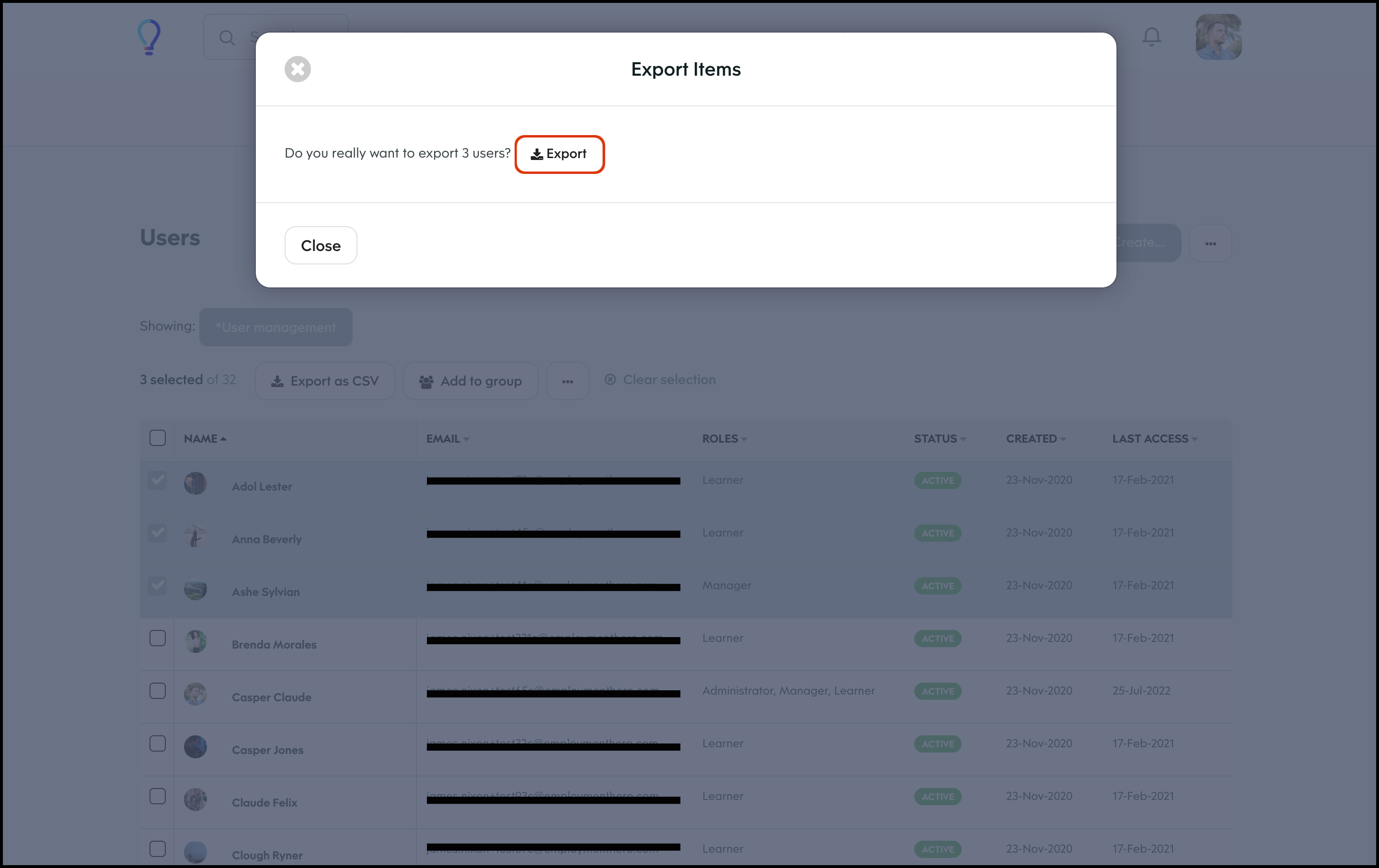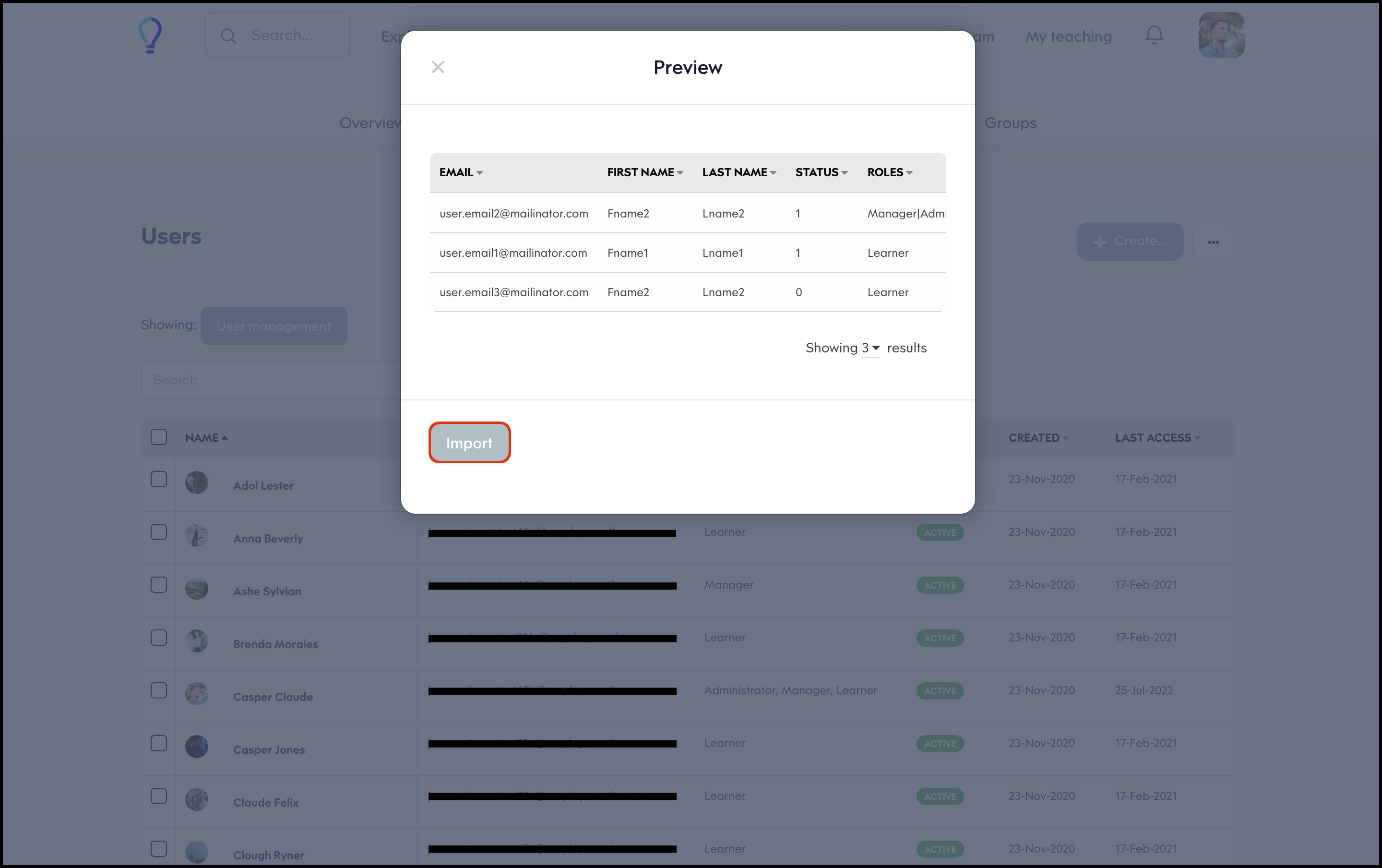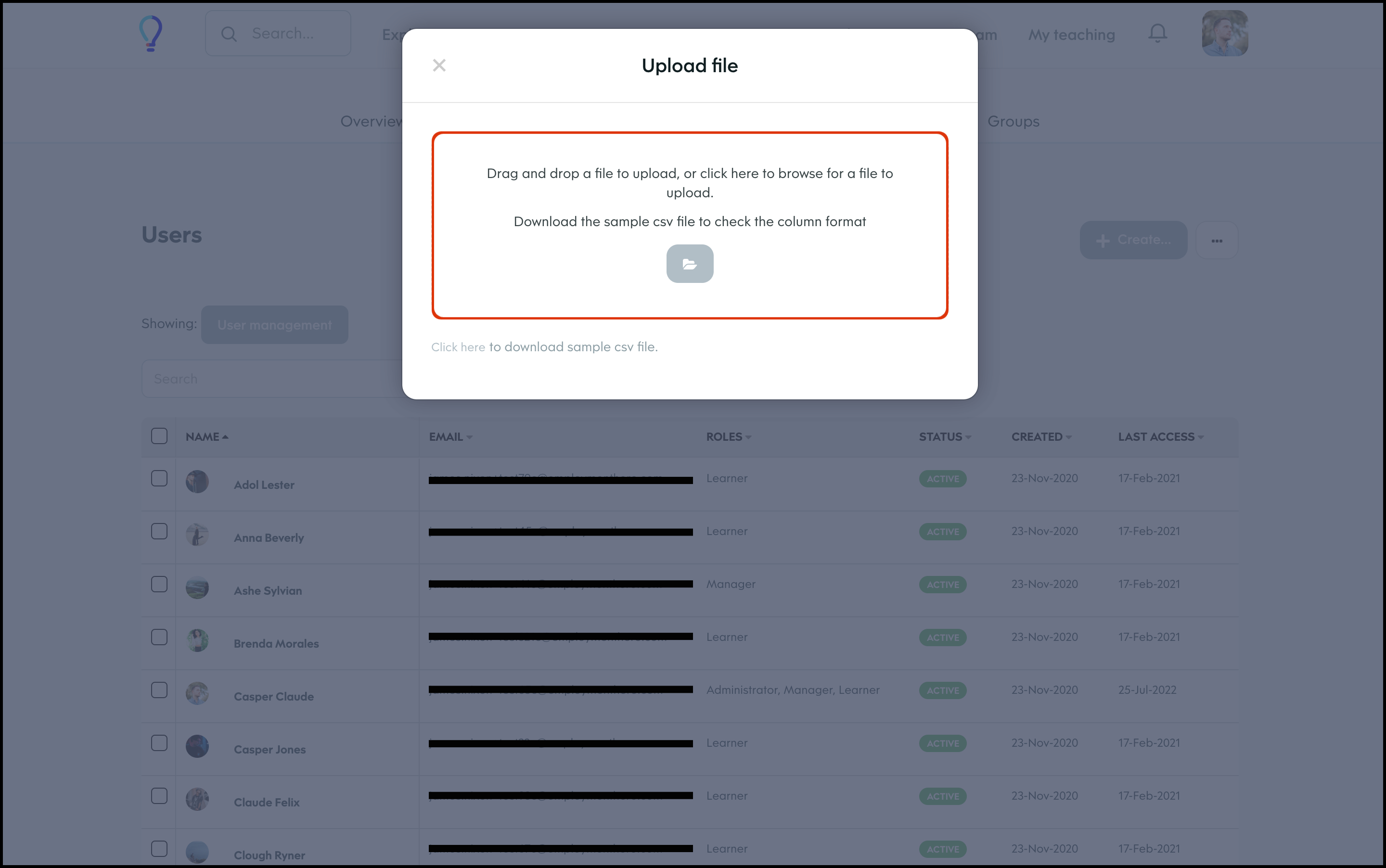 The User Management feature allows you to create a new user, and specify details such as their access level, name, and email and then add them to any required learning groups. You can also refine the data shown on your page via the Filter feature, to ensure you only see the data you need to see. Finally, you can choose to import your user data in bulk, export your user data if you need an external record, and edit any information if it changes.