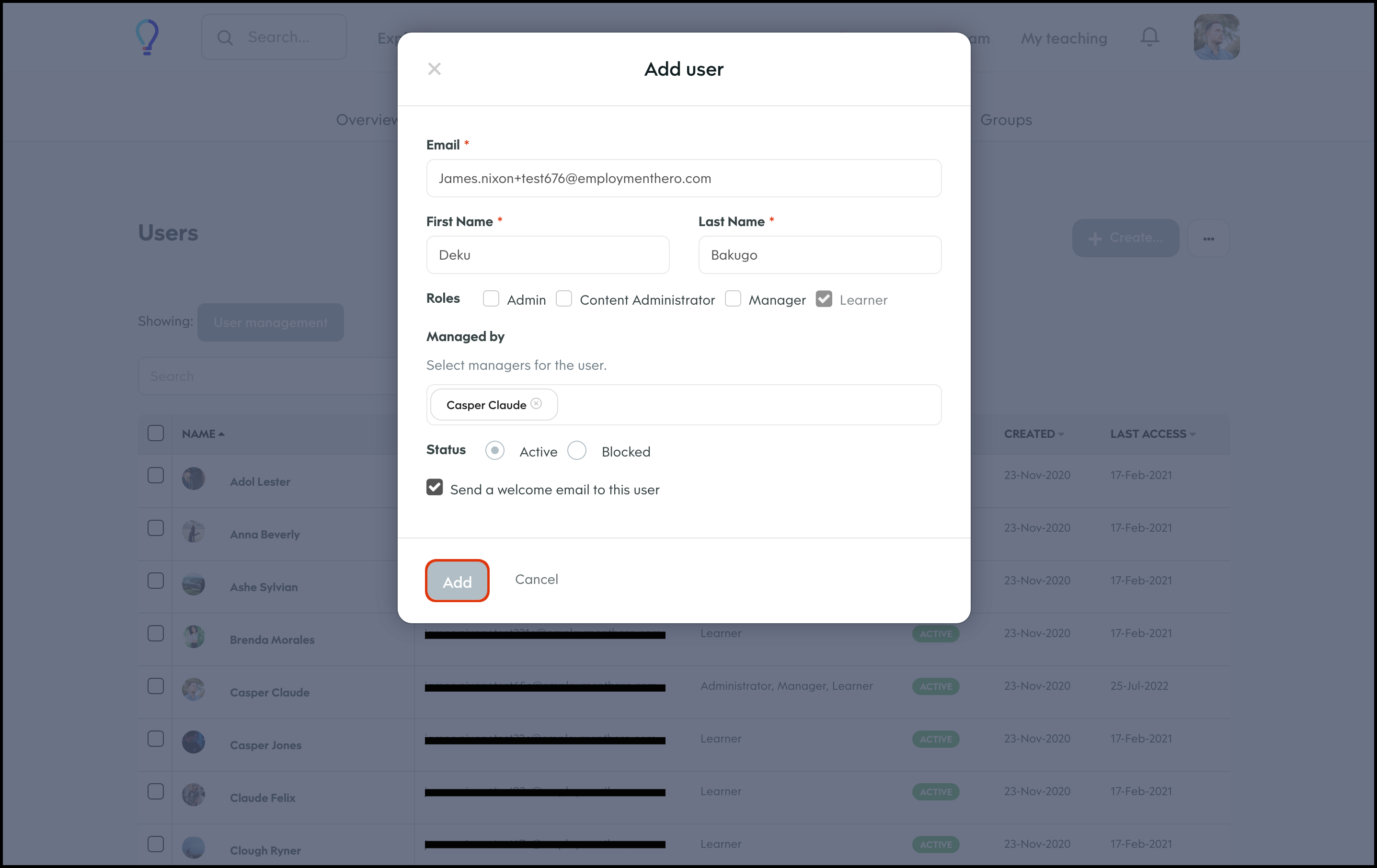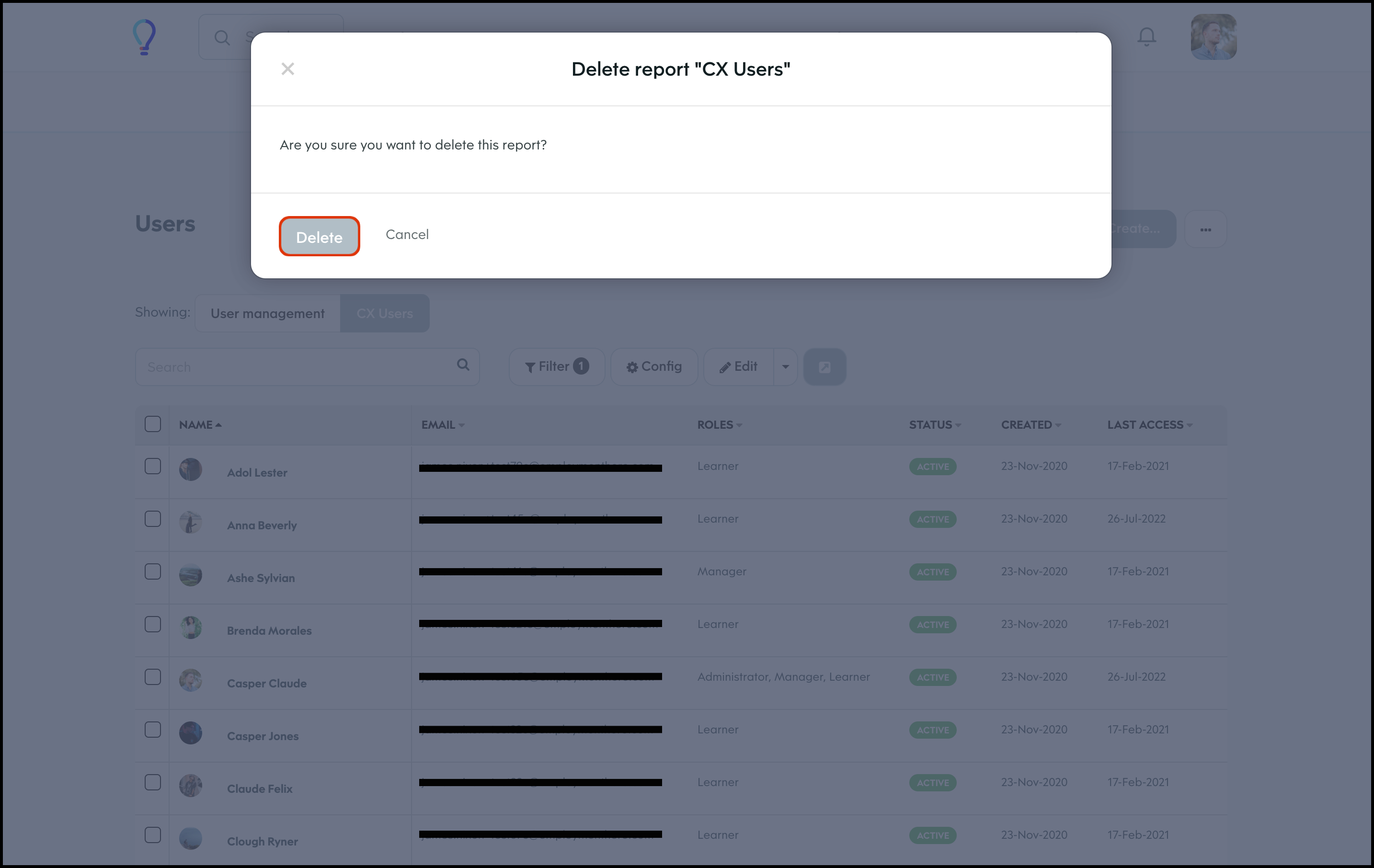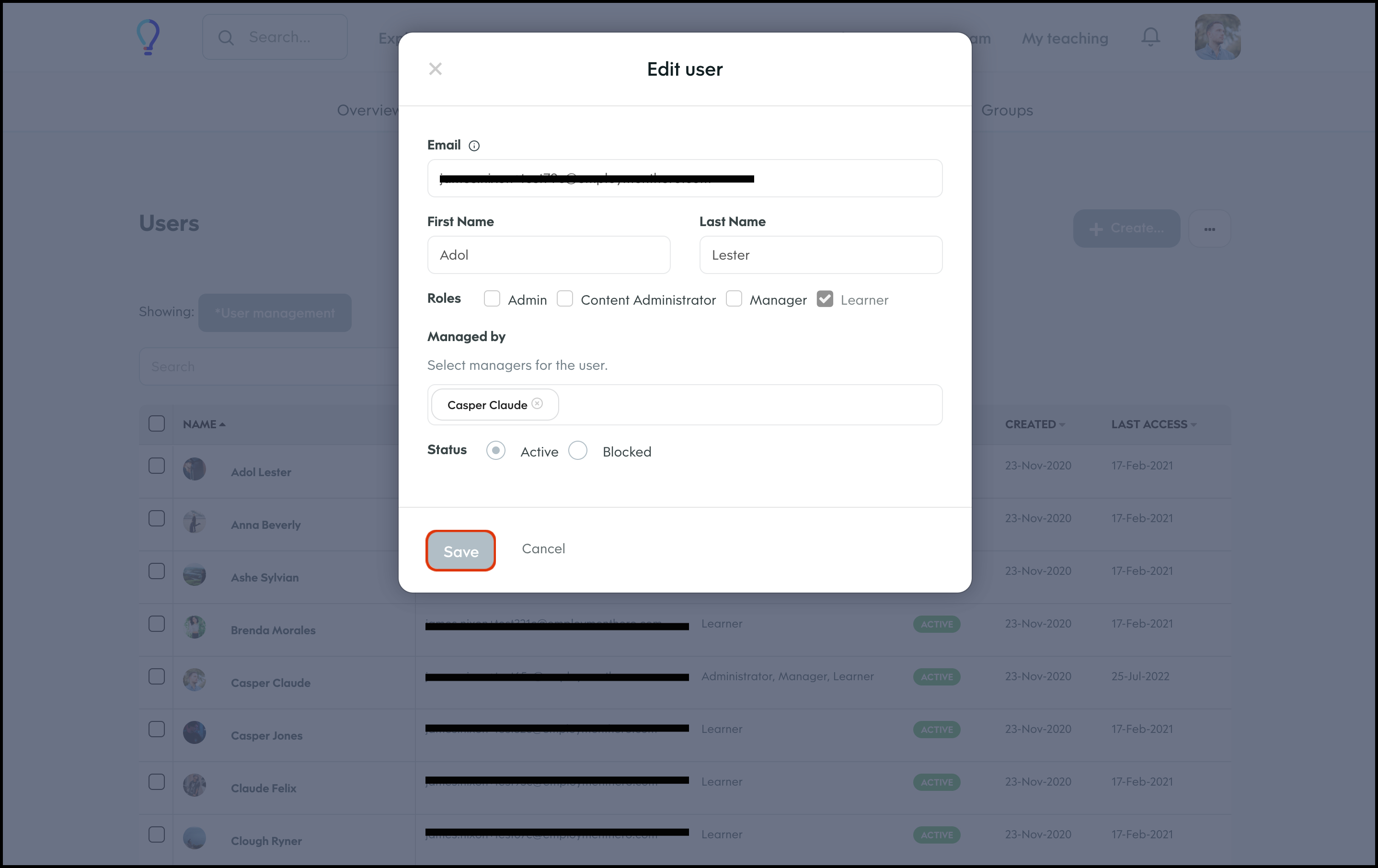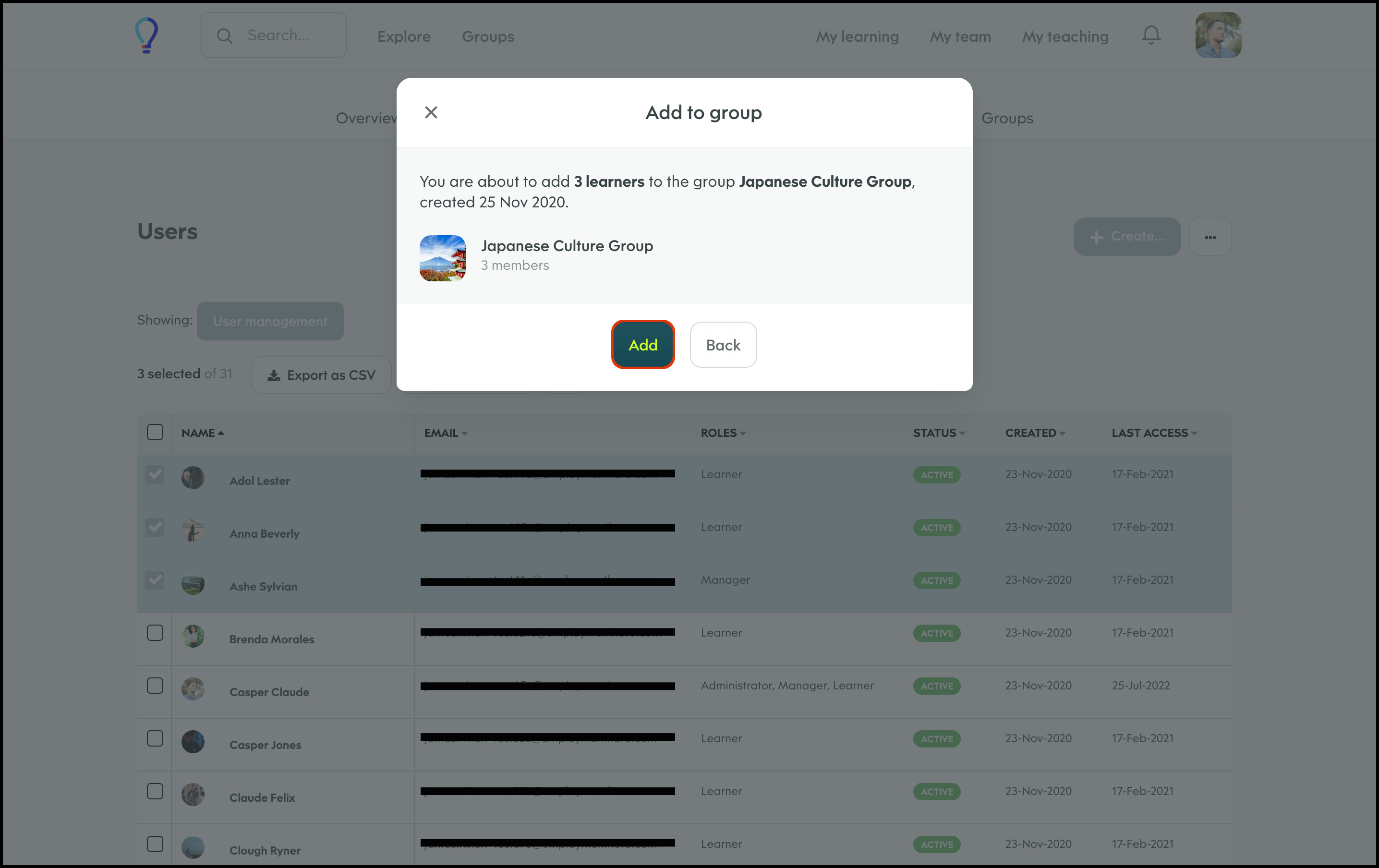 The User Management feature allows you to create a new user, and specify details such as their access level, name, and email and then add them to any required learning groups. You can also refine the data shown on your page via the Filter feature, to ensure you only see the data you need to see. Finally, you can choose to import your user data in bulk, export your user data if you need an external record, and edit any information if it changes.
