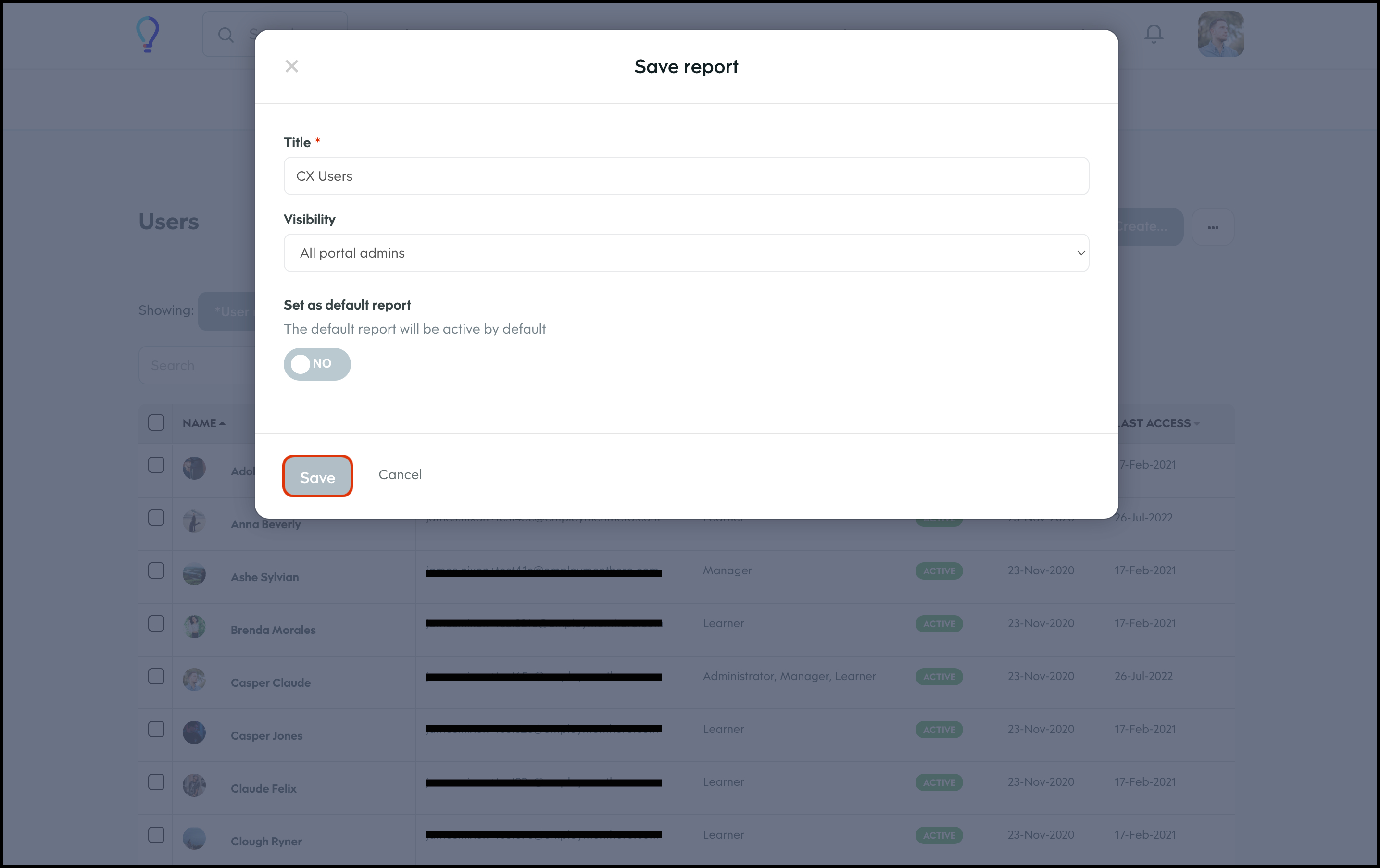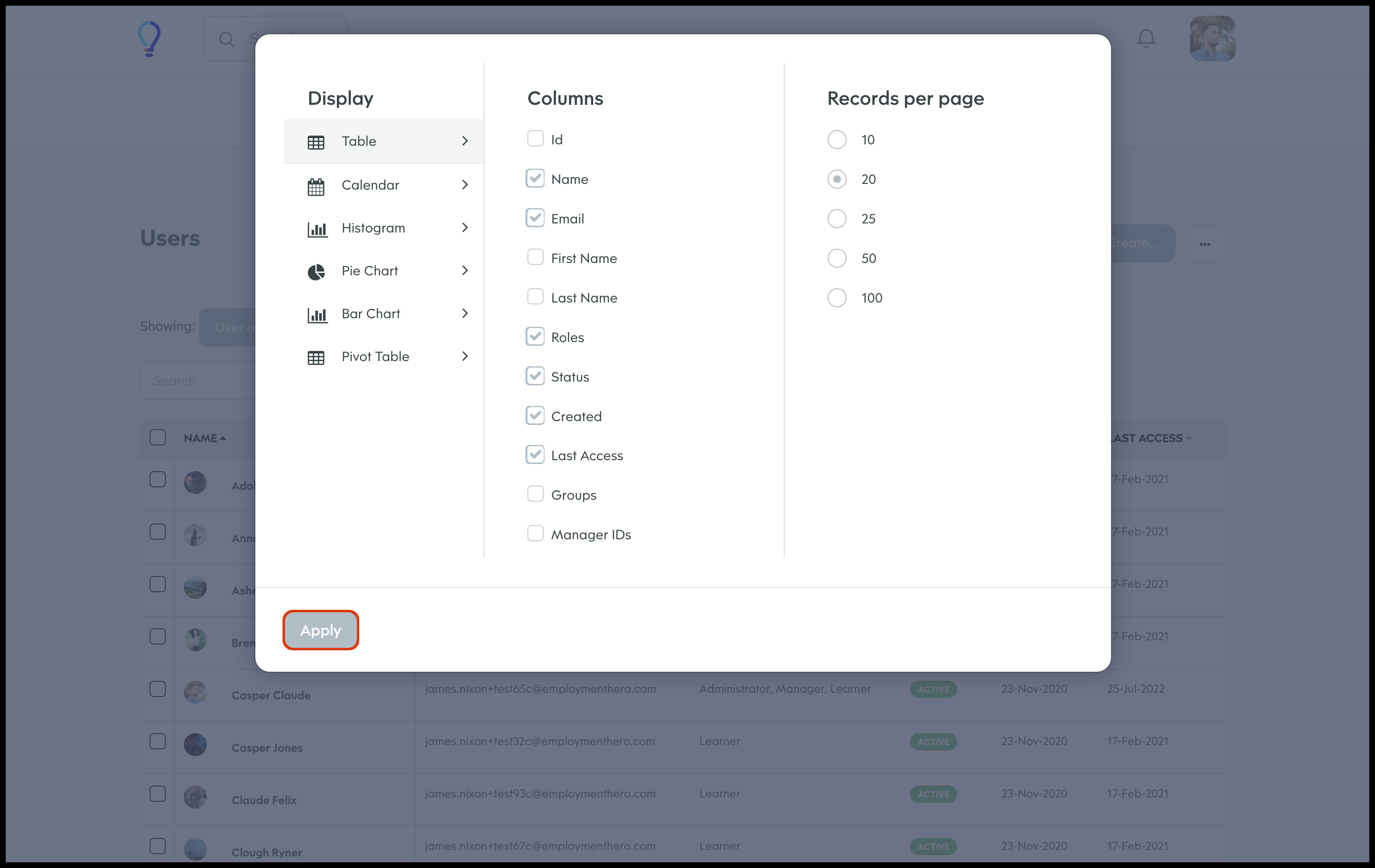 The User Management section allows you to create a customised page display whereby you can choose to have the data laid out differently, for example, as a table, calendar or histogram. You can also customise what columns to include in each of these layouts and then can save this view so you can access it again at a later date. Finally, you can share this custom view with others on your learning platform, edit the information if it changes, and delete a record if it is no longer relevant.