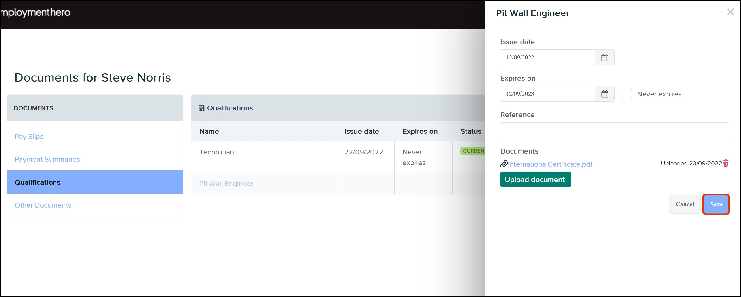 The Employee Portal module lets you add qualifications to employees, like the issue date, expiry date, and supporting documents or reference notes. You would use qualifications to make sure only qualified employees work in a certain role and you would usually do this for safety reasons, like if an employee needs a working at heights qualification.