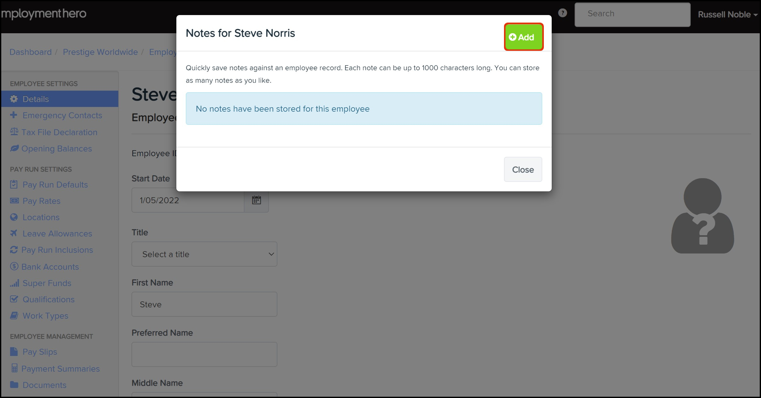 The following premise will walk you through how to add a note to an employee's file.