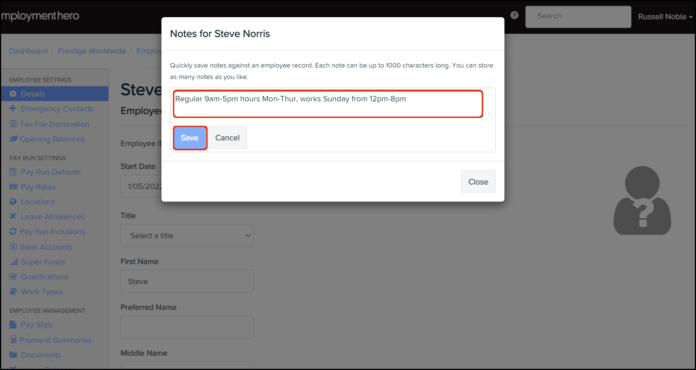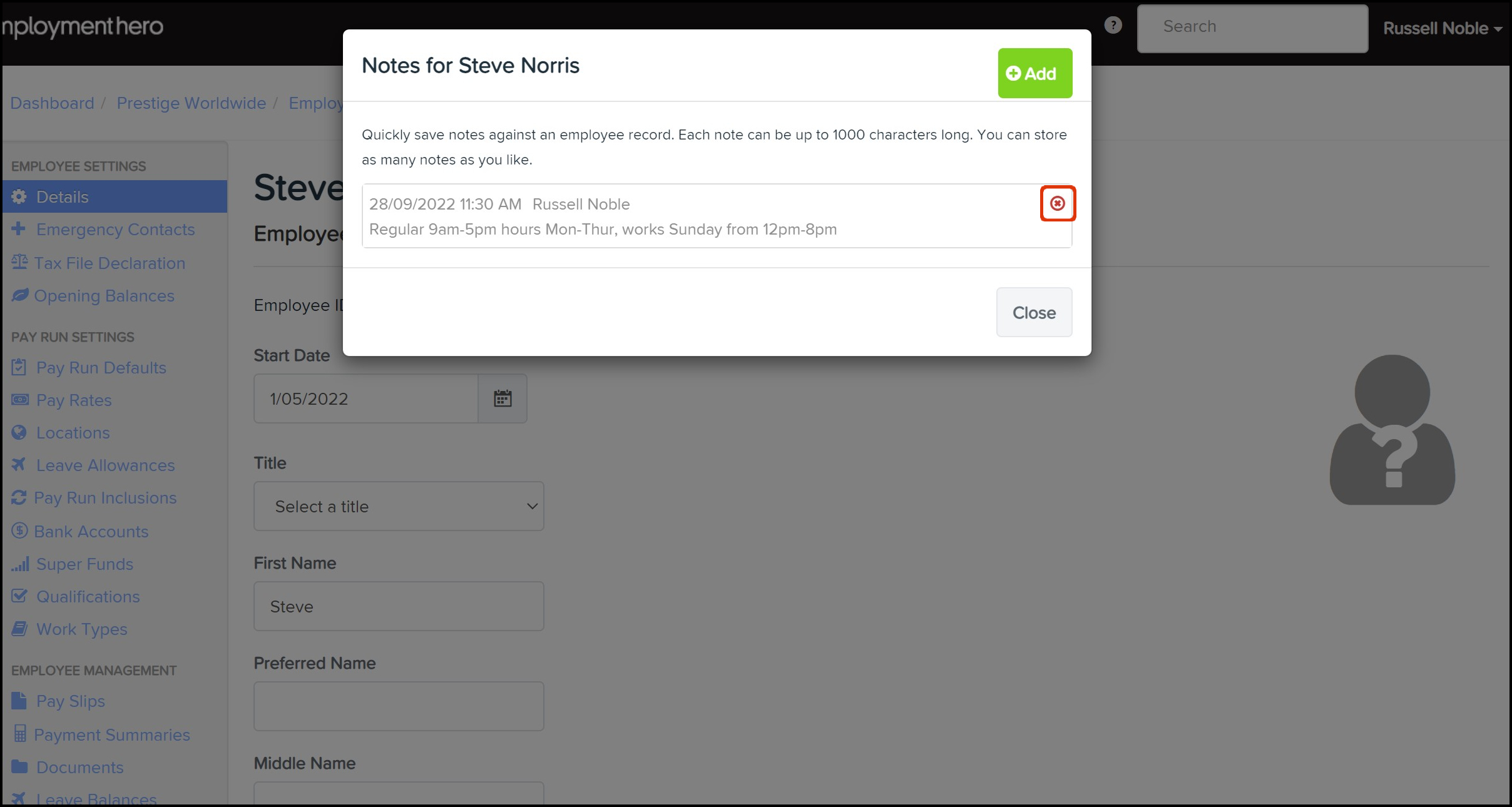 The Notes feature allows you to add a new note to the employee file and is a free text field, so you can easily add as much details as needed. You can also use this feature to delete a task if you have now completed the task associated with this employee's record.