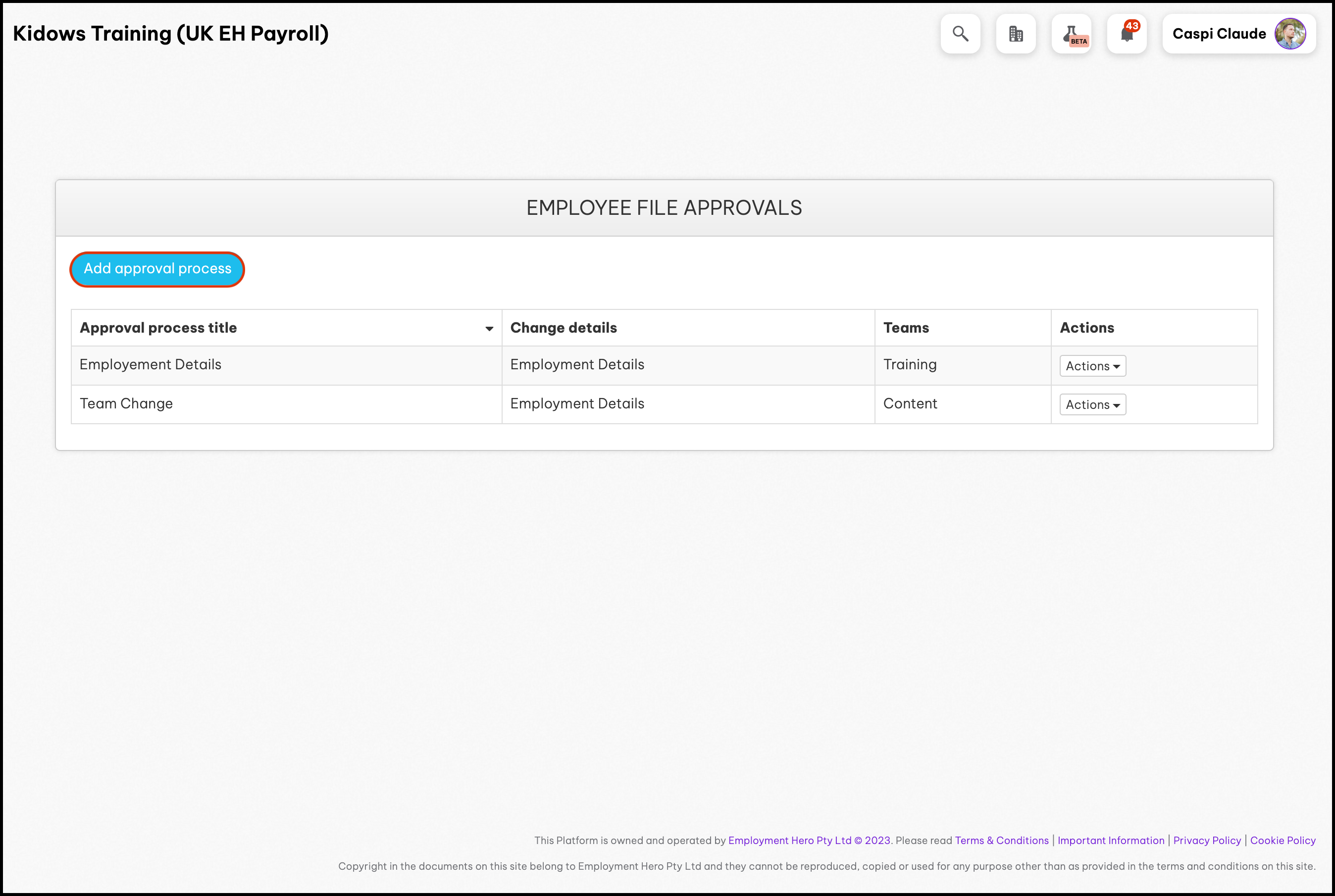 The new Employee File Change Approval Workflow has replaced this legacy version of Employee File Approval Processes found under settings. To learn how to create a Employee File Change Approval Workflow, see this article.The Employee File Approvals Set Up feature allows you to set up your organisation's employee file approval process and specify who can approve an employee file change on your HR platform. You can also use this feature to edit the process if it changes and remove an entry you no longer need.