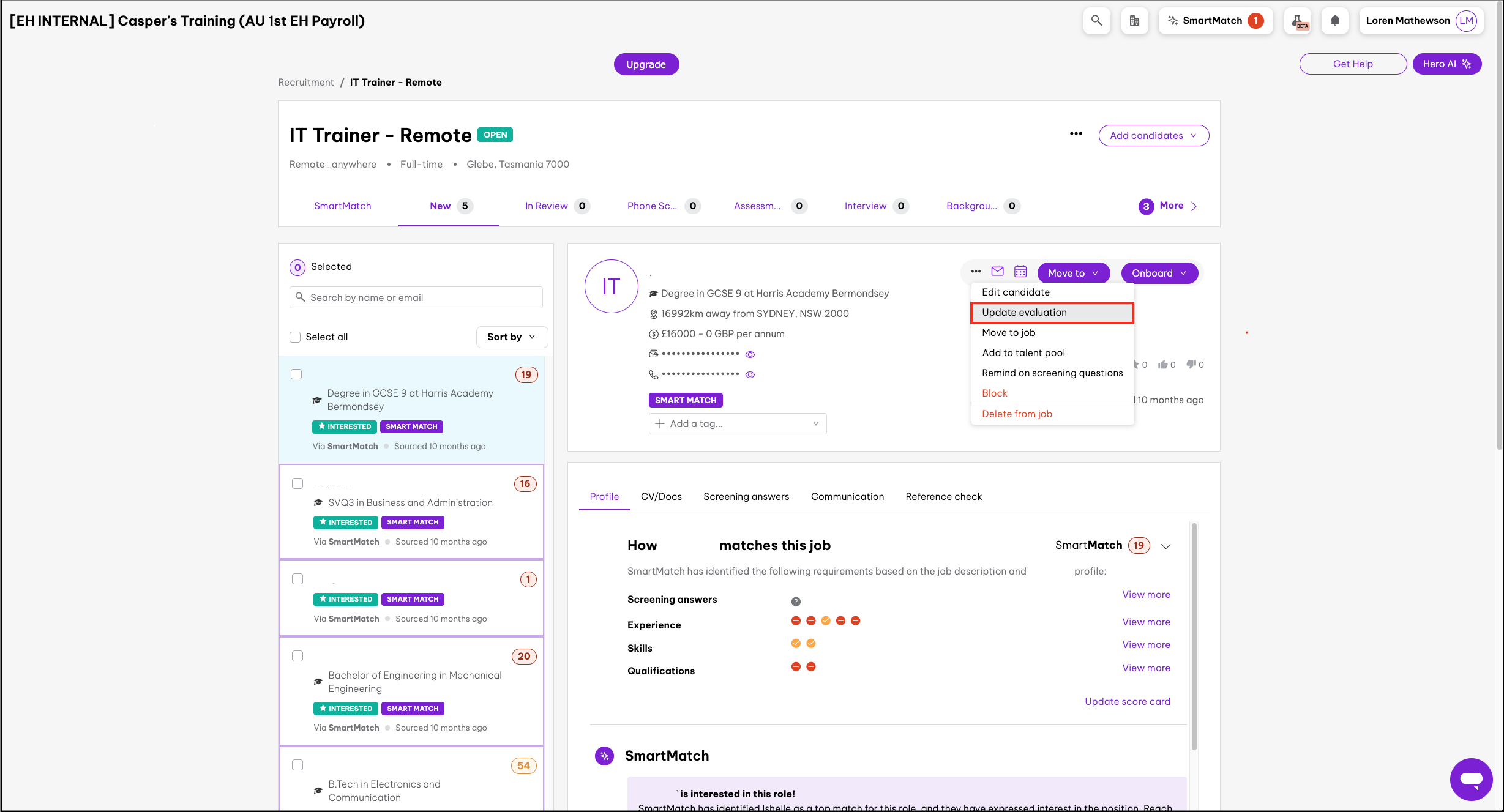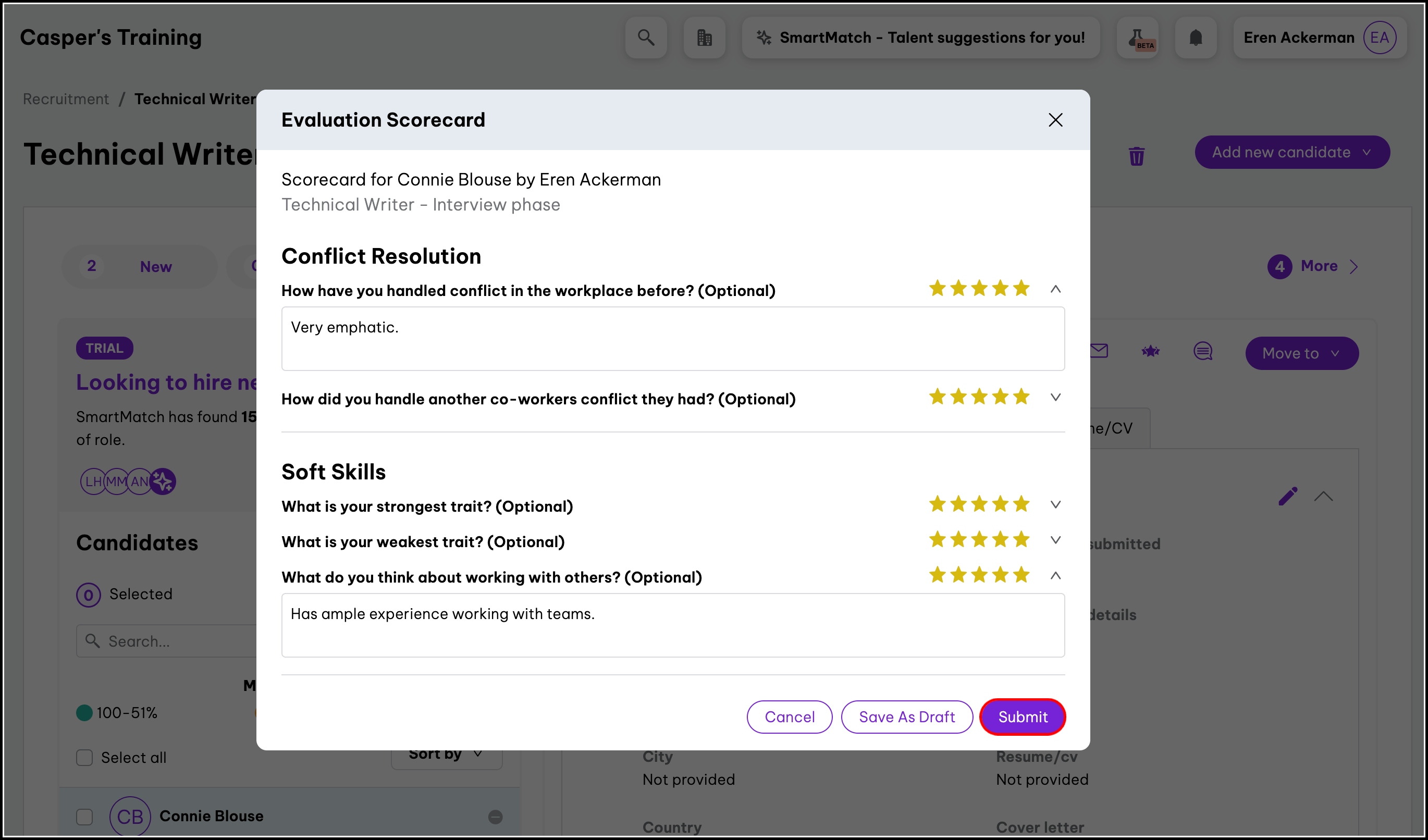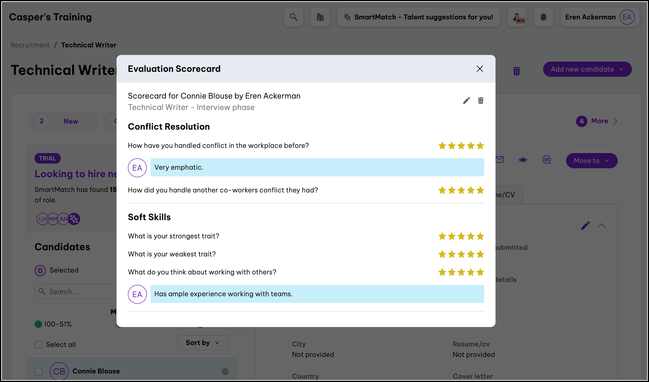 You can now see the candidate evaluation scorecard for this hiring phase.
