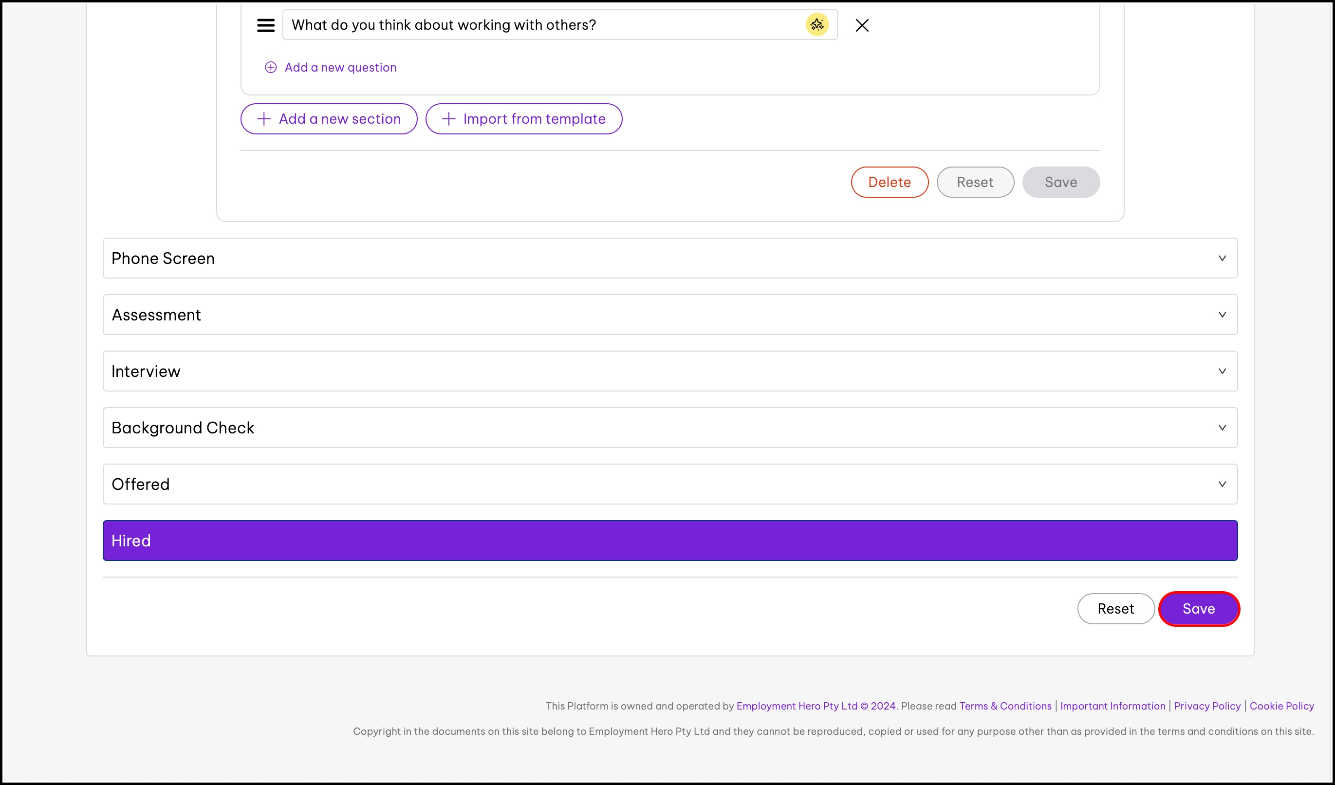 - Click the Save button to save the template for the hiring phase.