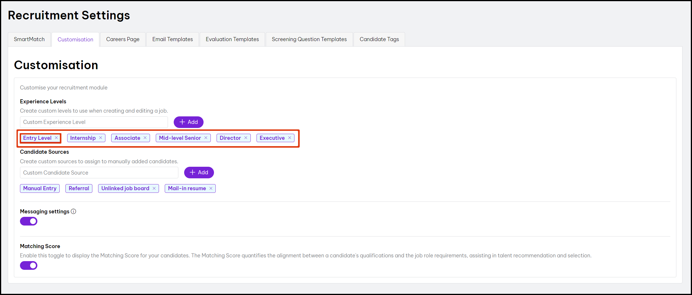 The Customization feature enables you to tailor the recruitment module to meet your organisation's specific needs. For example, you can add or remove experience levels to match job requirements, such as creating a JLPT N2 level for a Japanese translator role. Additionally, the Messaging feature allows direct communication with candidates from within the recruitment module.