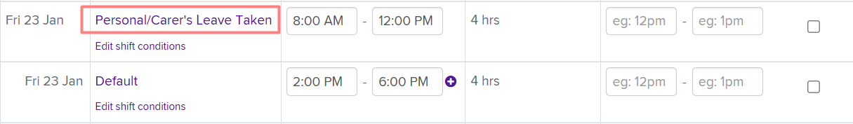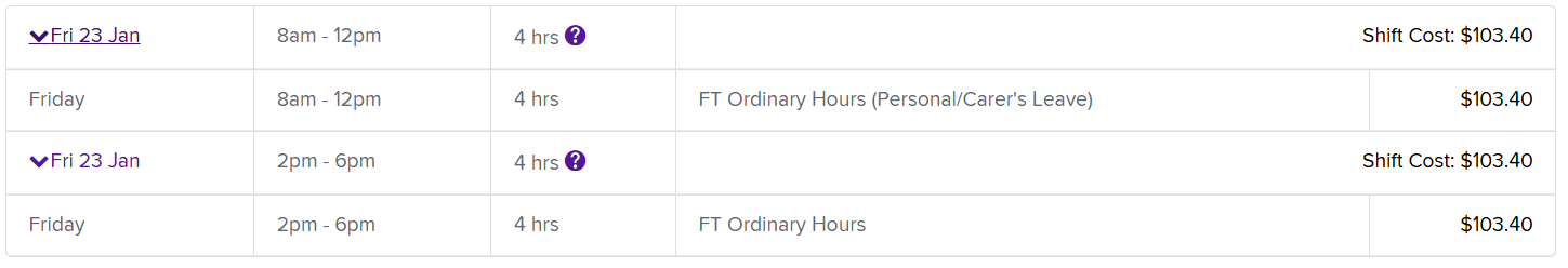 | 8 hour shift arrangement | Assign this tag to indicate that an employee’s shifts are rostered for up to 8 ordinary hours. |