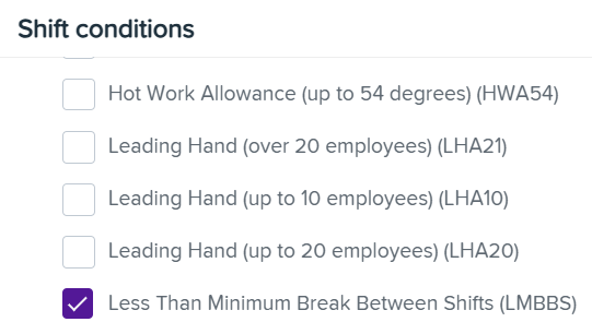 | Leading Hand (over 20 employees) | Choose this shift condition when an employee supervises more than 20 employees. |