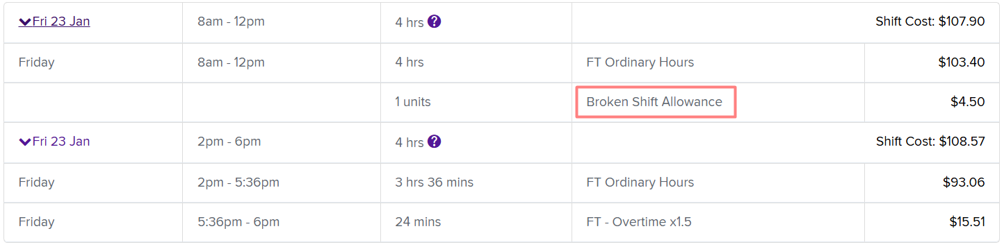 We've updated the Broken Shift Allowance rule across all rule sets, by introducing a work type "Broken Shift" to identify these shifts that satisfy the criteria for a broken shift as per the clause. Please ensure that this work type is selected on timesheets for the subsequent shift in order for the broken shift allowance to be paid accordingly. It is capped at 1 unit per day.