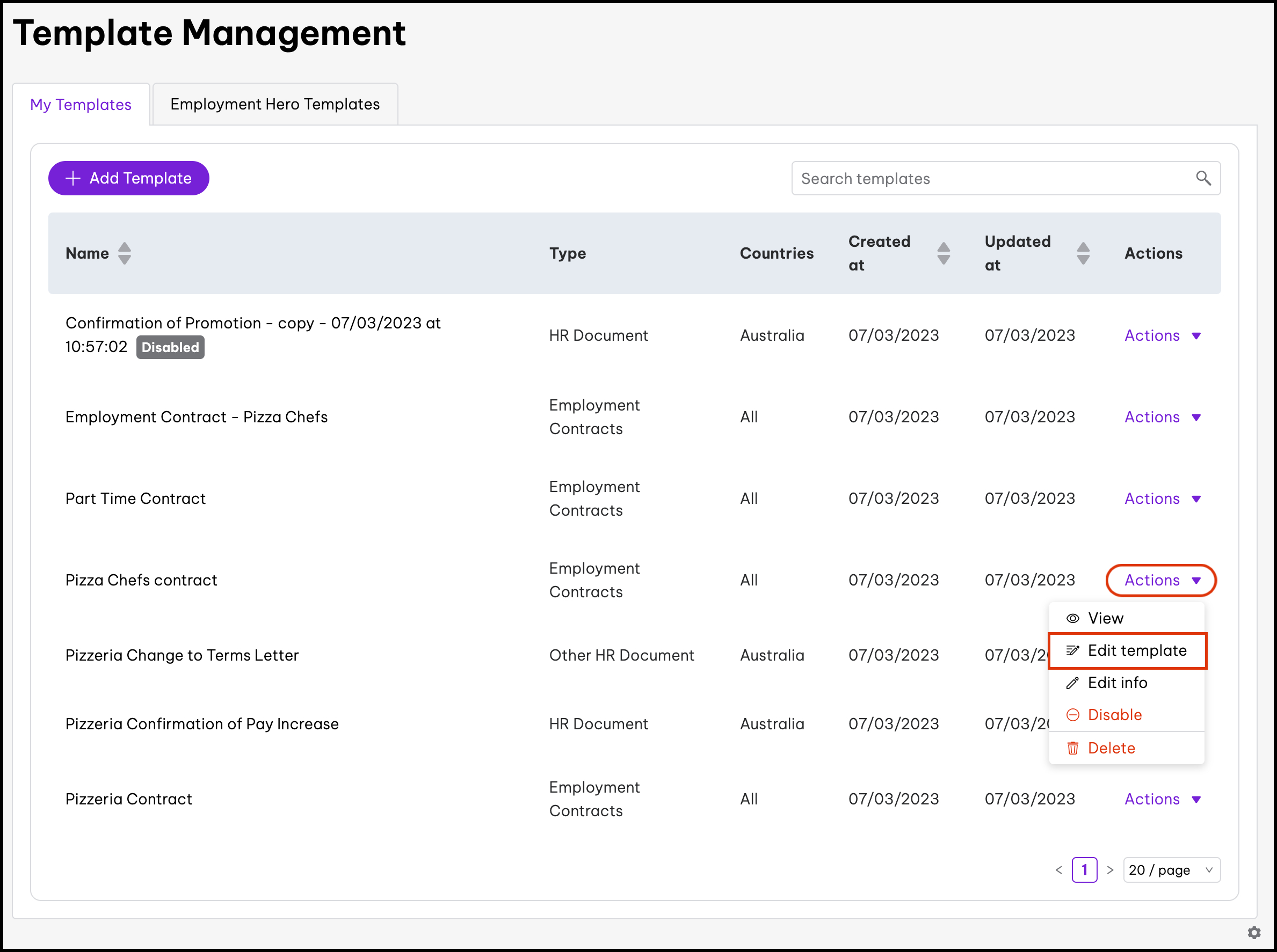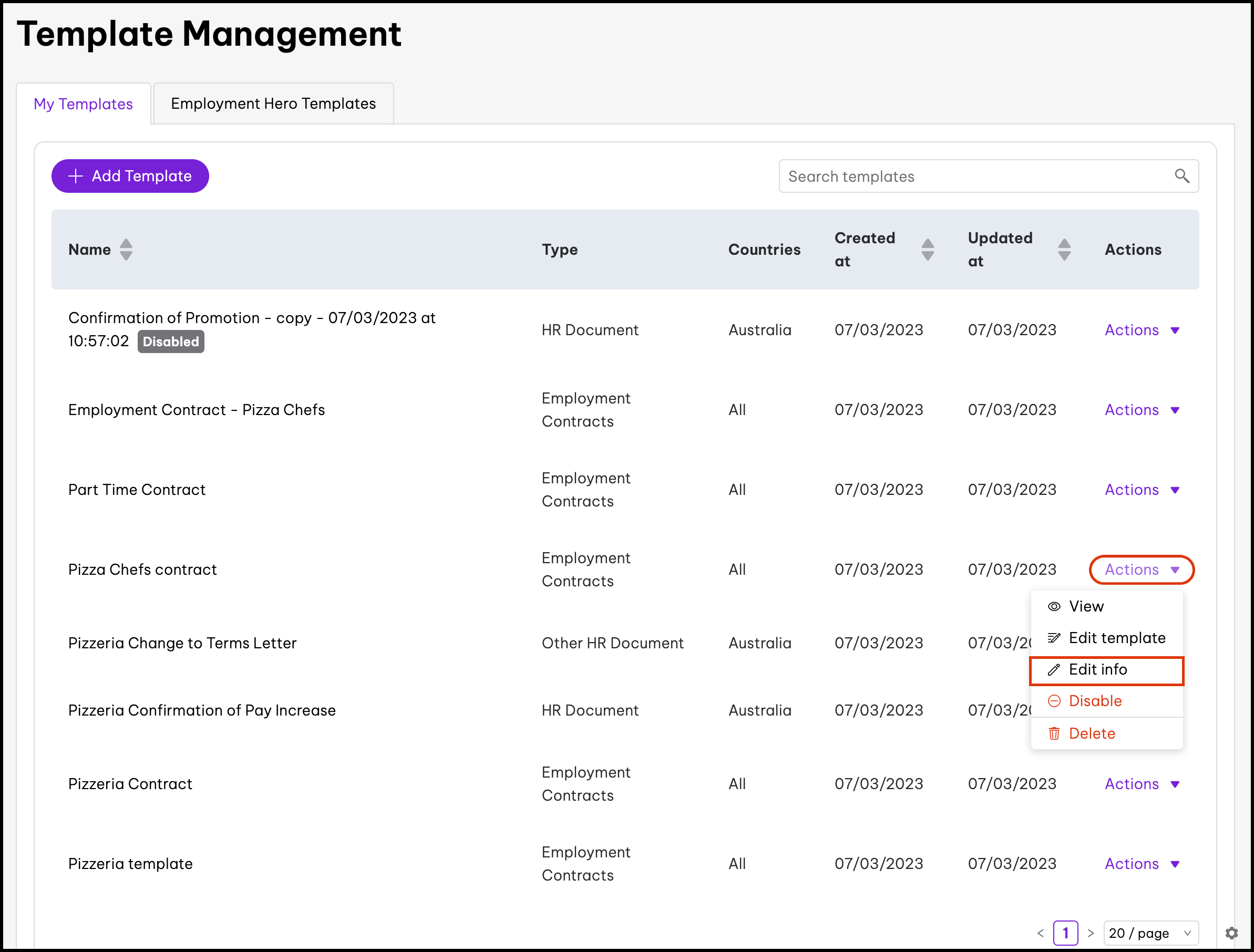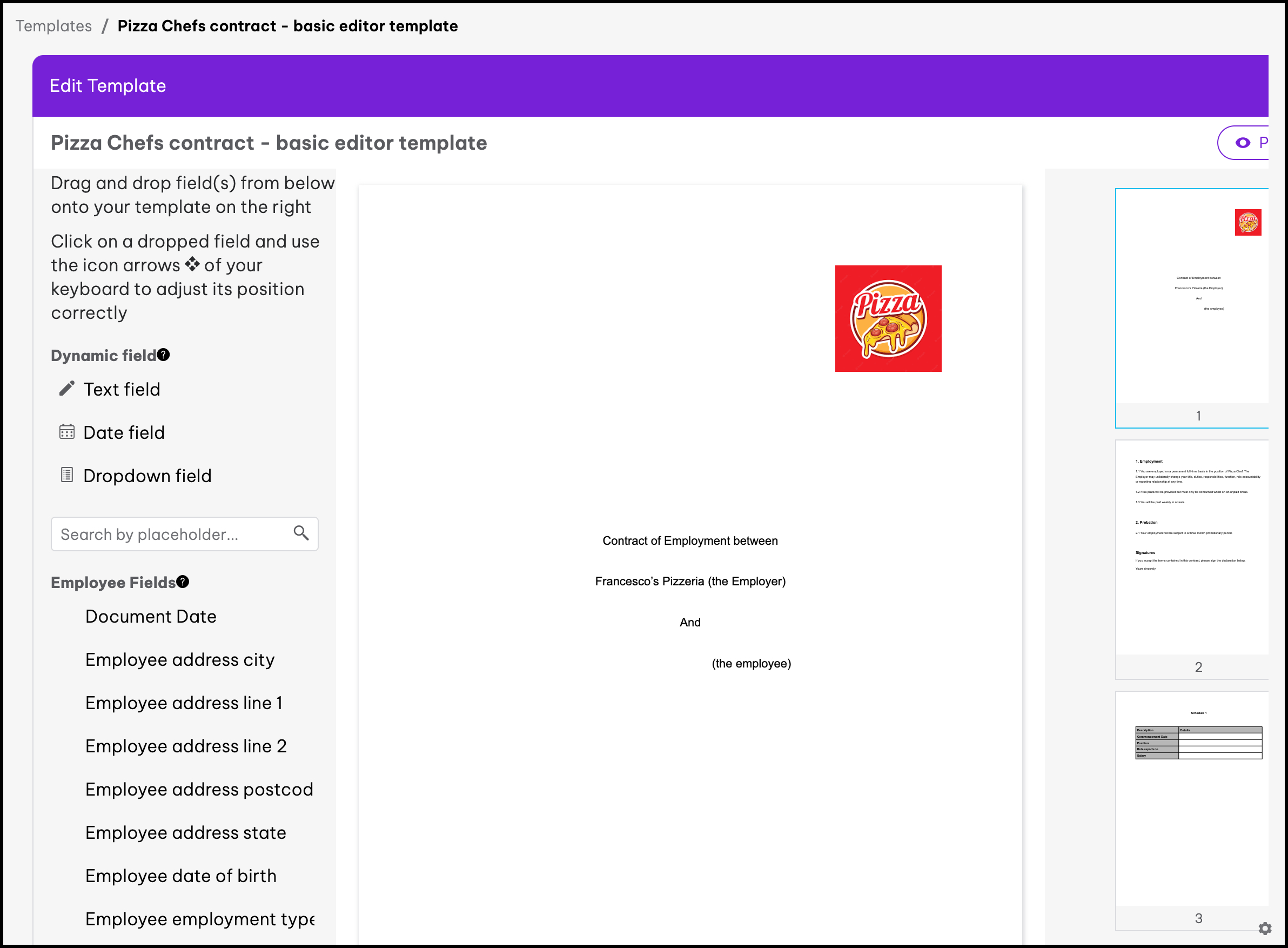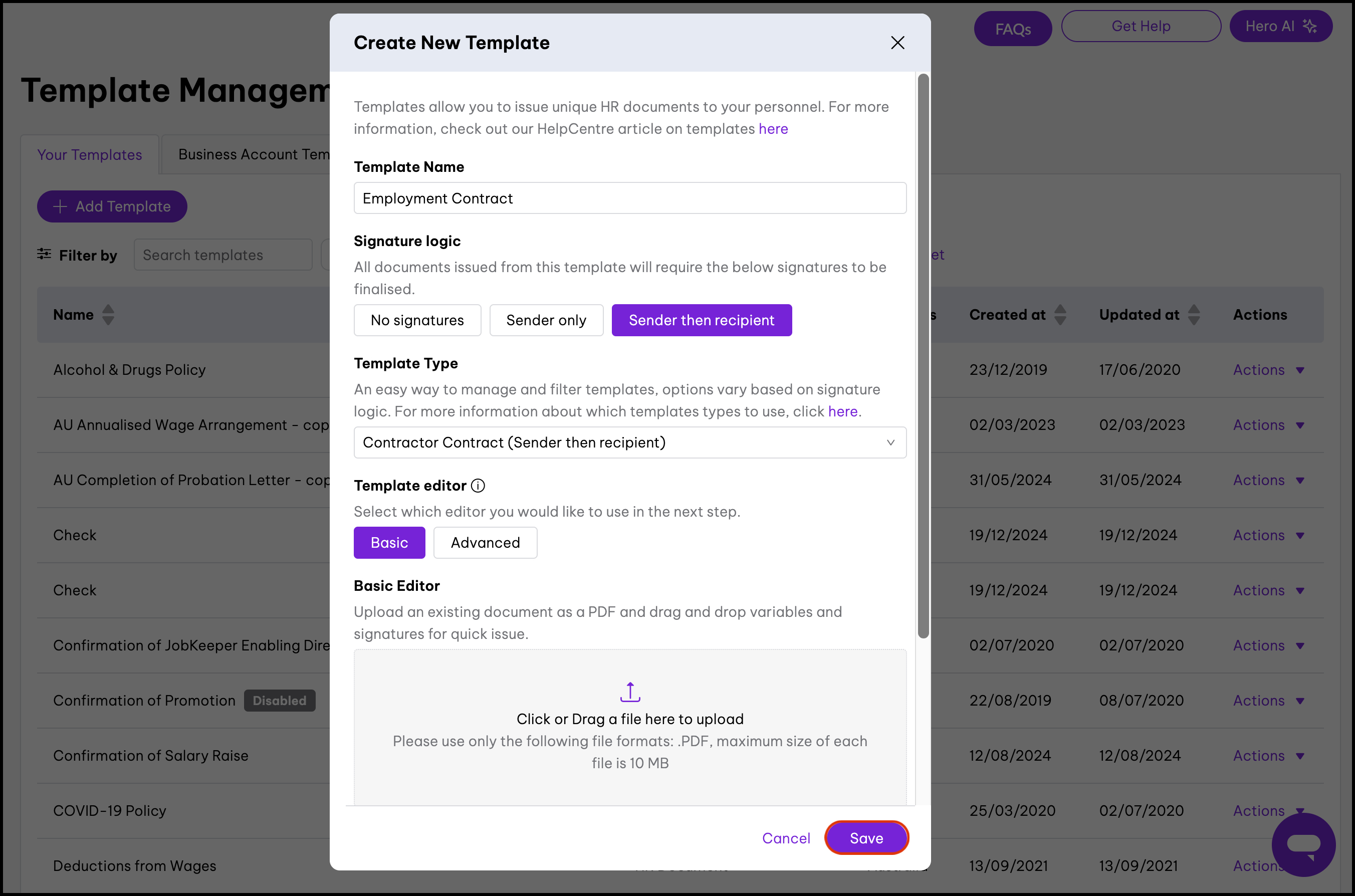 The basic template editor feature allows you to upload your PDF documents. You can then add in variables such as an employee's full name, job title, and probation length. The feature also includes the ability to disable documents, edit the information, and delete it if you created it in error. When using our basic template editor, you will not be able to clone a document.