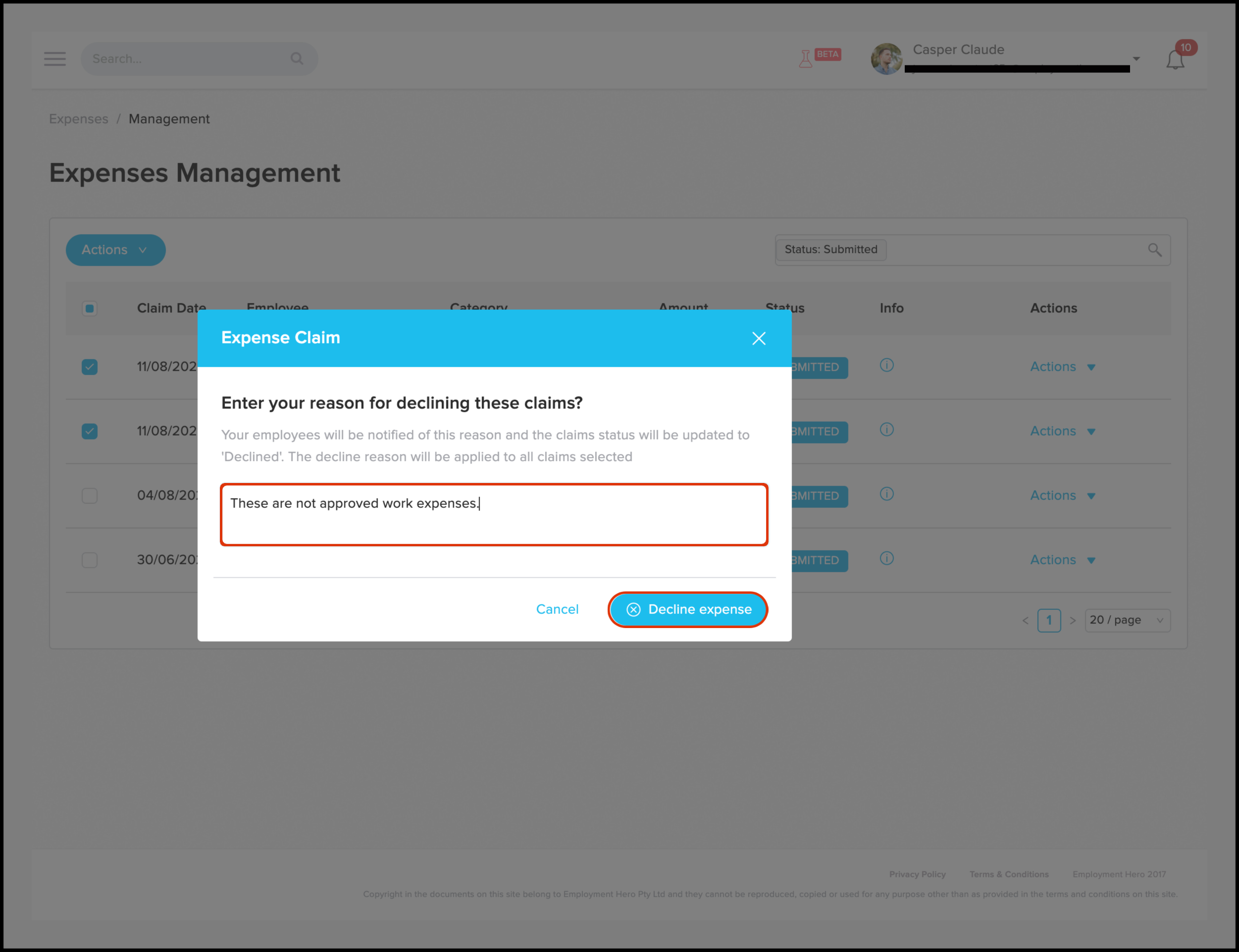 7. Click the Decline Expense button.