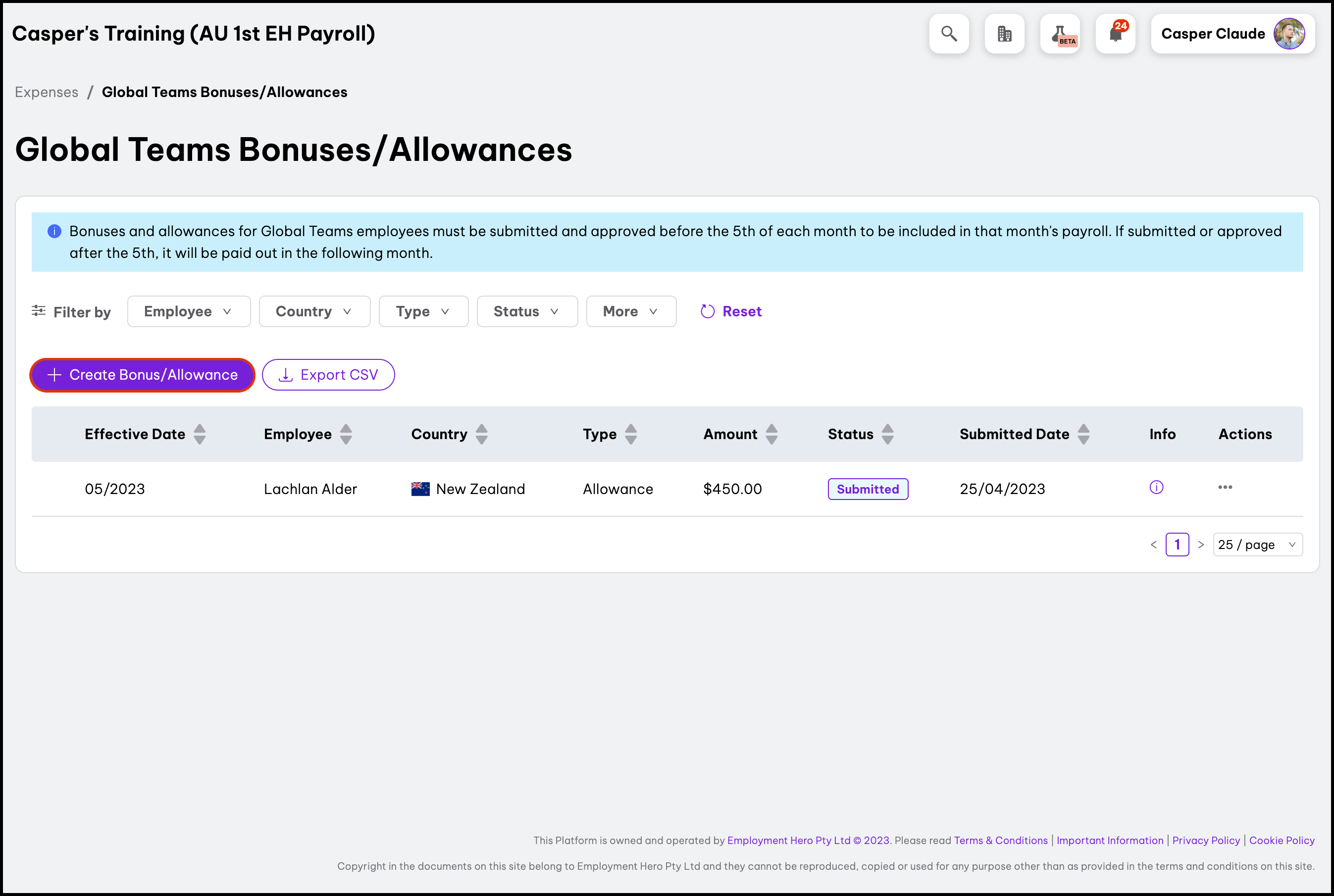 You must submit bonuses and allowances for HeroForce employees before the 5th of each month to include the payment in the month’s payroll. If you are submitting a bonus/allowance after the 5th, you will not be able to select the current month as the effective date.