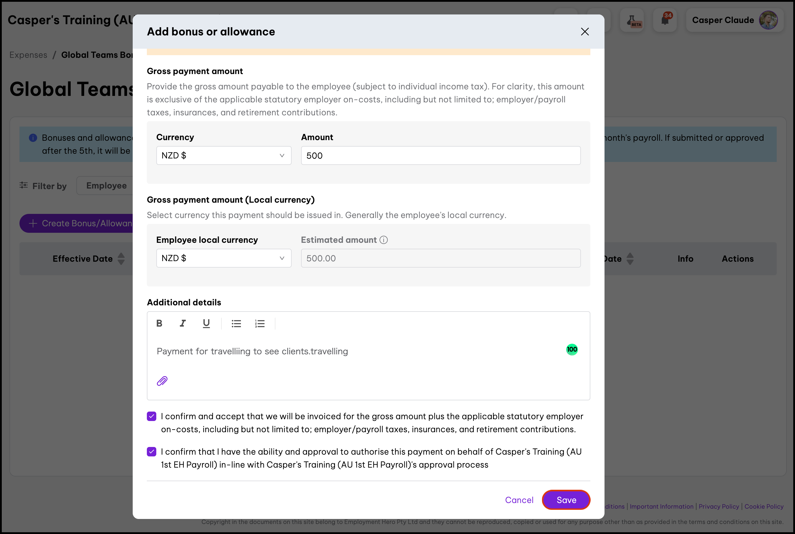 Organisation administrators with HeroForce employees can submit a recurring Bonus/Allowance in a similar way as a regular, one-off Bonus/Allowance.