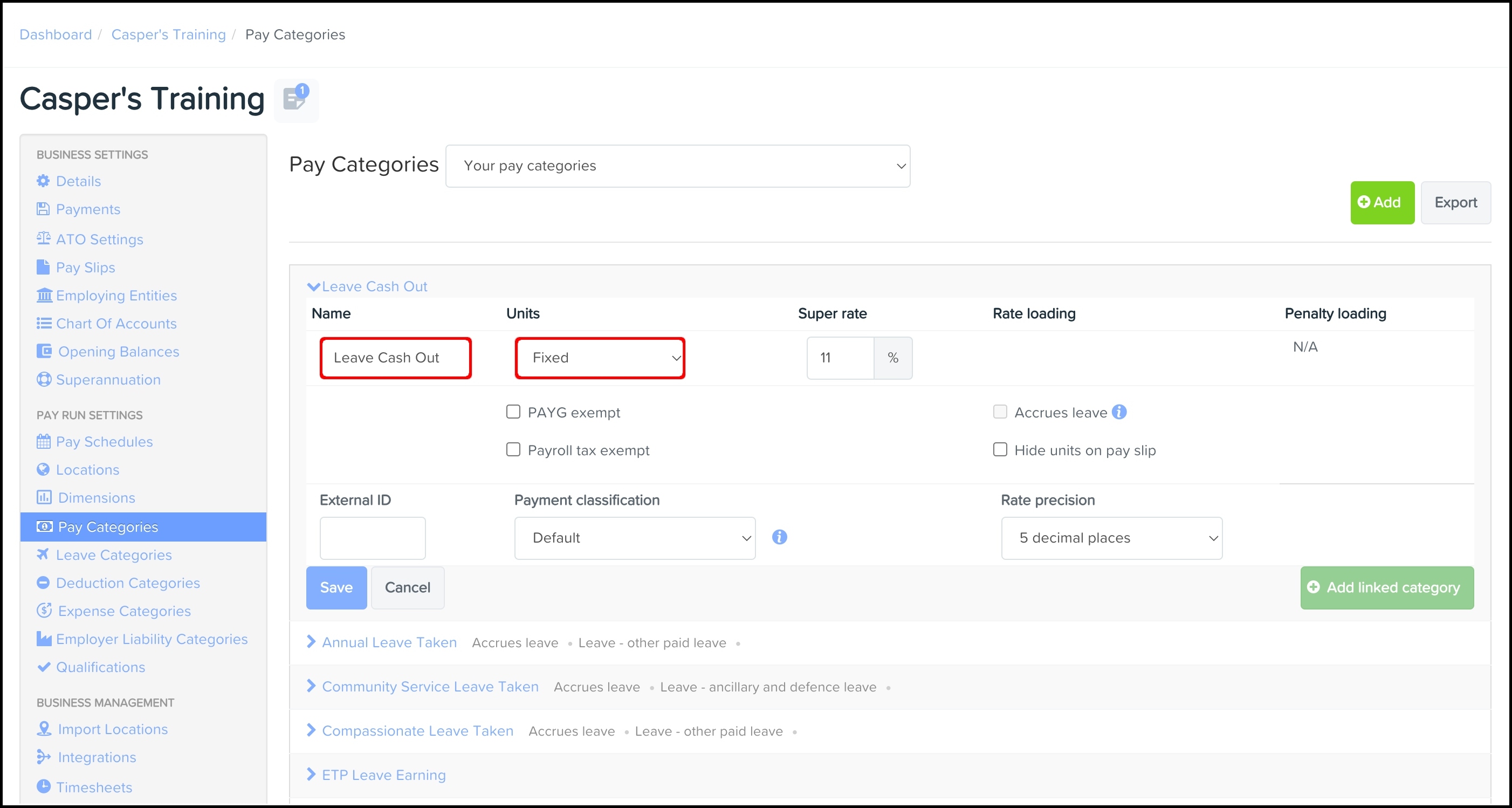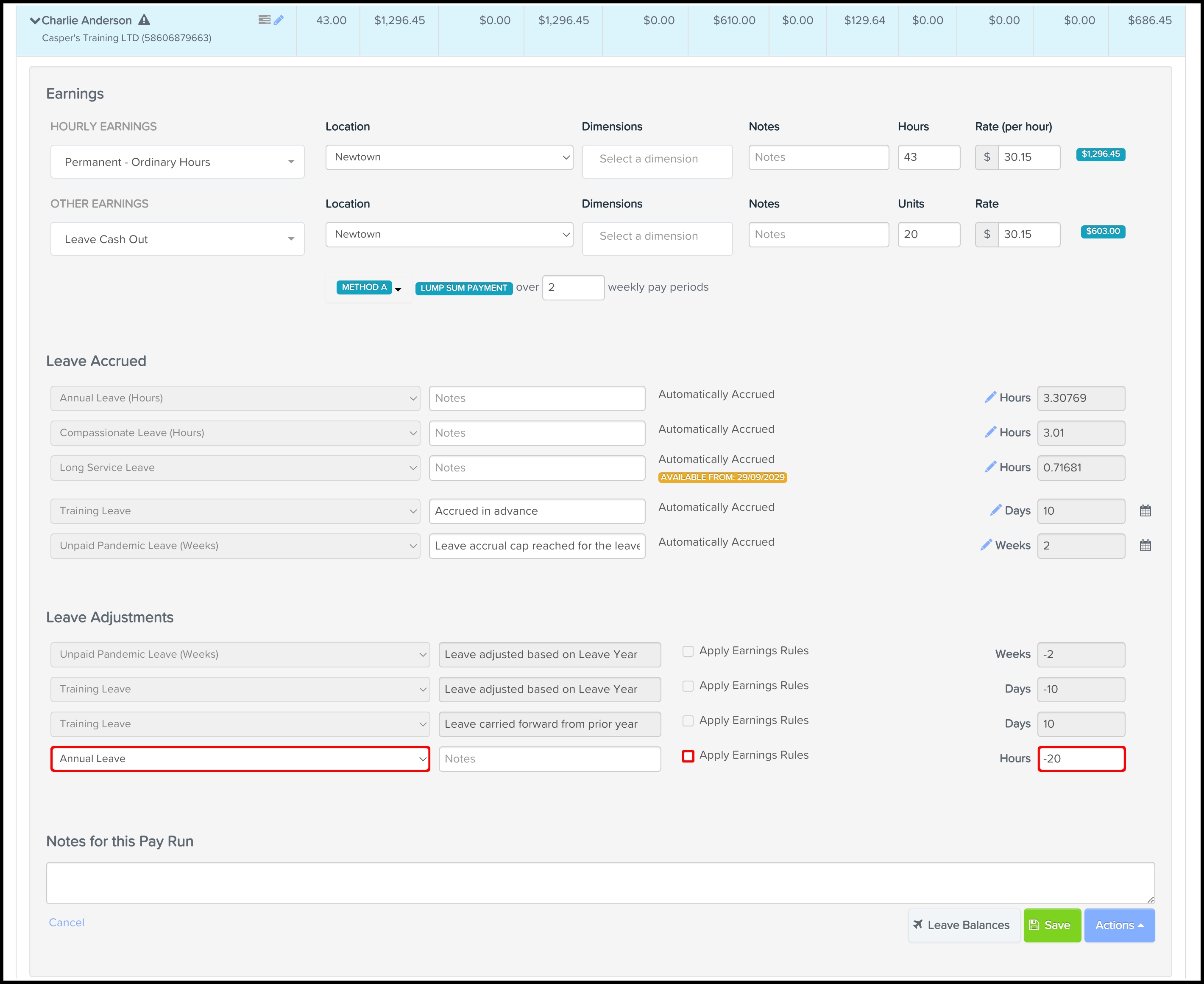 - Choose Leave Cash Out - Leave Loading as the pay category.